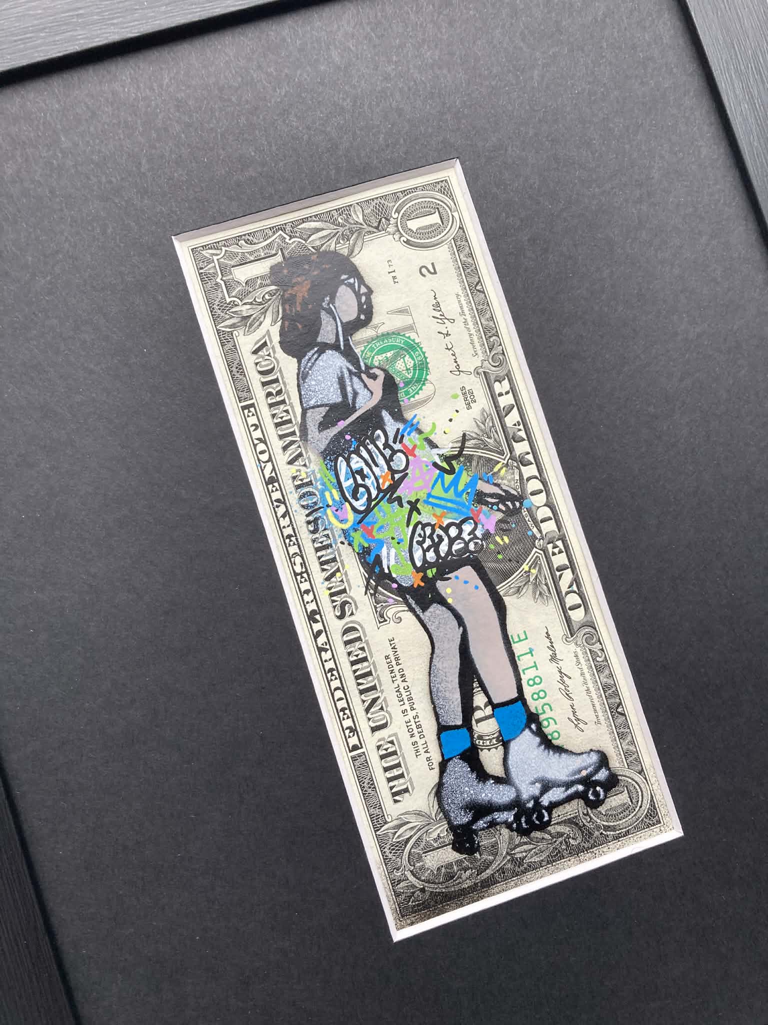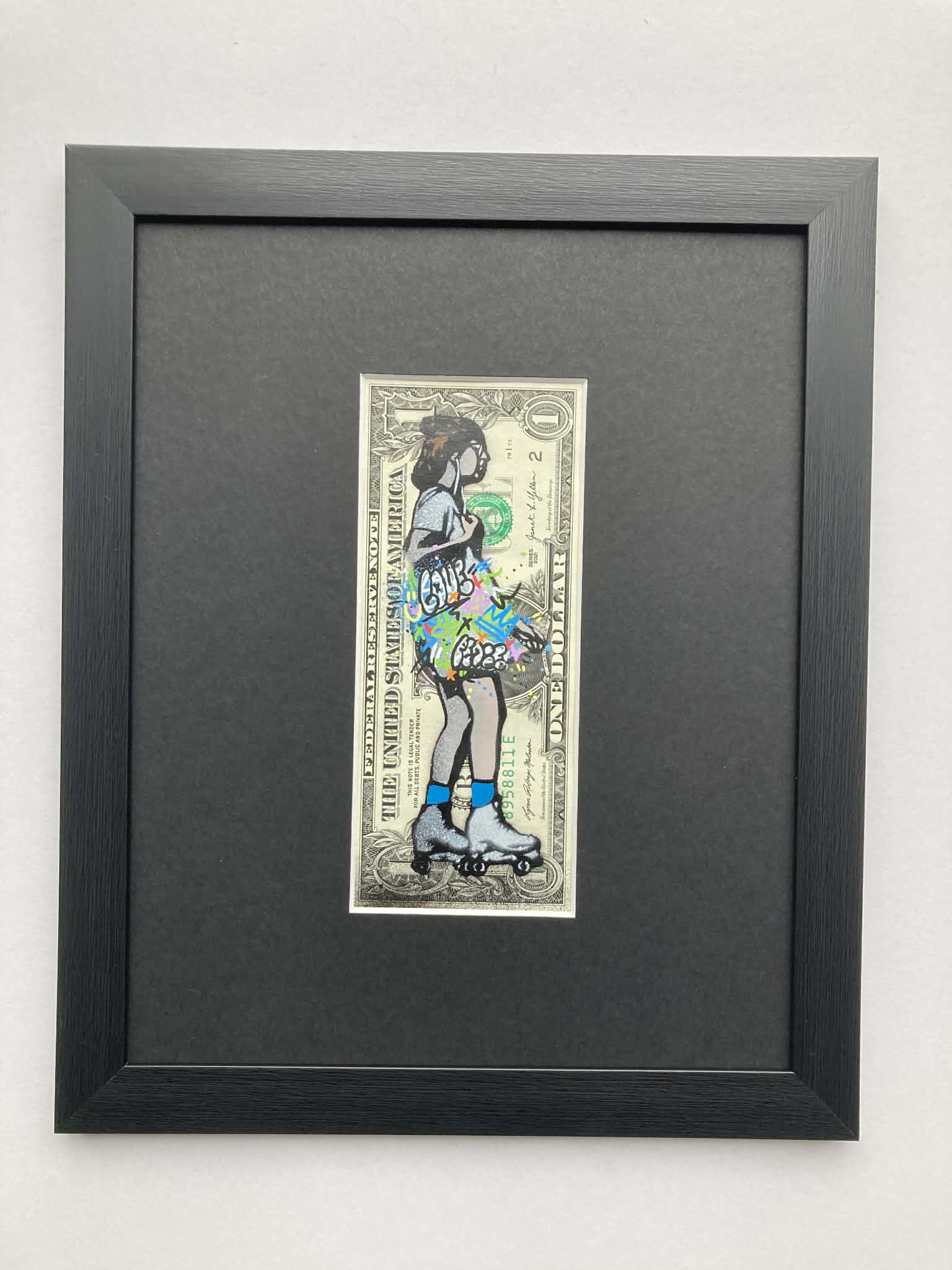 Sk8r Girl… Edition version – 5 colour spray paint and stencils with paint markers on genuine $1 bill.
