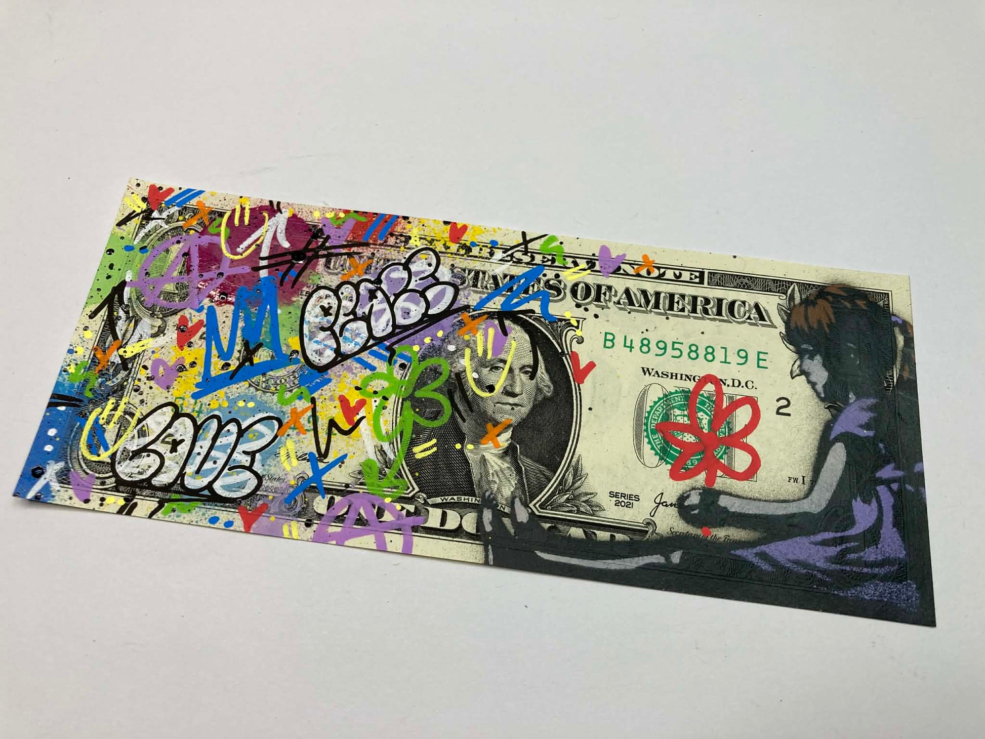 Description – 5 colour spray paint and stencils with paint markers on genuine $1 bill.