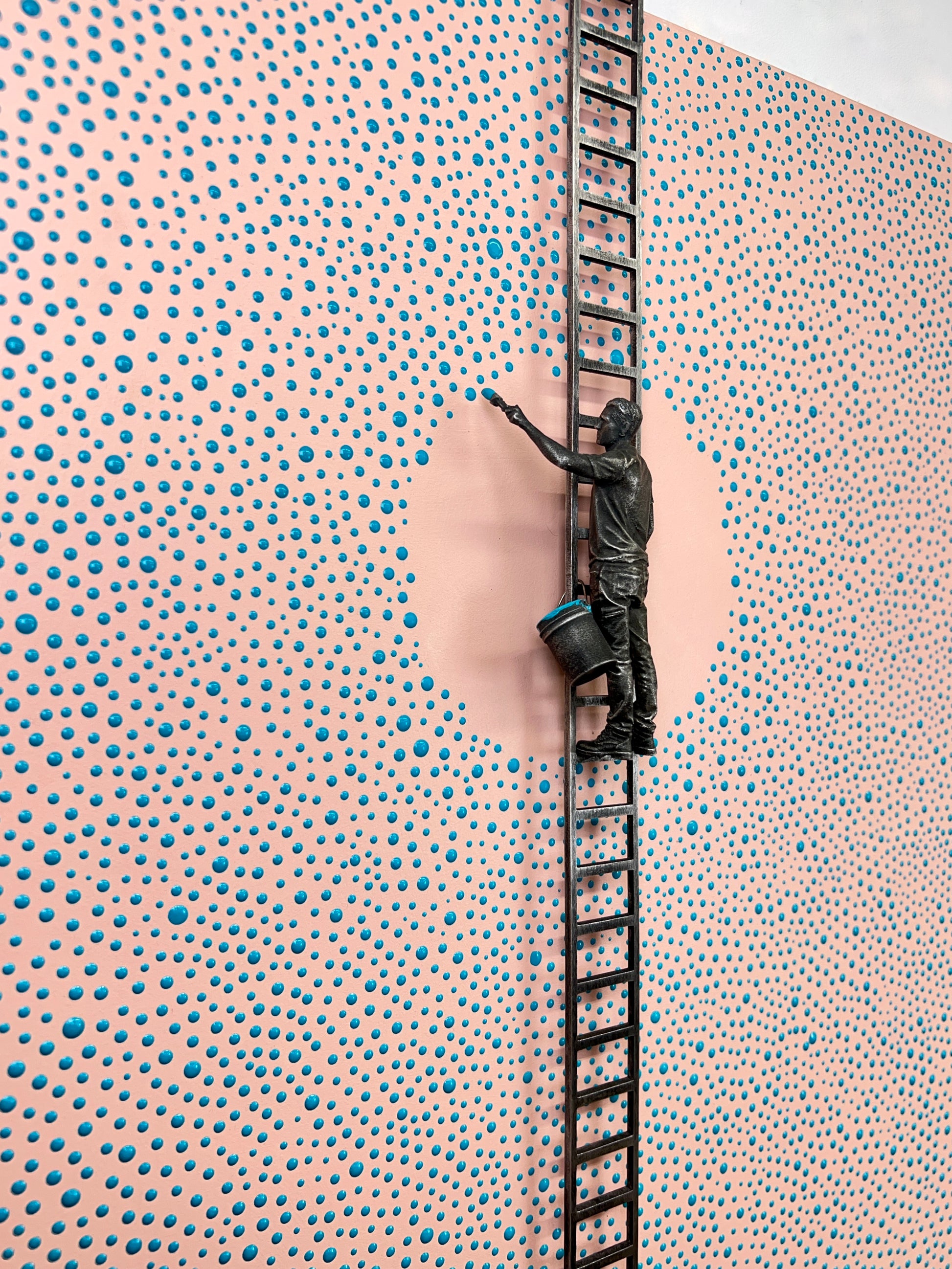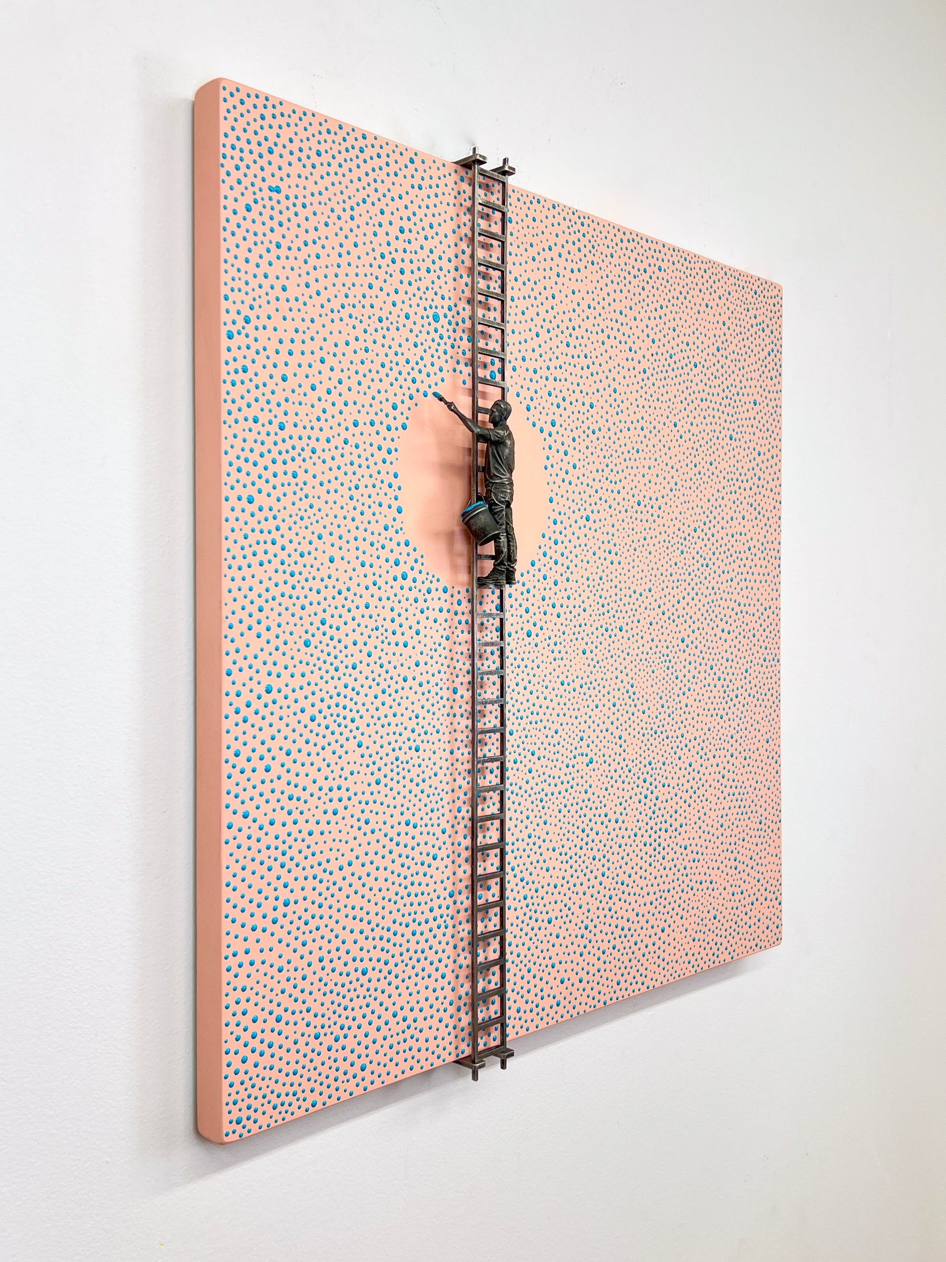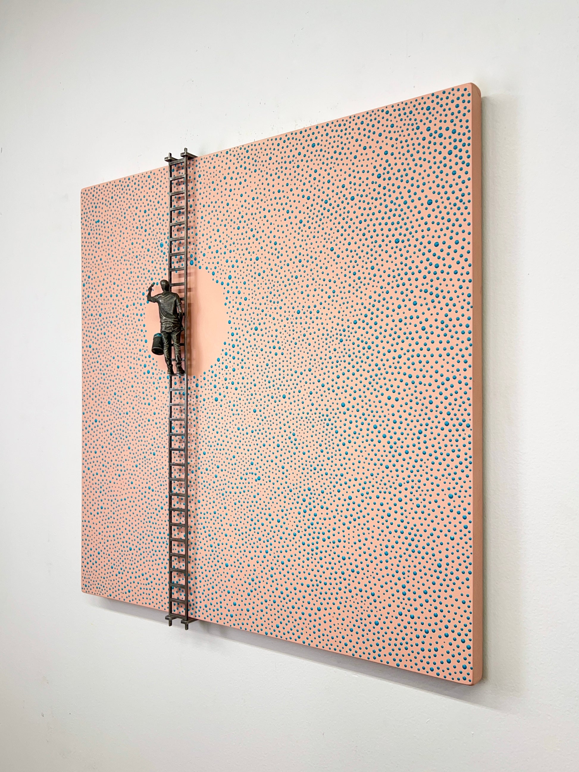 Paint on wood panel with aluminum figure and ladder