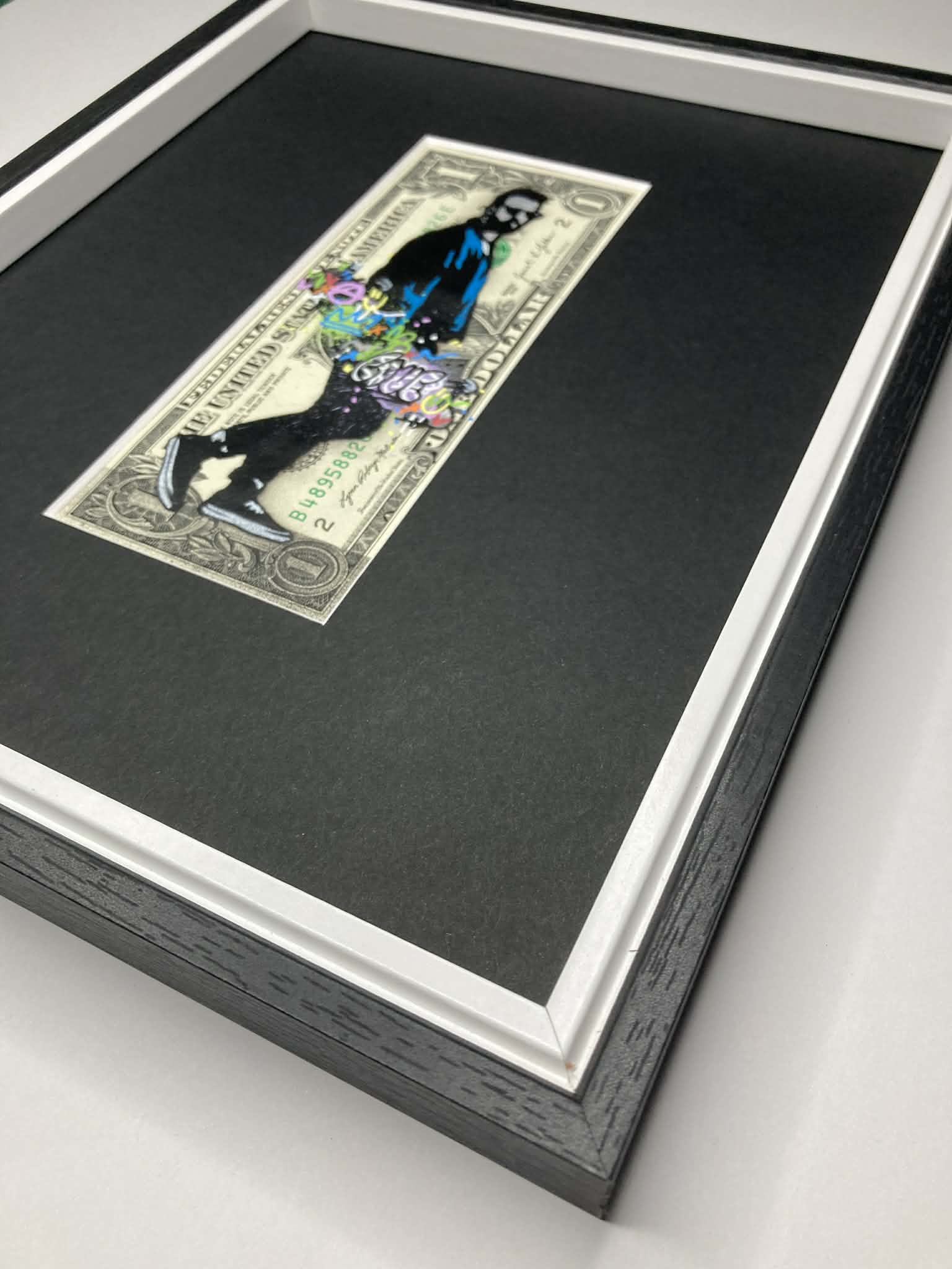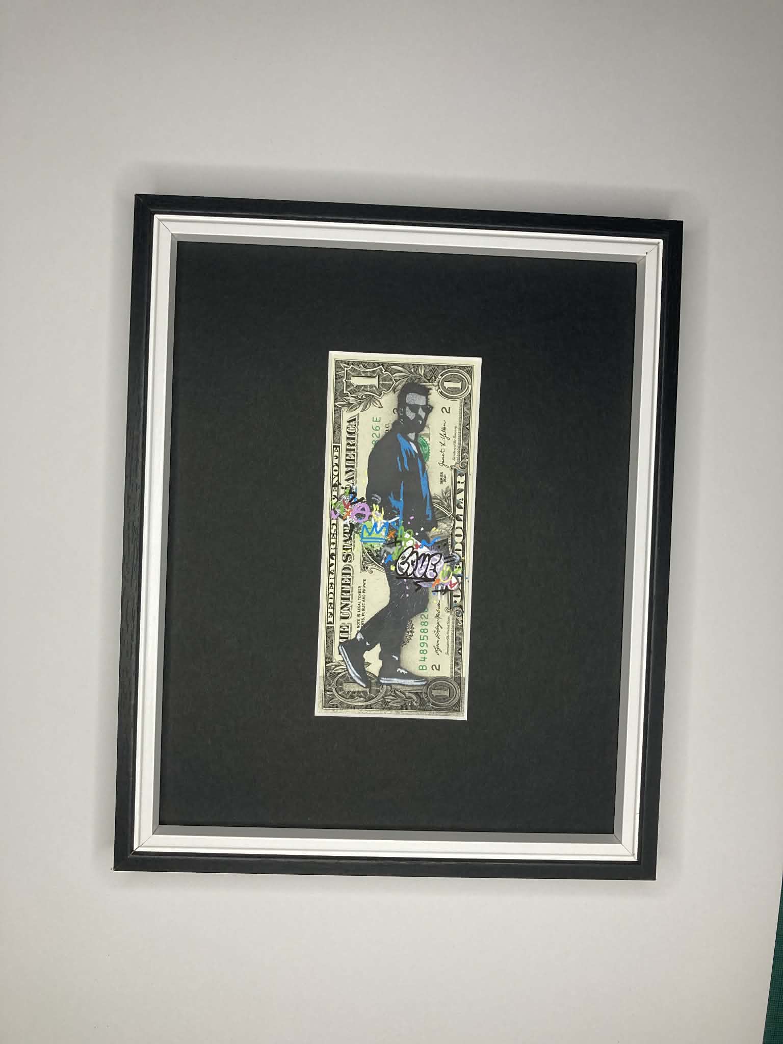 Description – 5 colour spray paint and stencils with paint markers on genuine $1 bill.