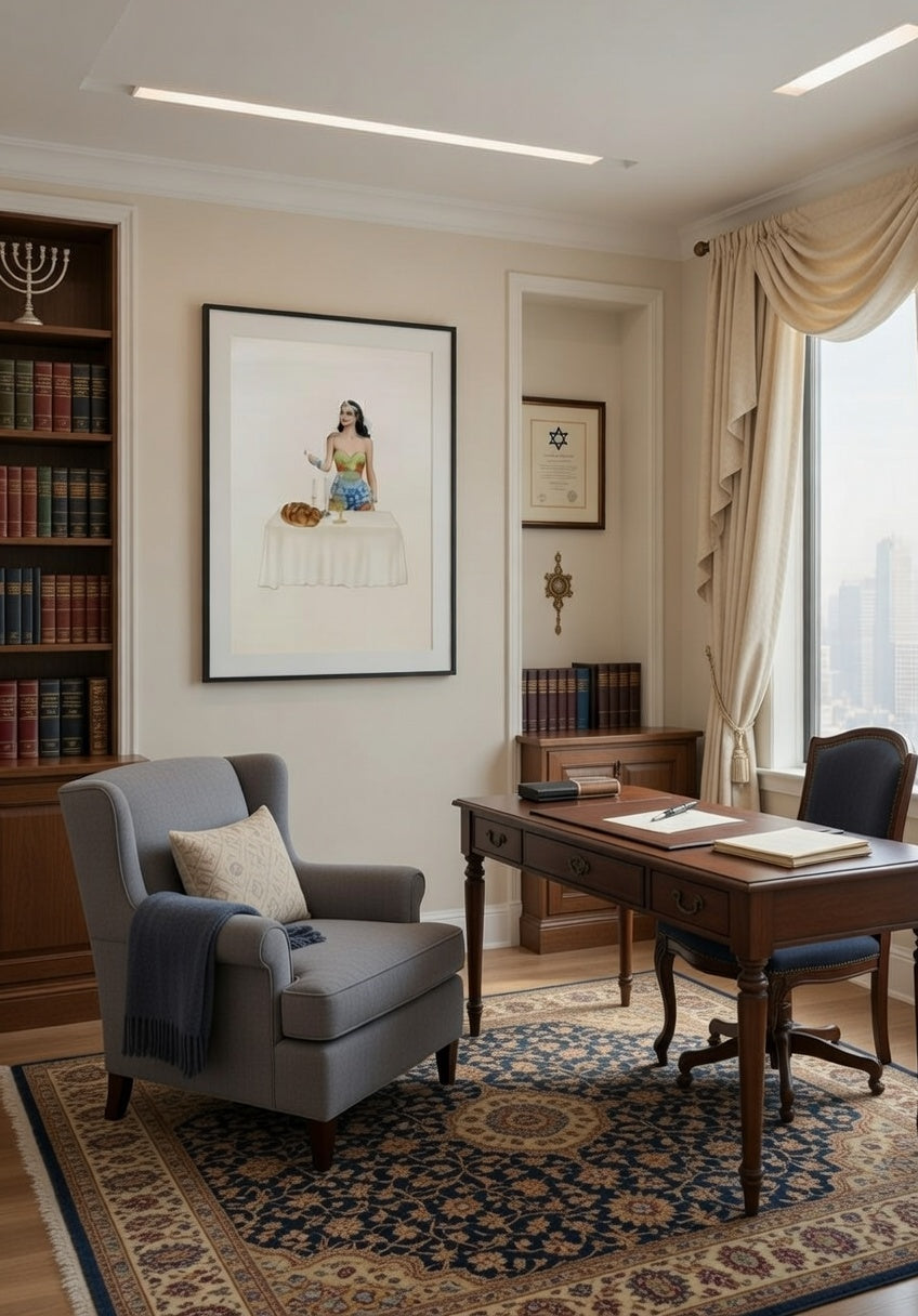 Part of Zoe Moss’ widely collected “Jew-ish” series, Jewish Wonderwoman reimagines a global superhero icon within an intimate, everyday moment—preparing for Friday night shabbat dinner.