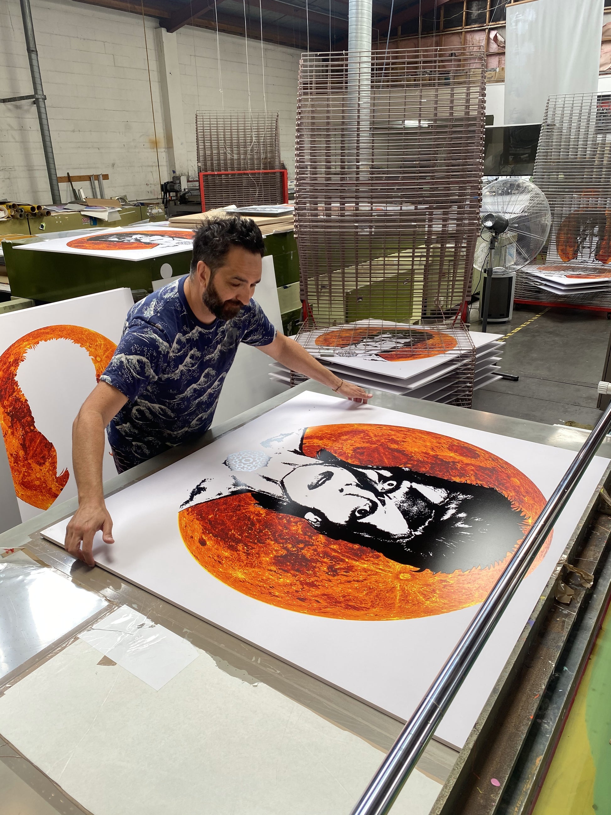 8-lags silketrykk med glanslakk på hvit serigrafplate med en diameter på 1m.