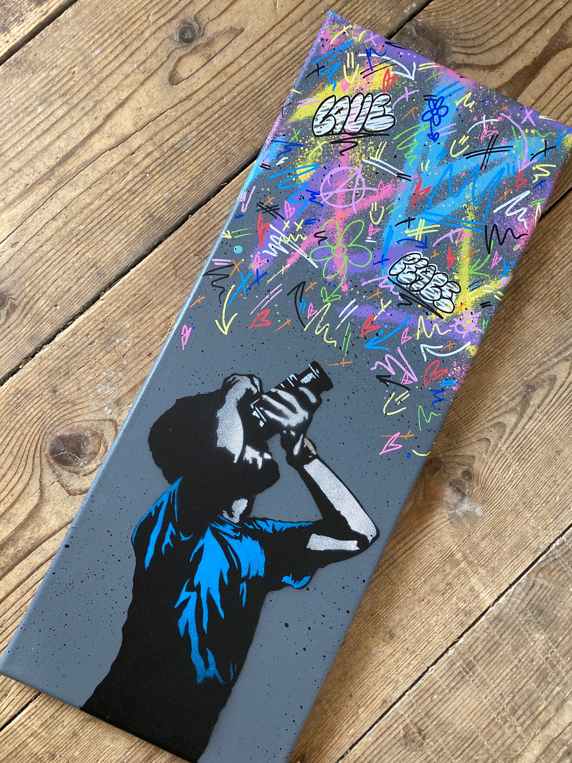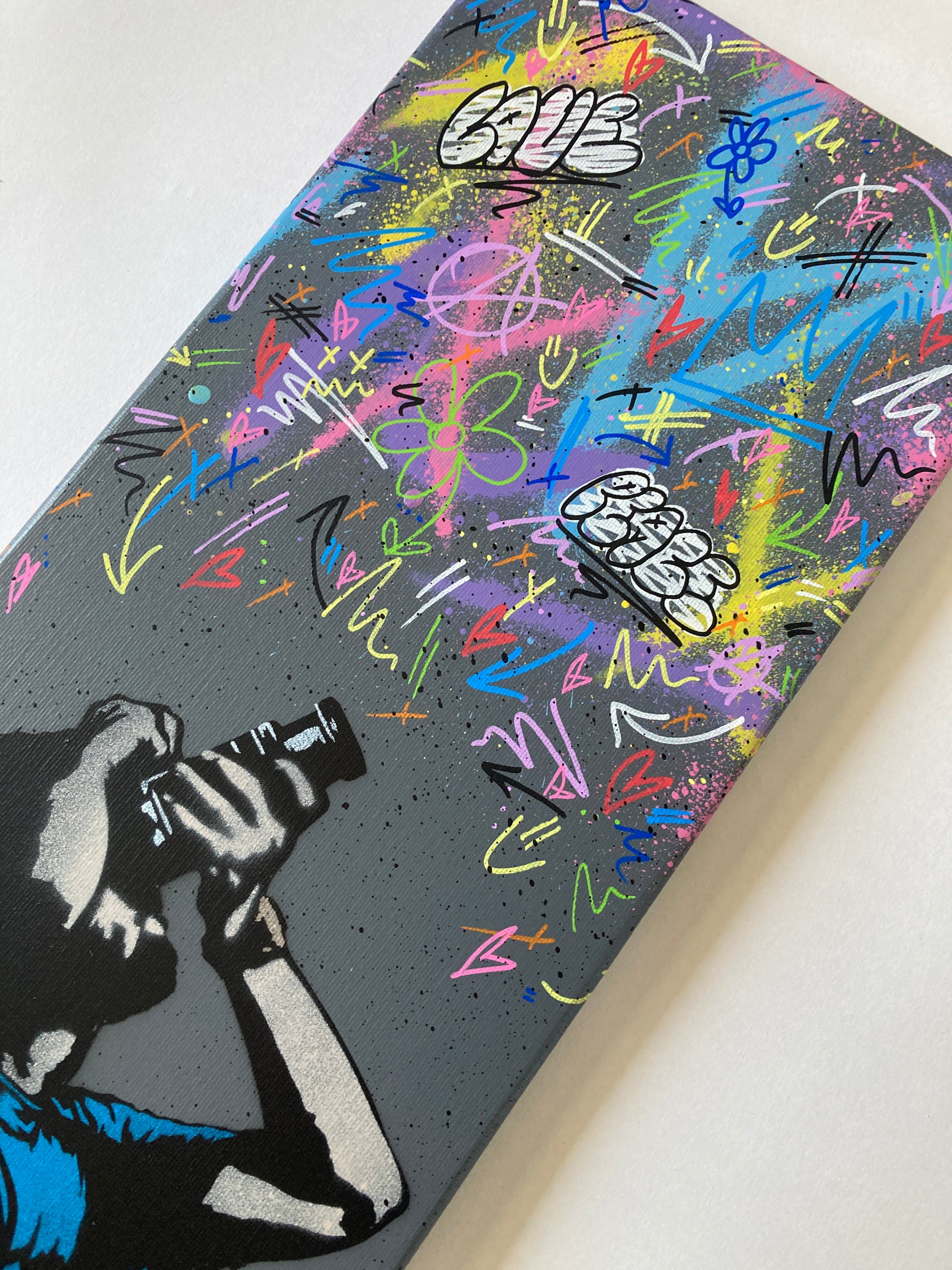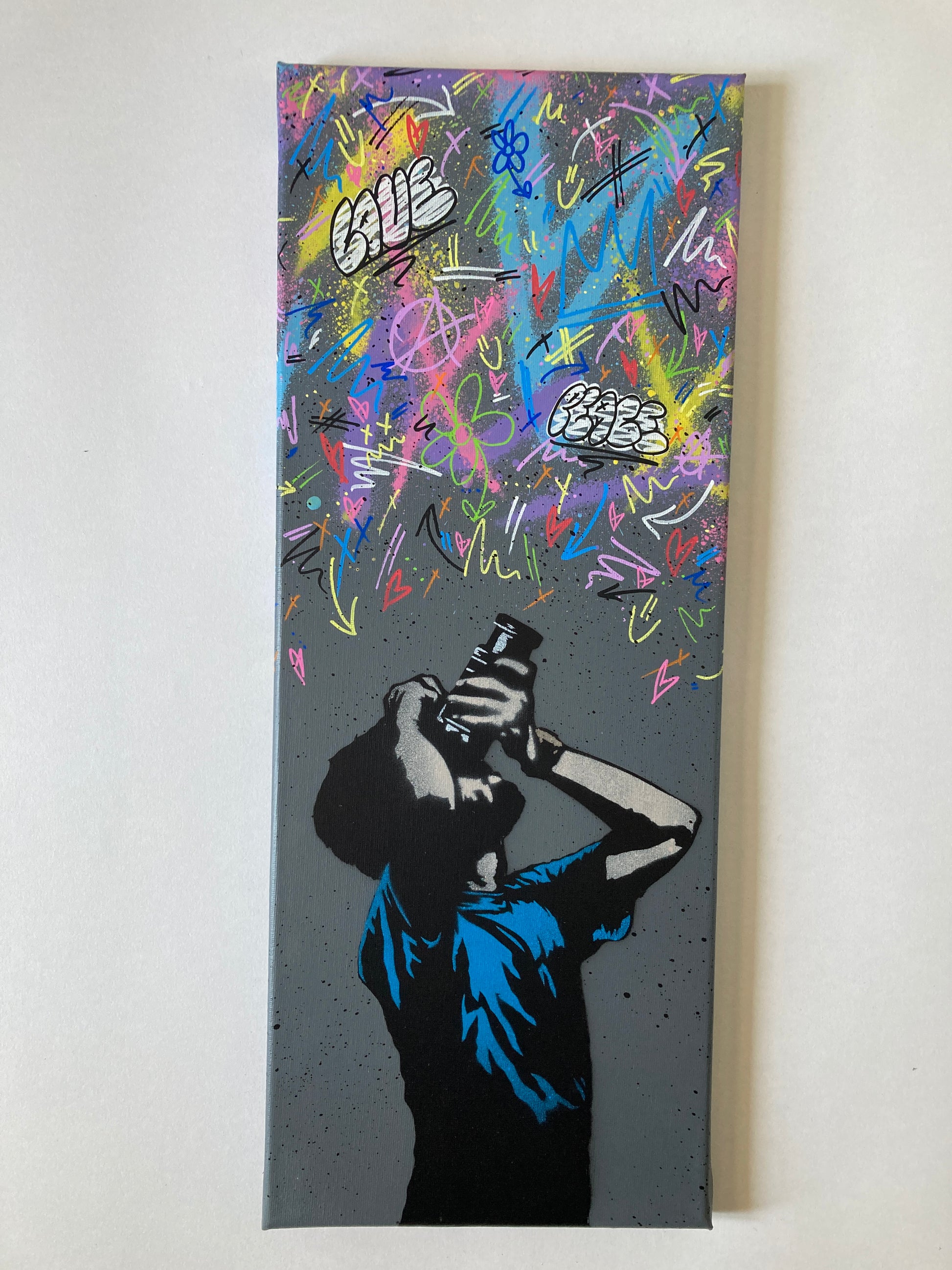 Beskrivelse – 11 farger sjablong og spraymaling på papir. Hver hånd malt med en unik splatter-virvel - Signert, datert og nummerert på baksiden. Kommer med COA.