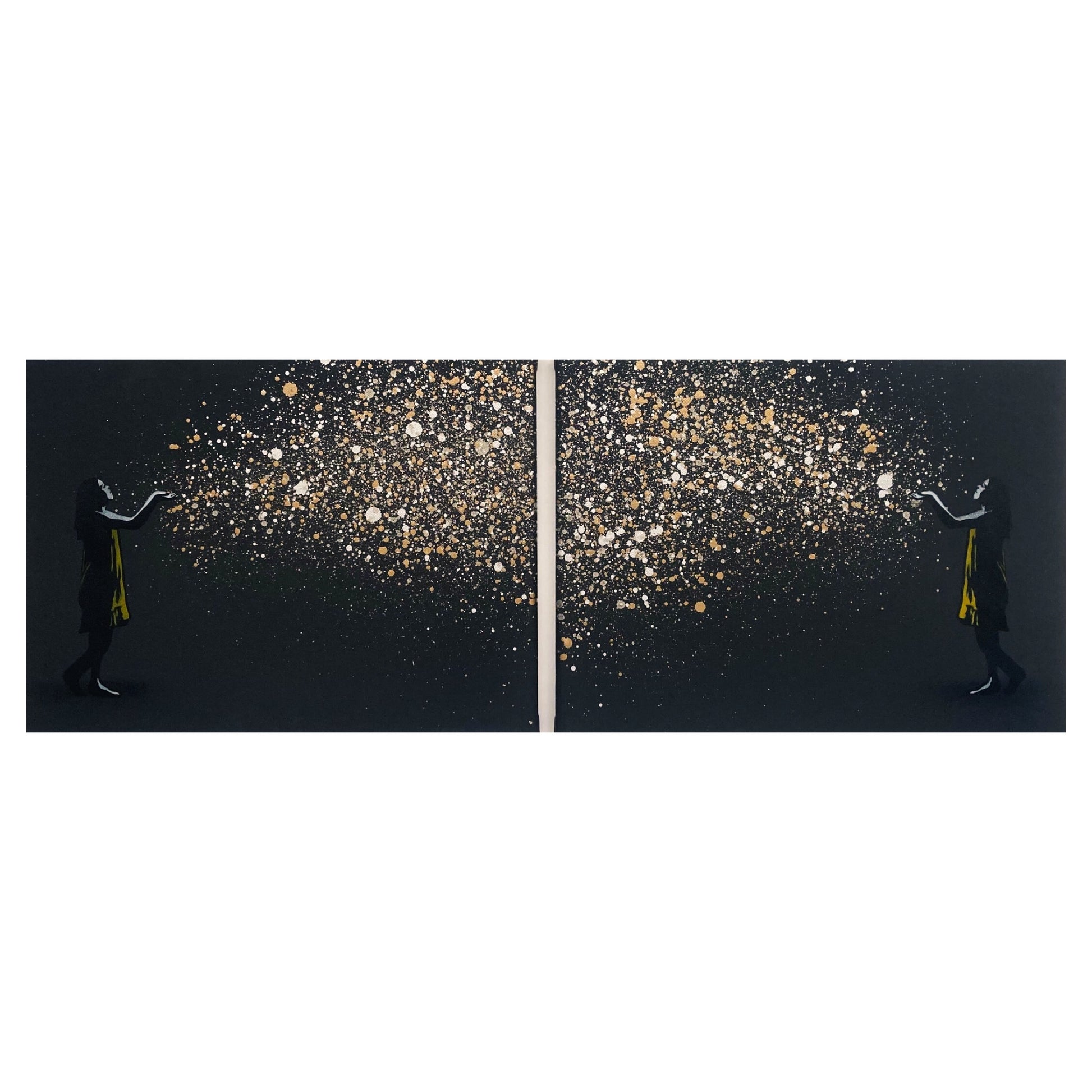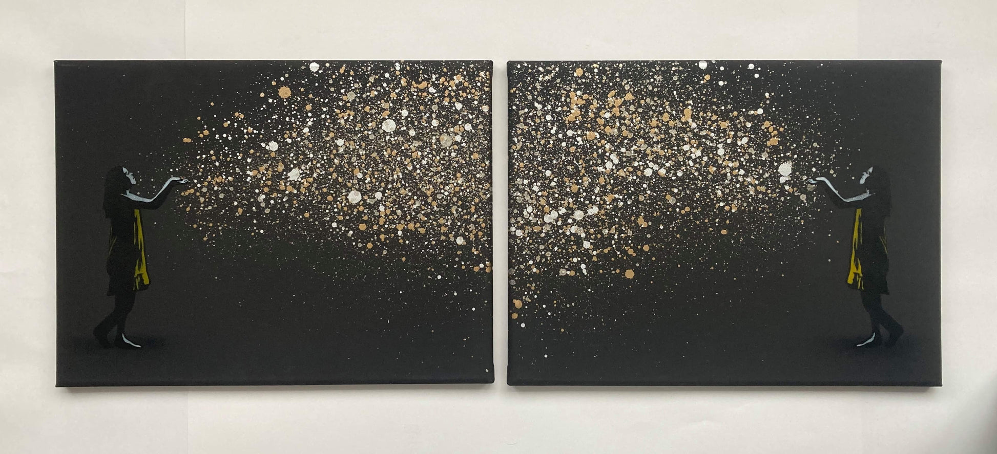 Edition farger - 7 farger sjablong og spraymaling på to lerreter med unike stjernesprut som speiler hverandre.