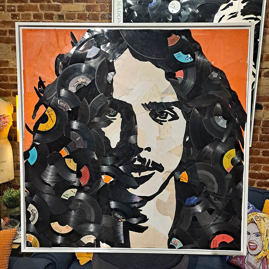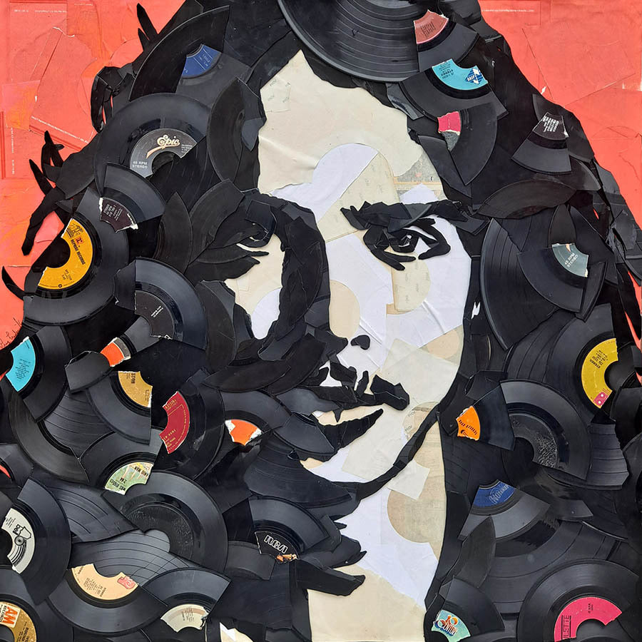 Laget av vinylplater og deres emballasje på 30x30" lerret satt i en hvit flyteramme.