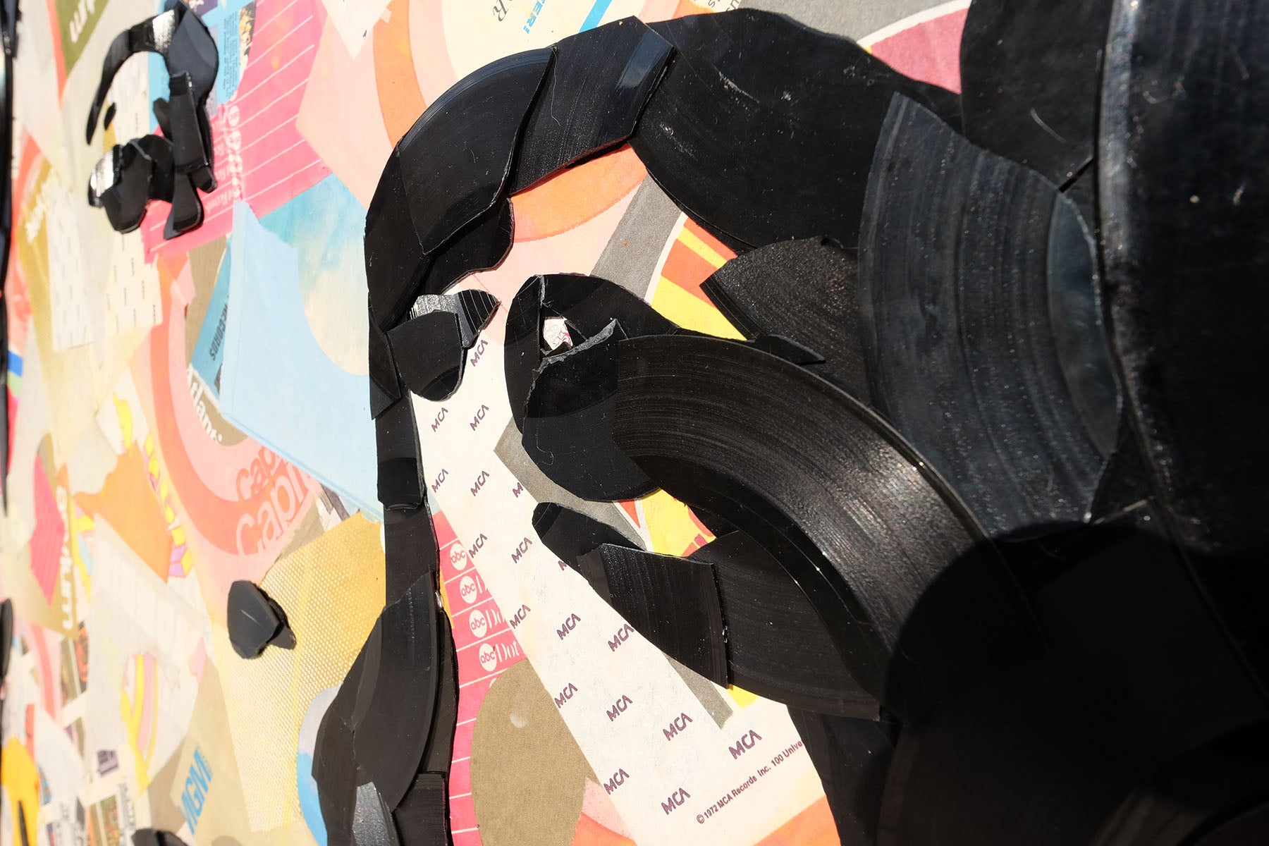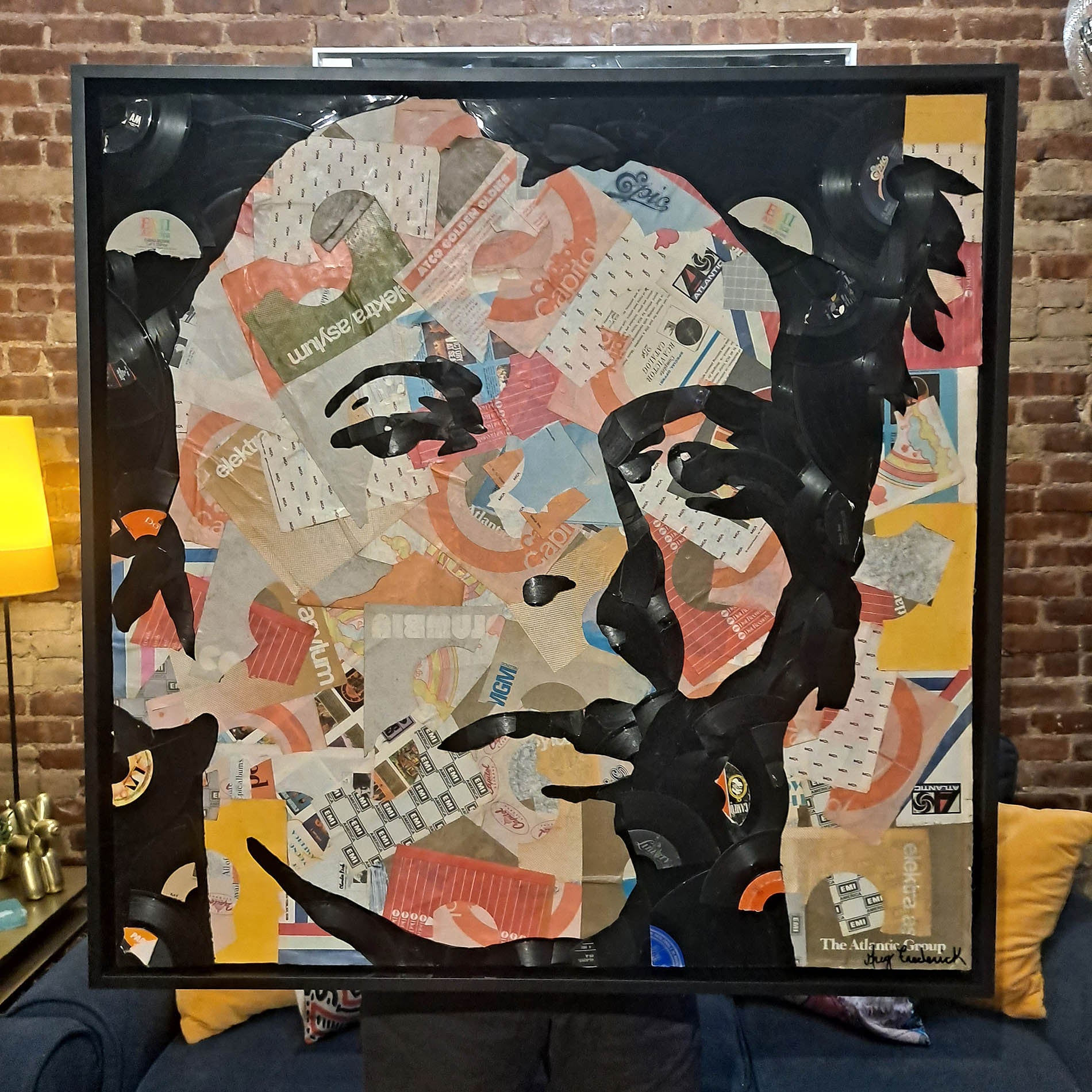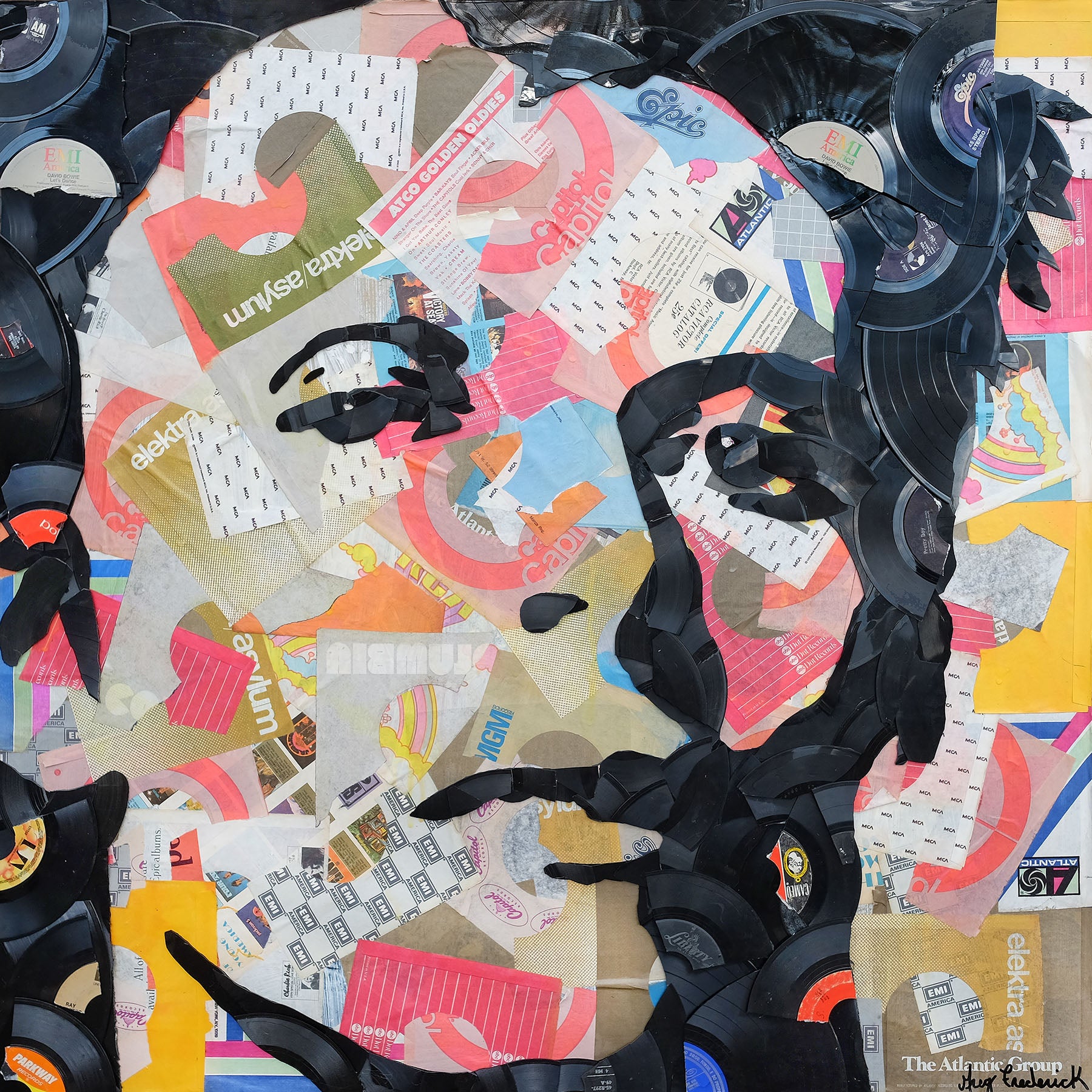 Laget av vinylplater og deres pakking på 36 x 36 lerret i en svart flyteramme.
