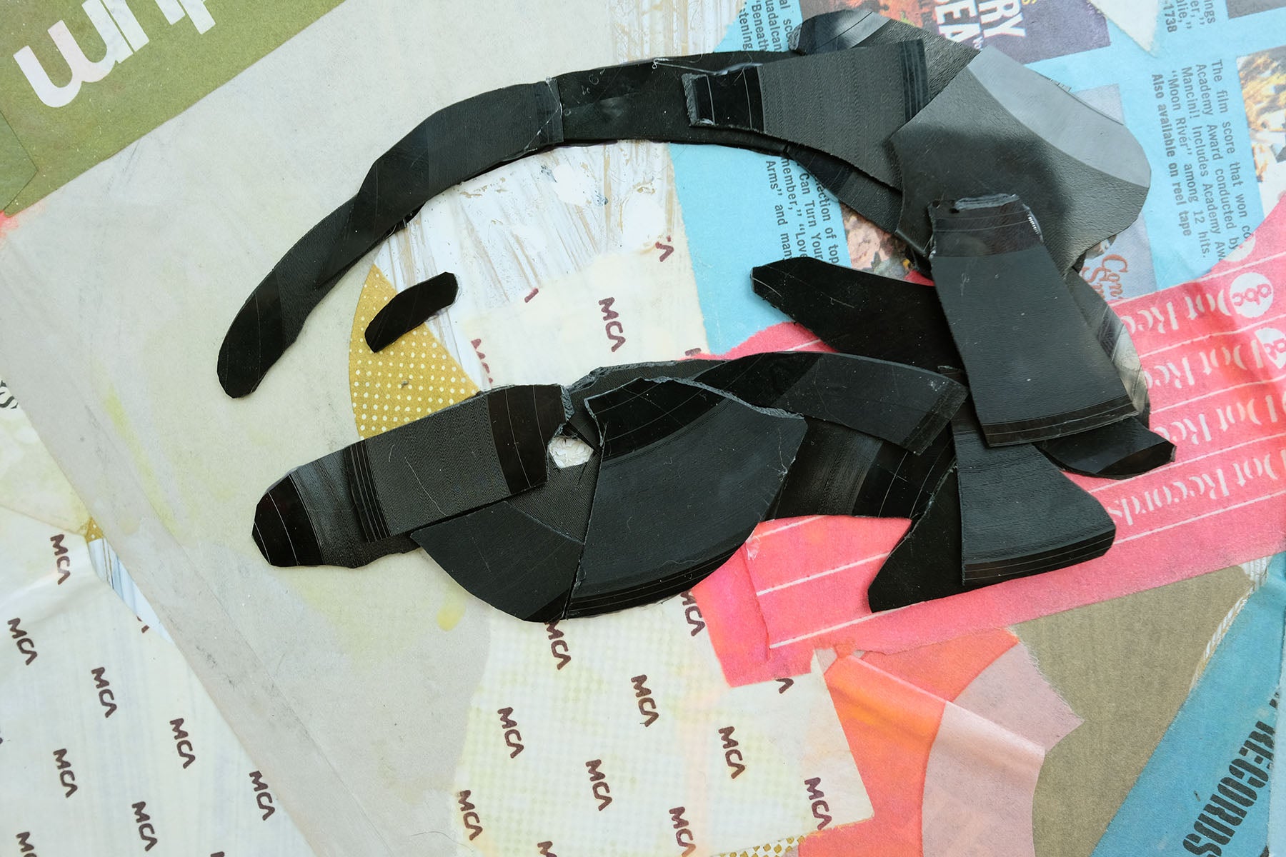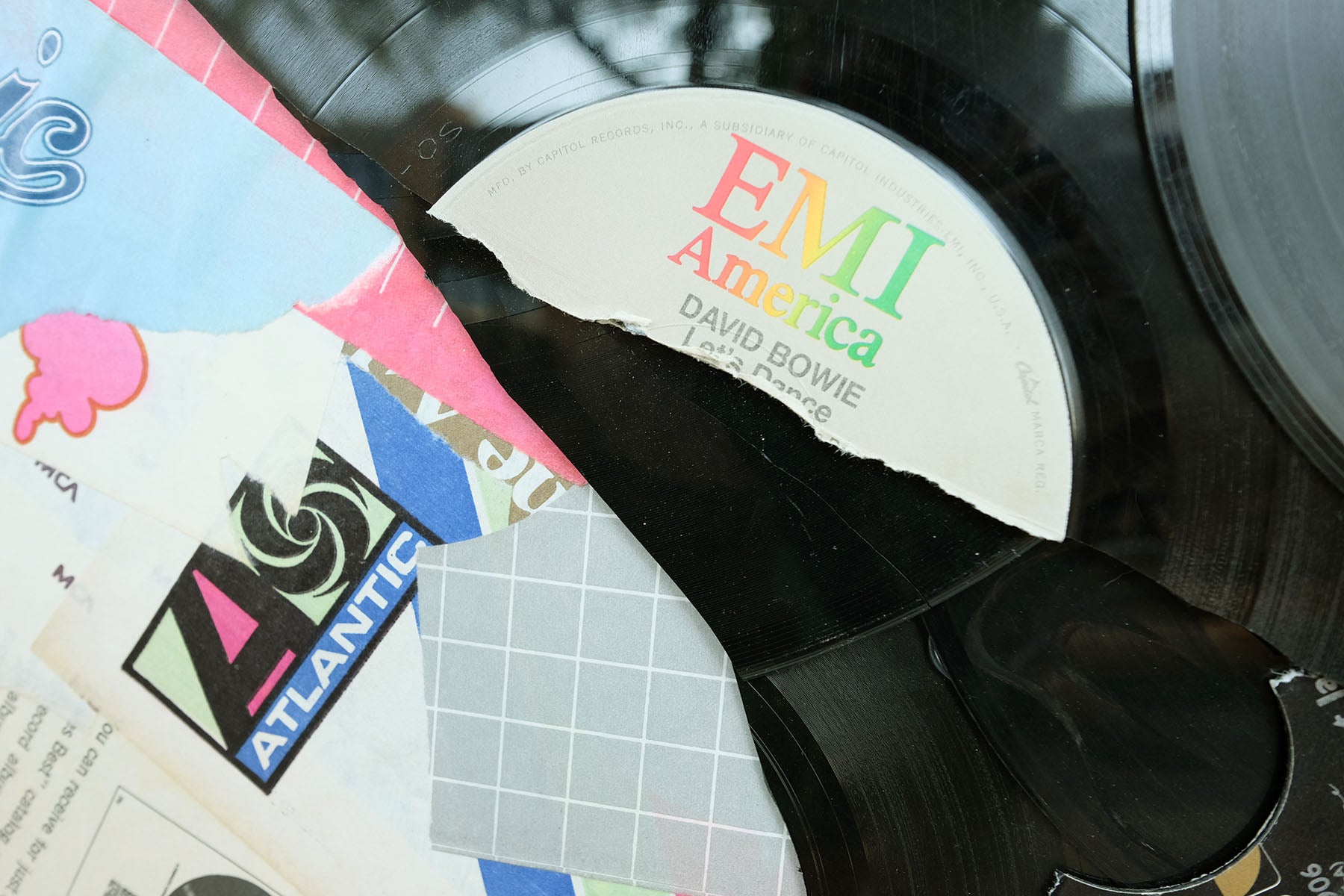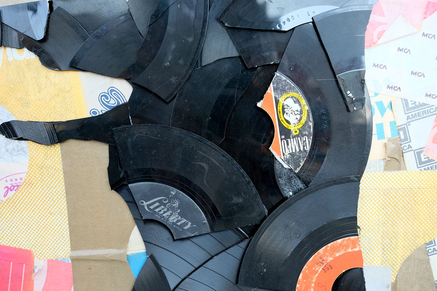 Laget av vinylplater og deres pakking på 36 x 36 lerret i en svart flyteramme.