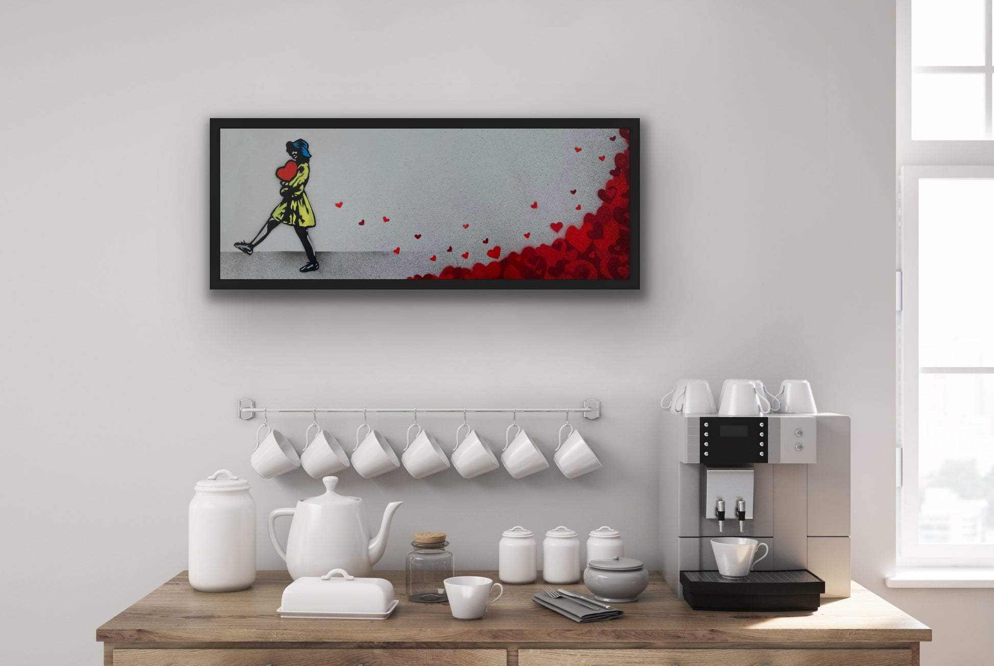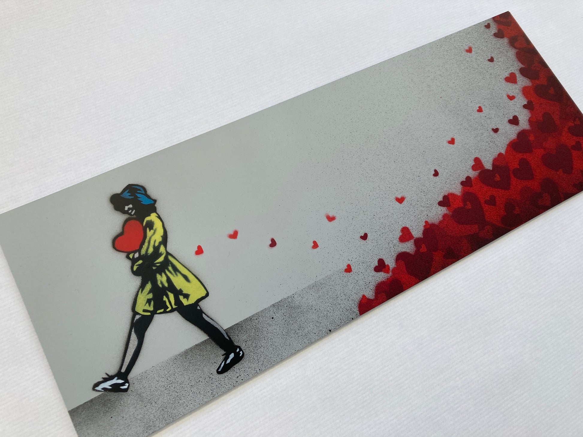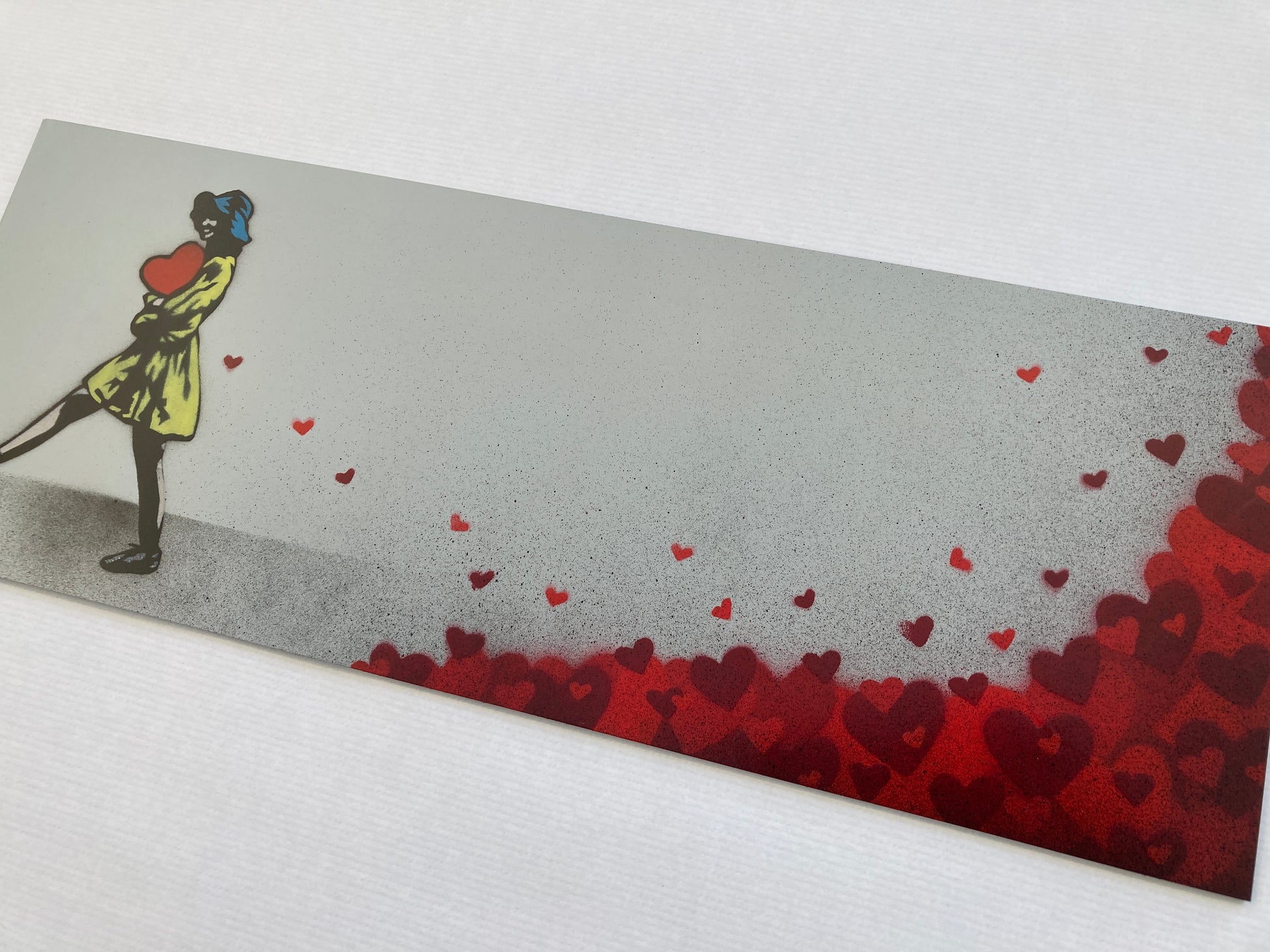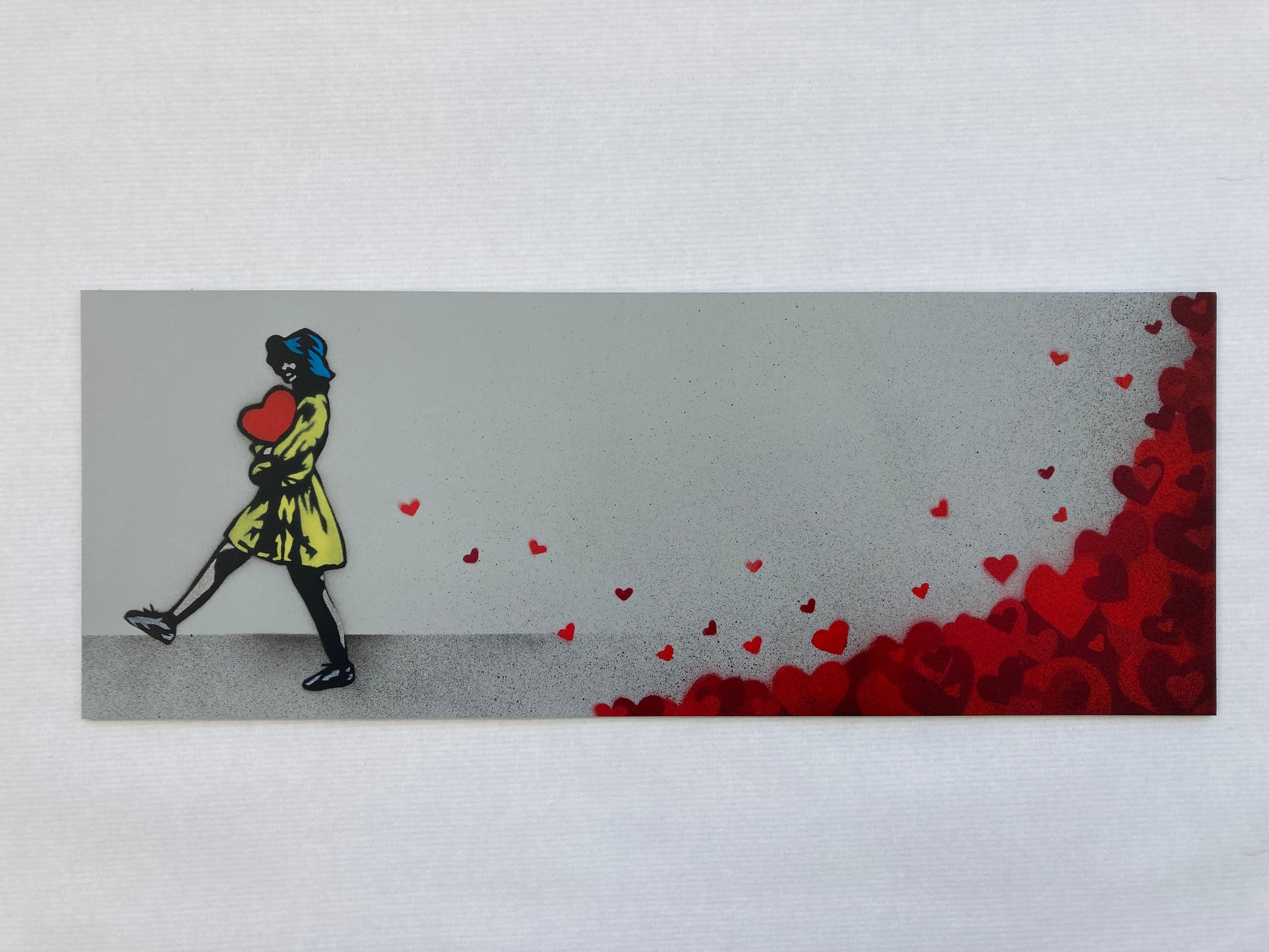 Beskrivelse- 11 farger sjablong og spraymaling på poli-kjerne metallplate. Håndmalt hver med unike hjerteplasseringer. Håndsignert, datert og nummerert på baksiden. Kommer med COA.