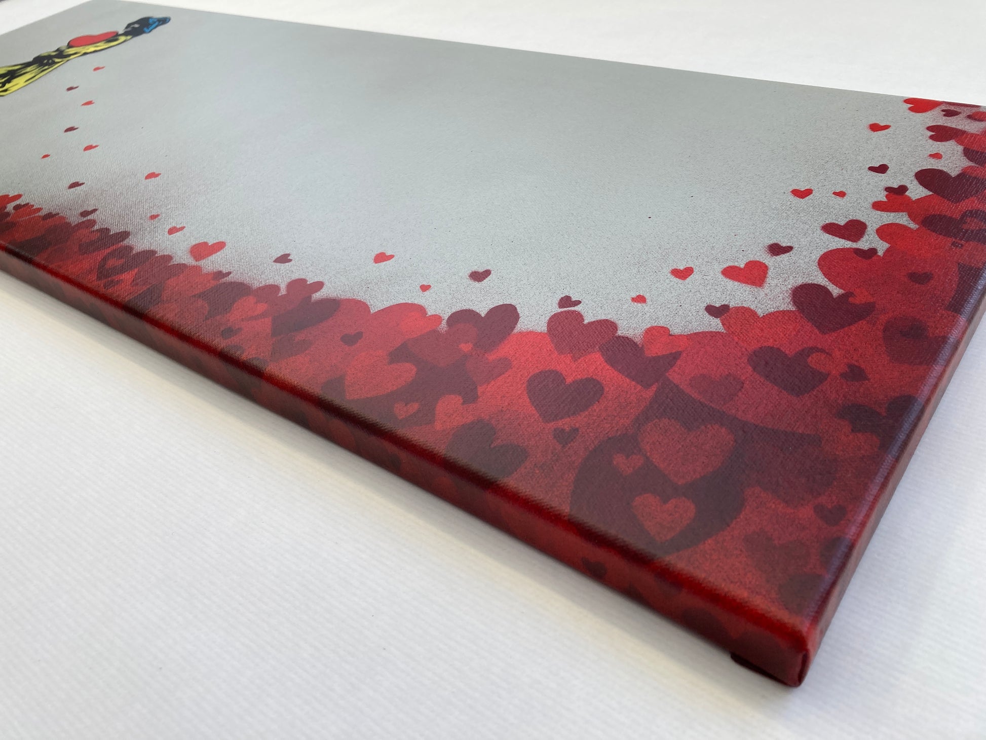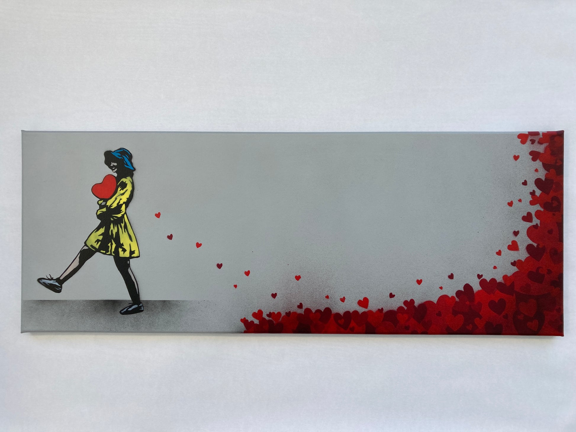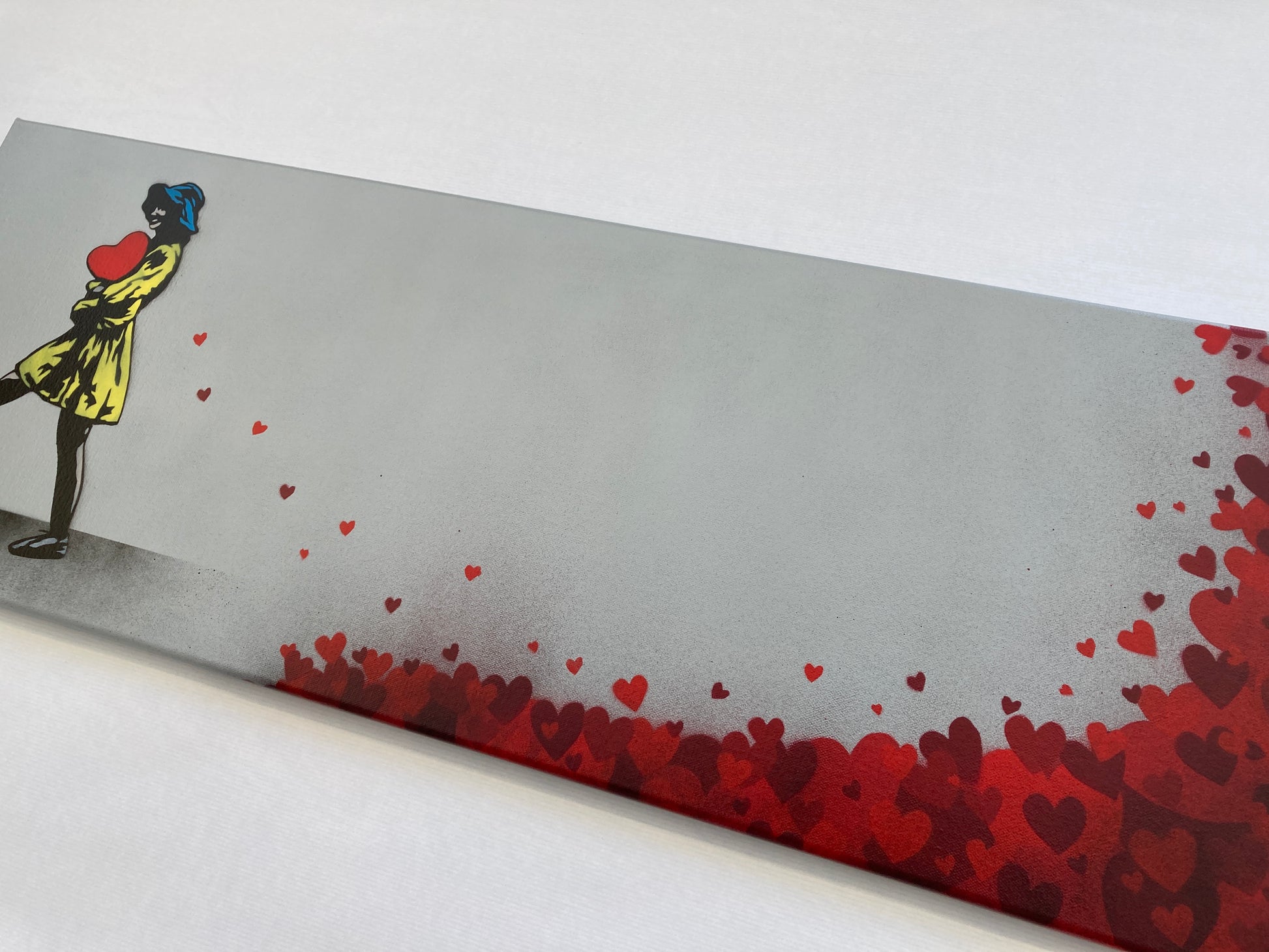 Beskrivelse- 11 farger sjablong og spraymaling på lerret. Håndmalt med unike hjerteplasseringer. Håndsignert, datert og nummerert på baksiden. Kommer med COA.