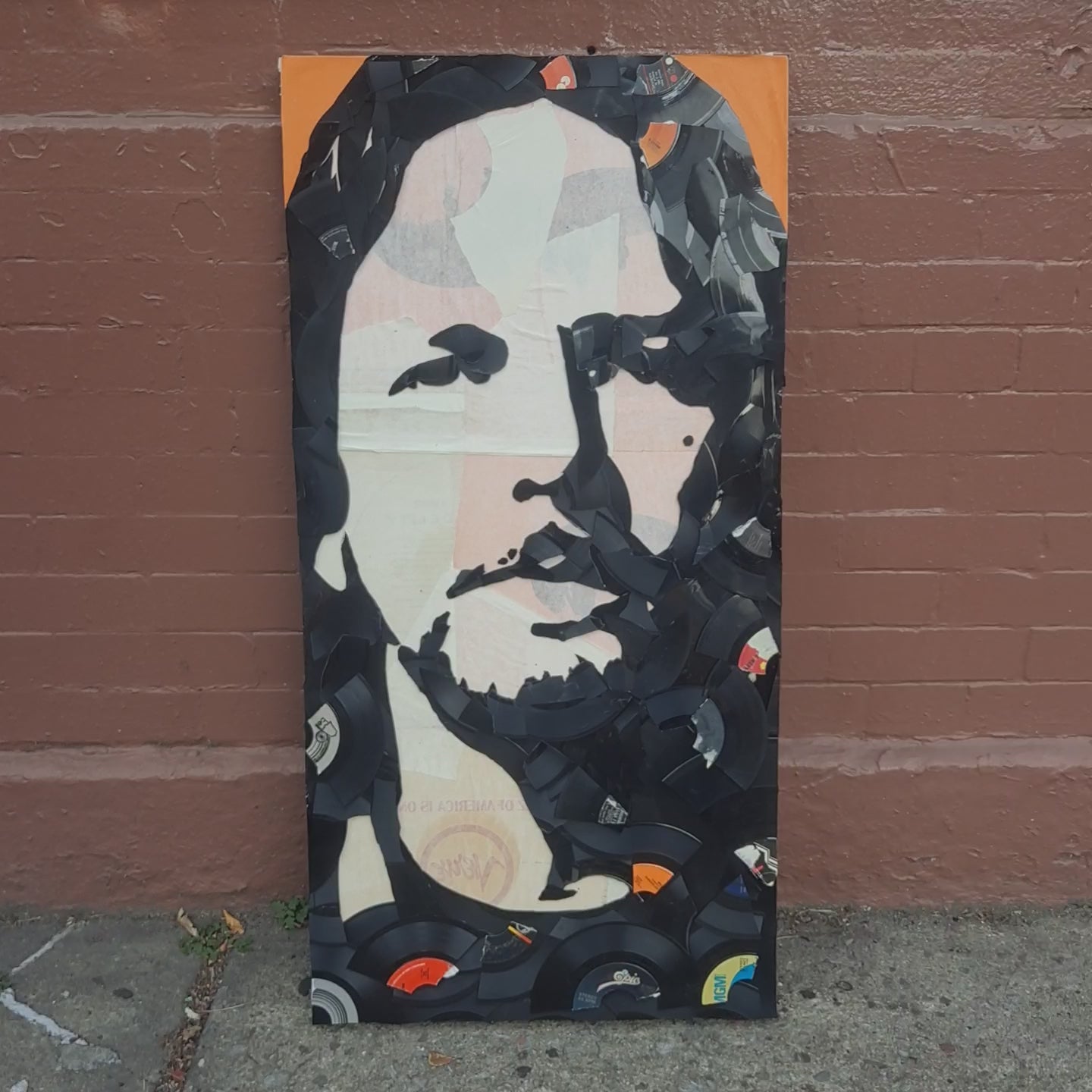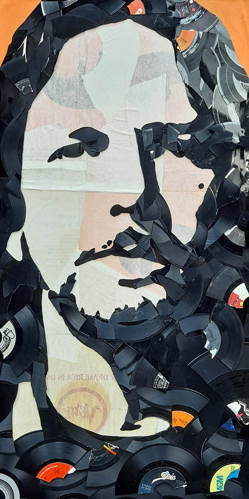 Laget av vinylplater og deres pakking på 36 x 36 lerret i en svart flyteramme.
