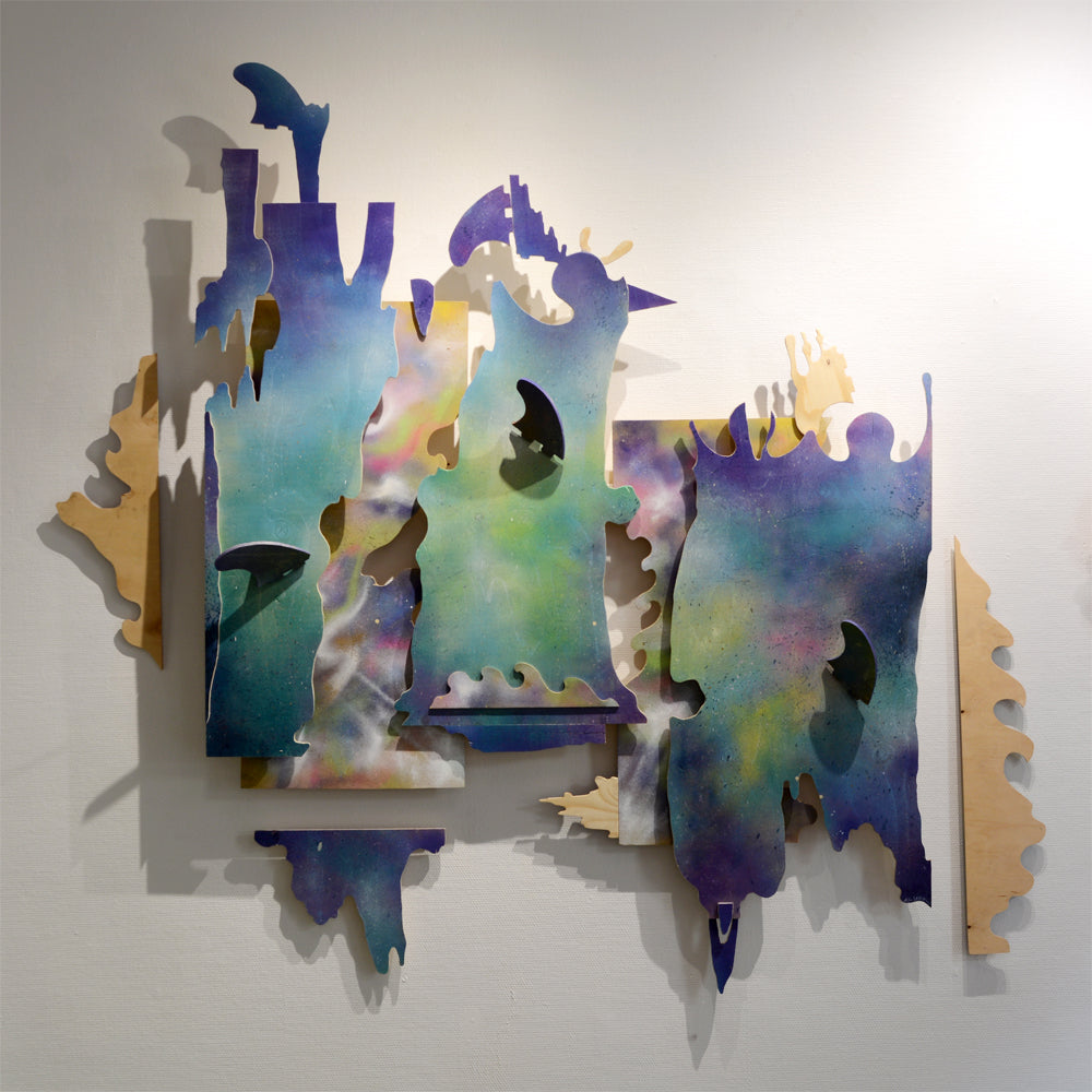 Gjennomhullede spraybokser på kryssfinerplater, håndkuttet, satt sammen i lag, og avsluttet med spray og lakk.