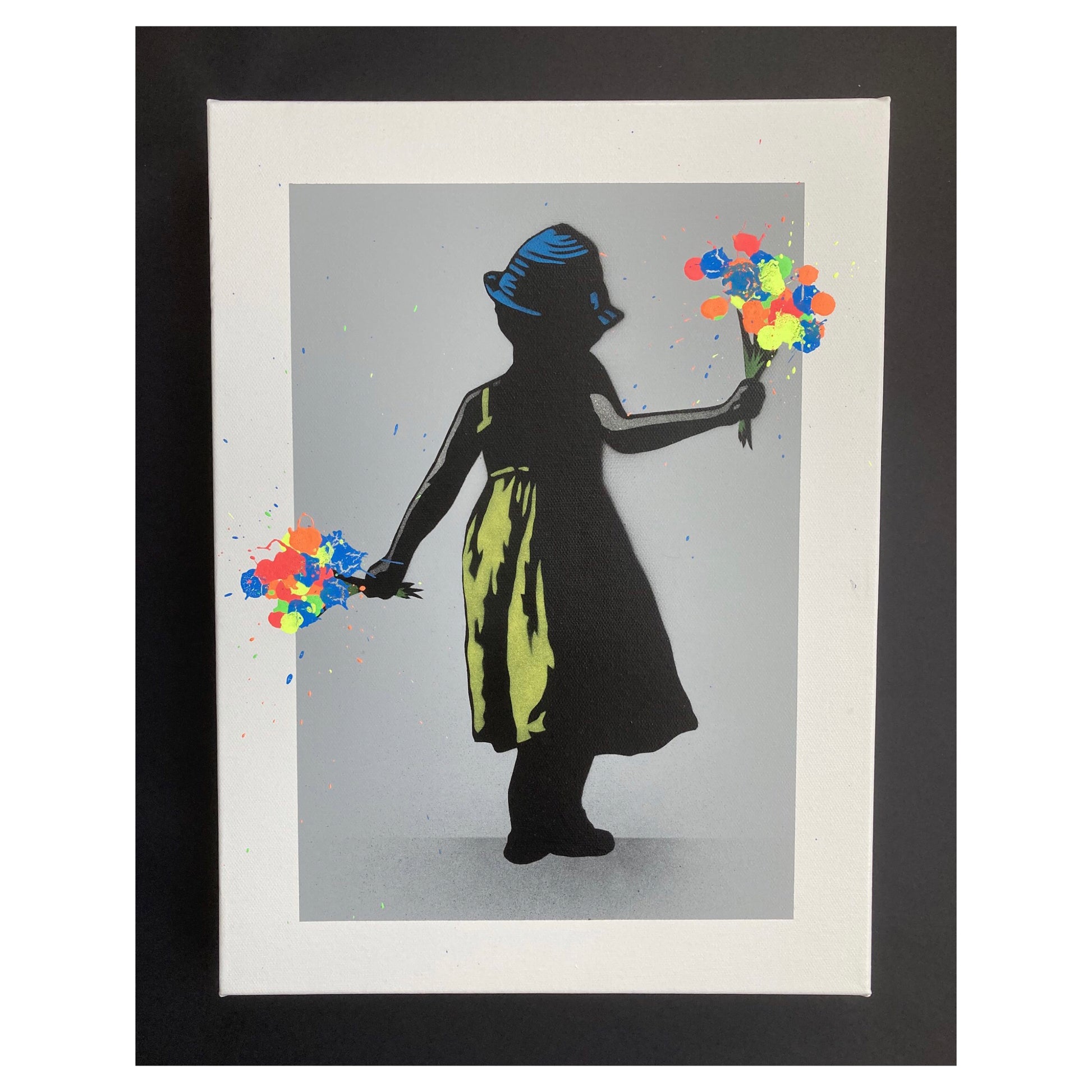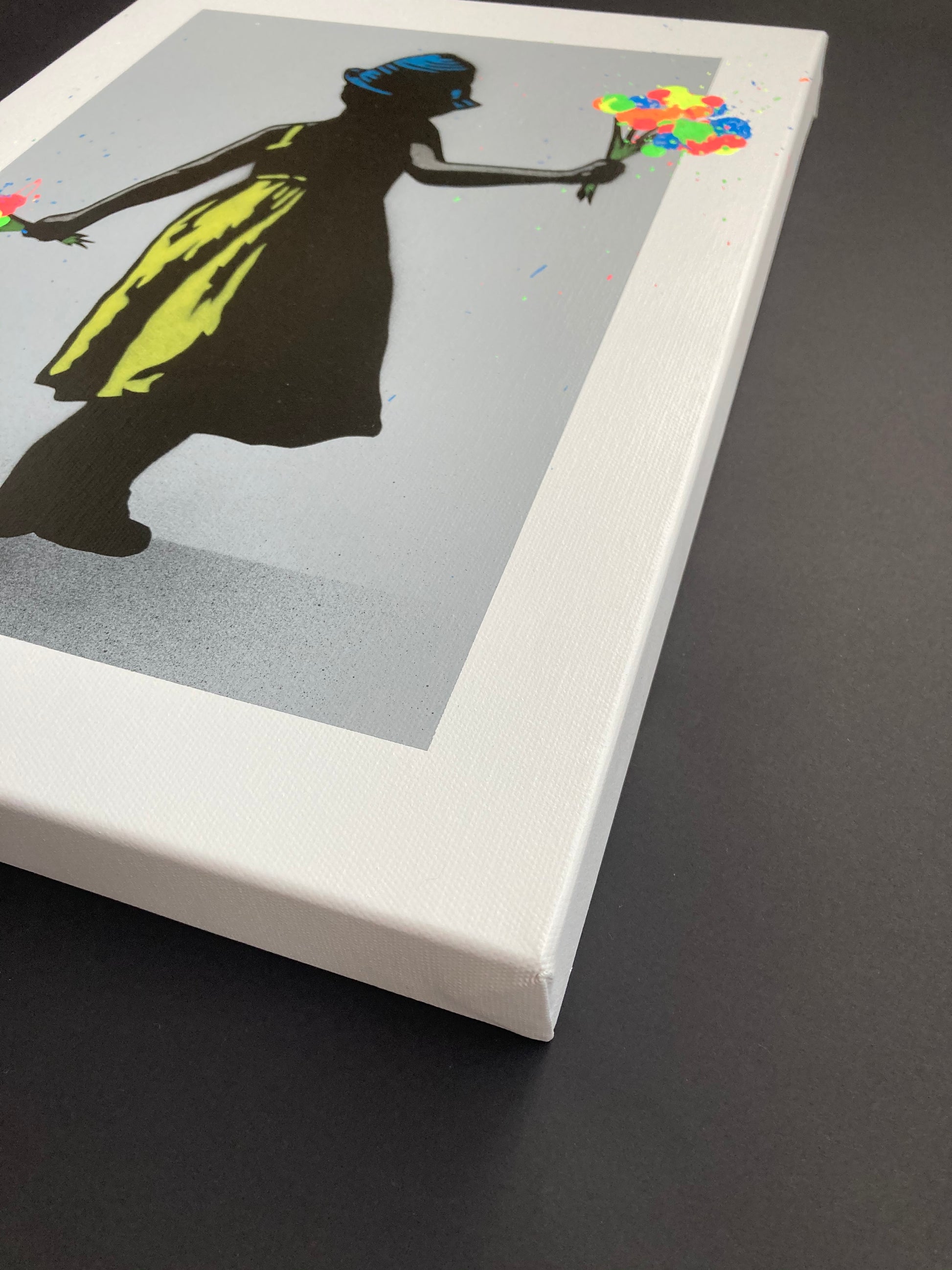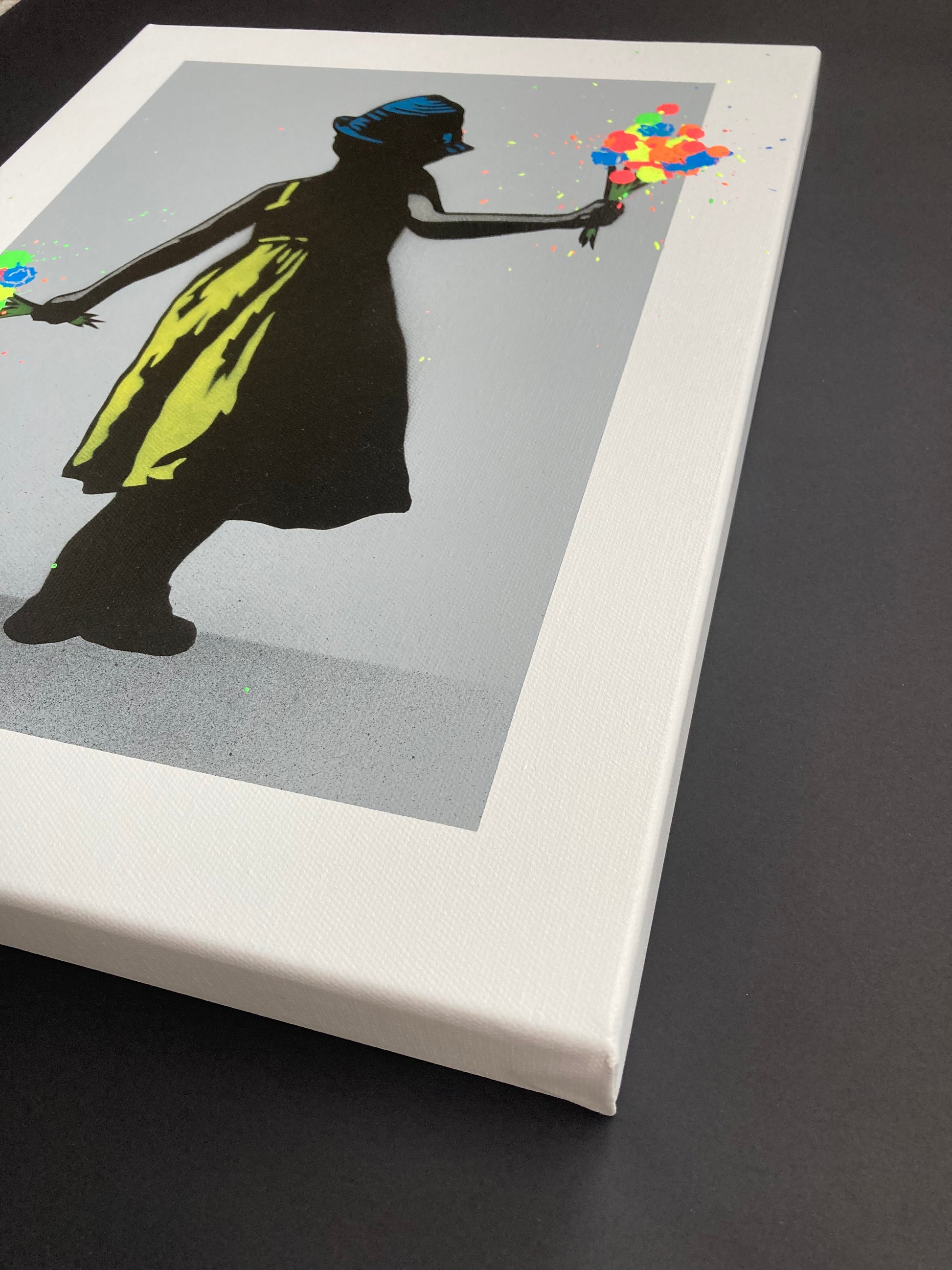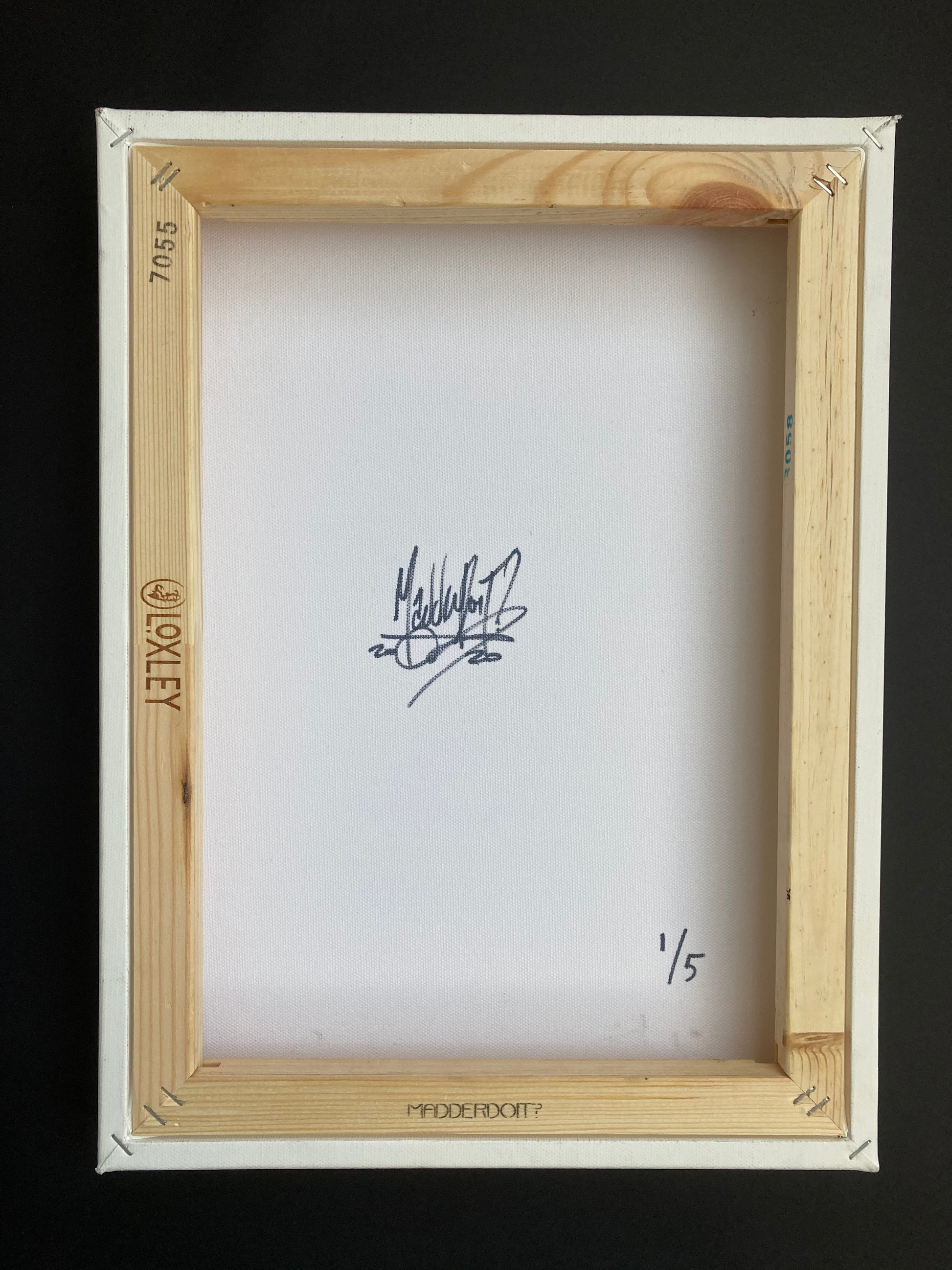 Beskrivelse – 13-fargers sjablong og spraymaling på lerret med dyp kant. Håndmalt - signert, datert og nummerert på baksiden.