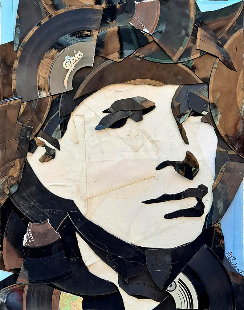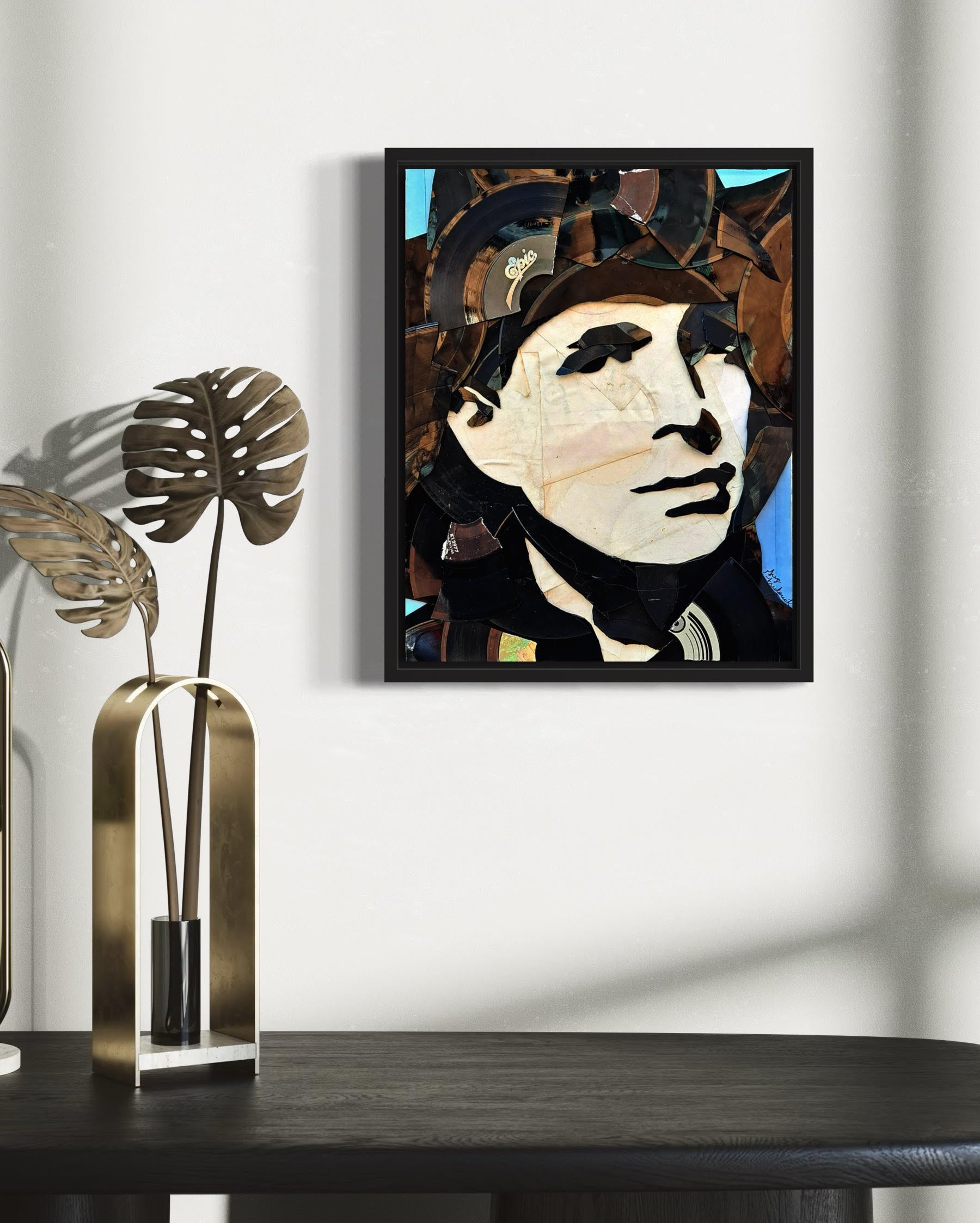 Laget av vinylplater og deres pakking på 36 x 36 lerret i en svart flyteramme.