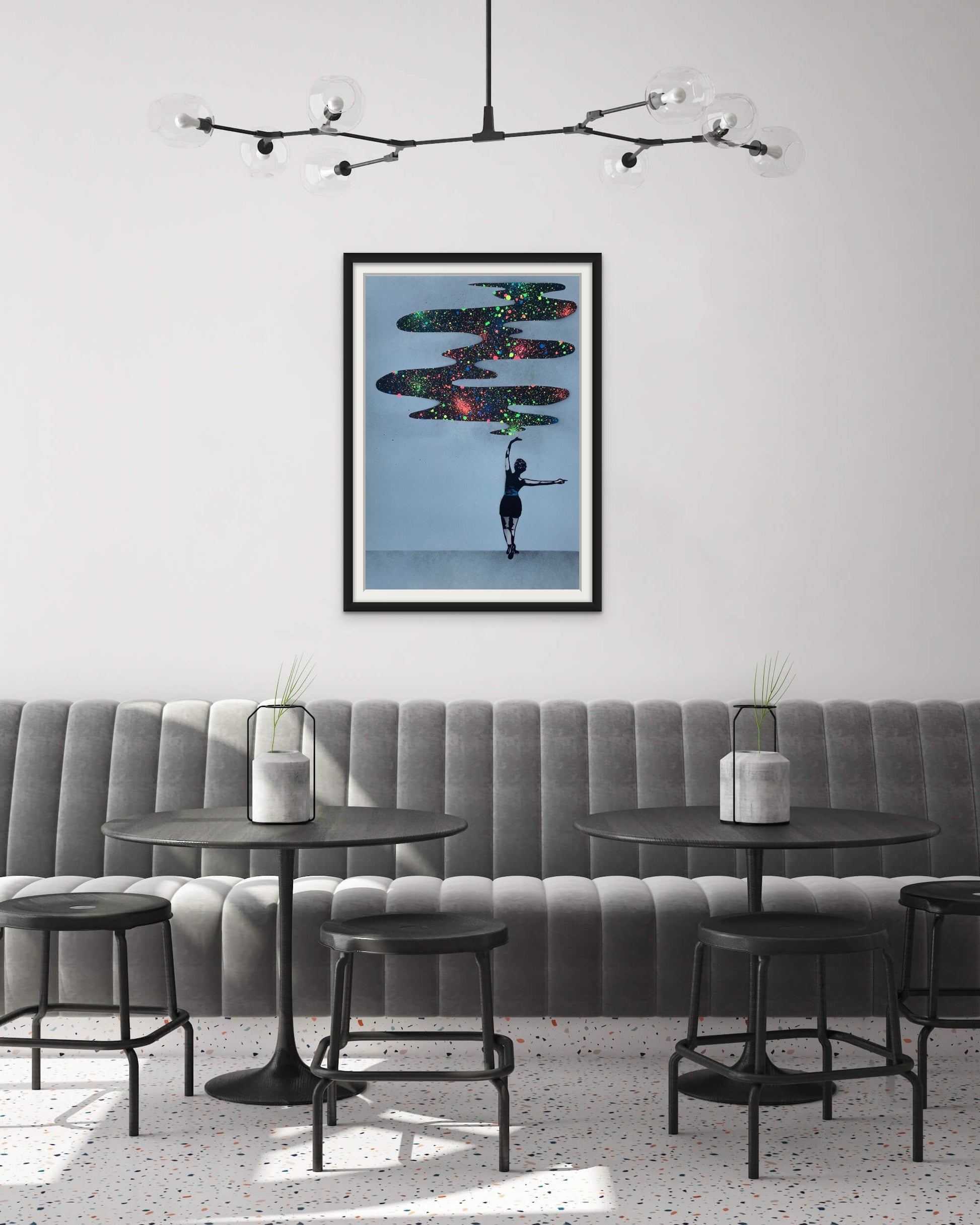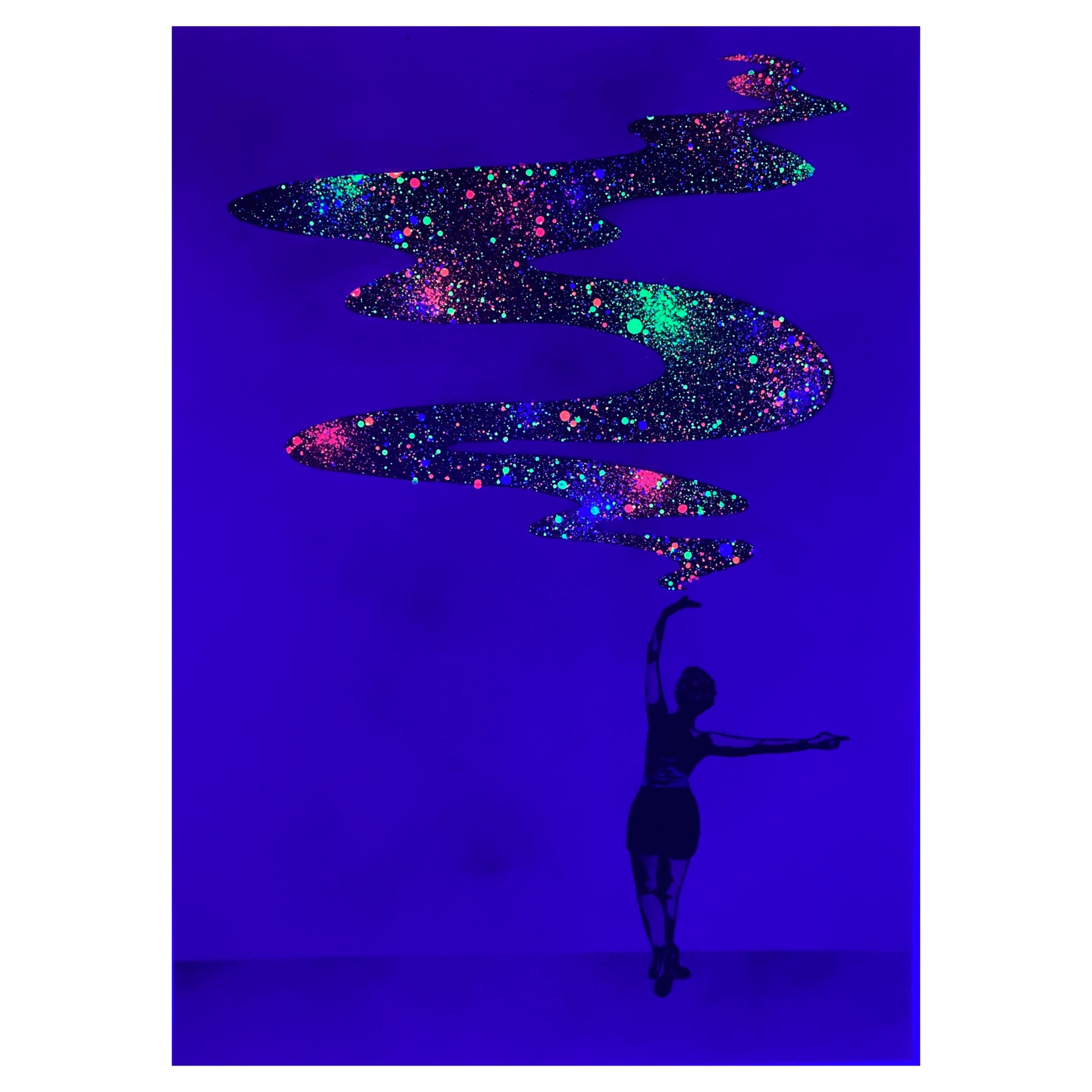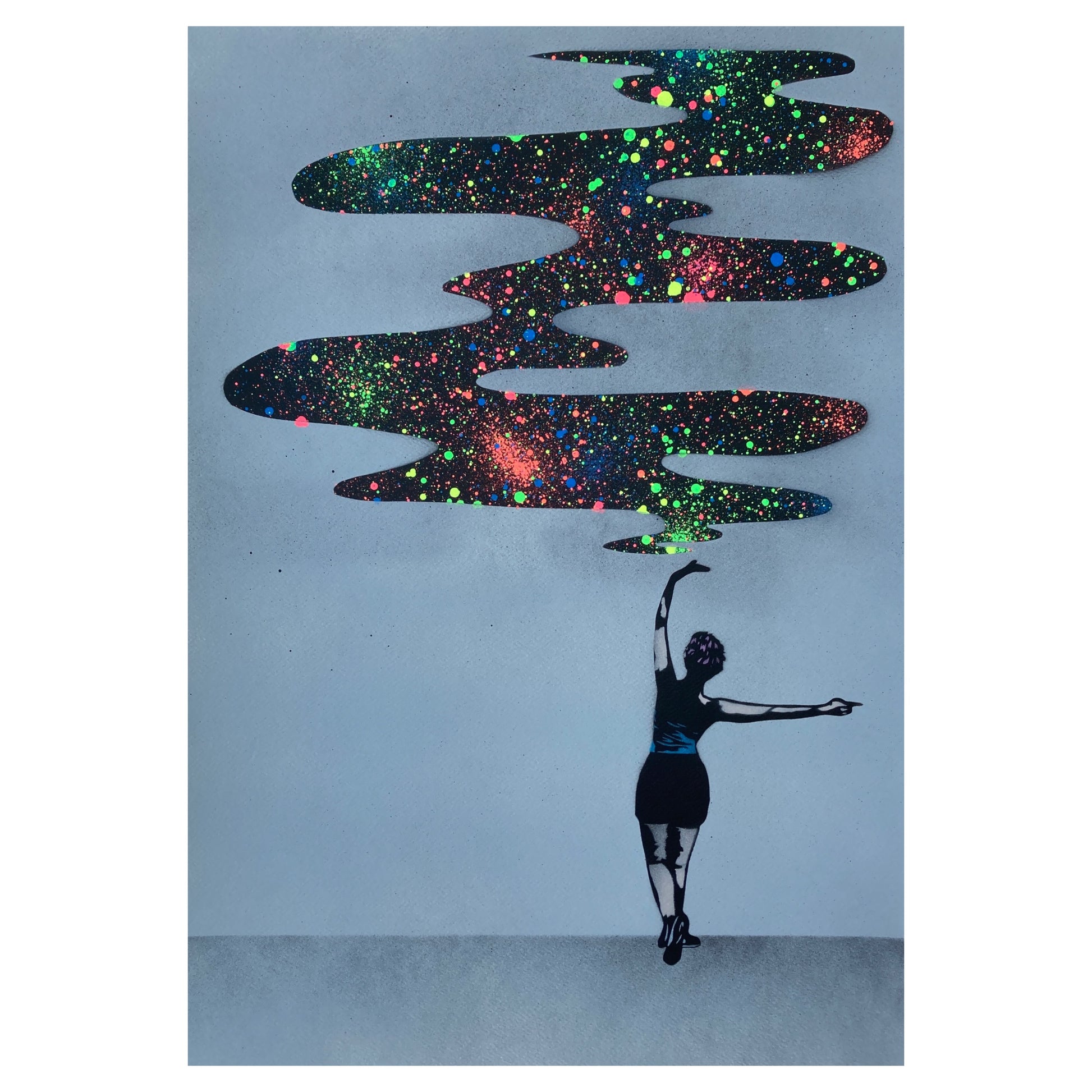 Beskrivelse – 11 farger sjablong og spraymaling på papir. Hver hånd malt med en unik splatter-virvel - Signert, datert og nummerert på baksiden. Kommer med COA.