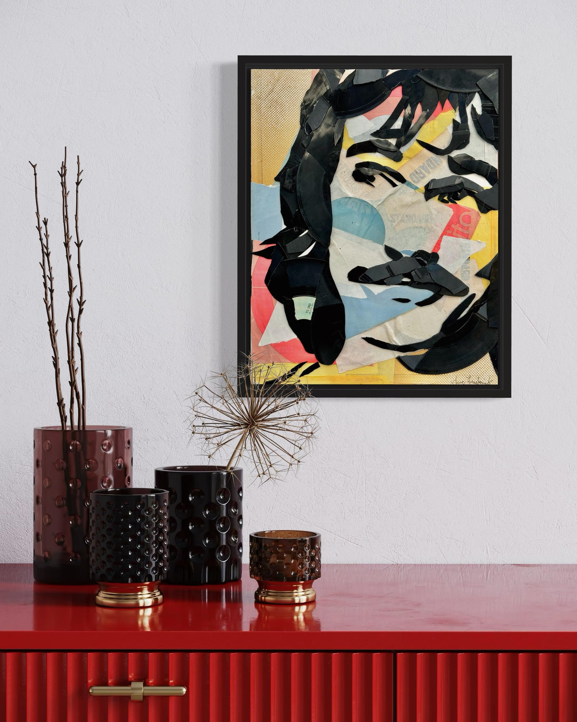 Laget av vinylplater og deres pakking på 36 x 36 lerret i en svart flyteramme.