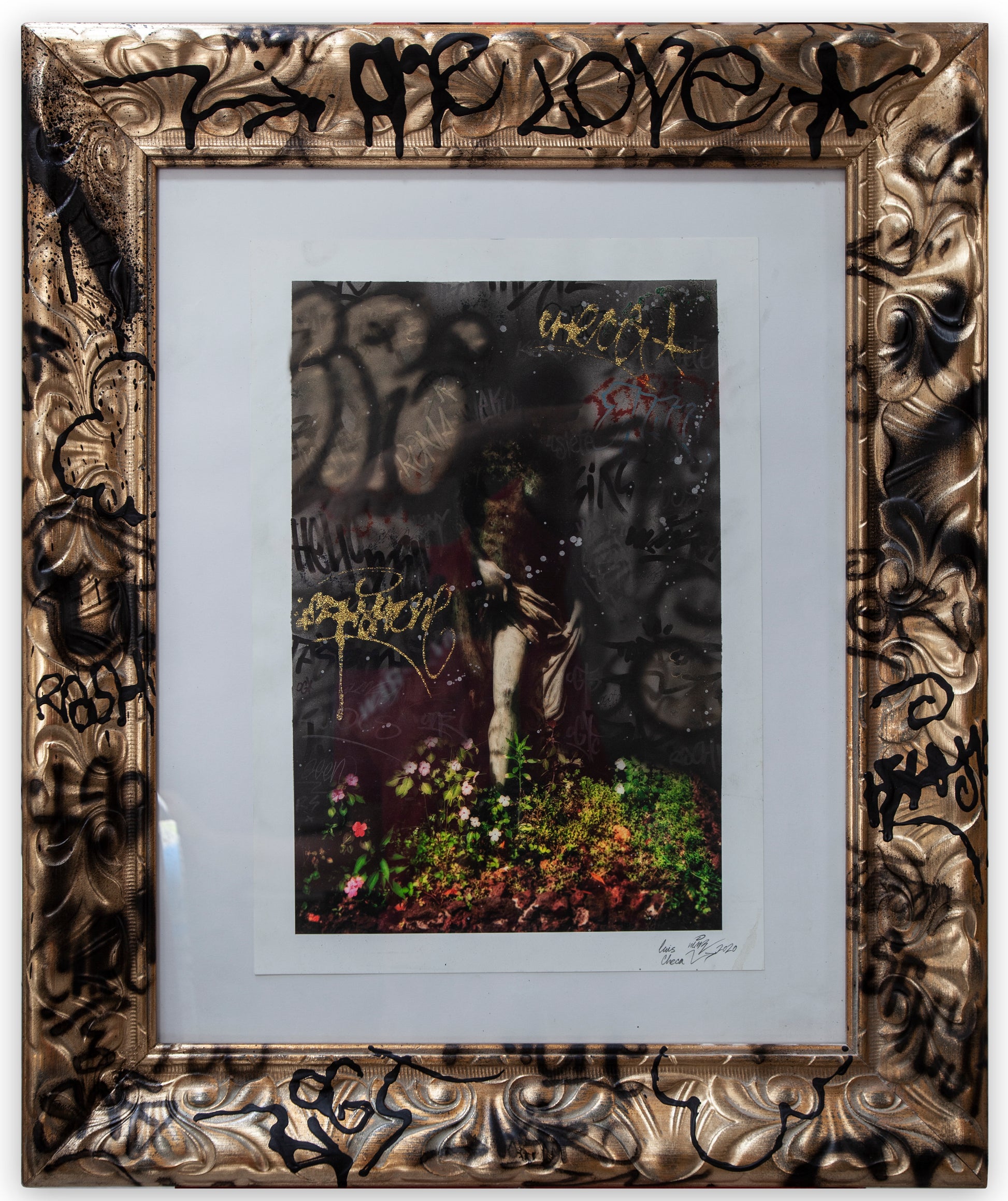 Håndferdig innrammet (spraymaling, akryl og lakk)