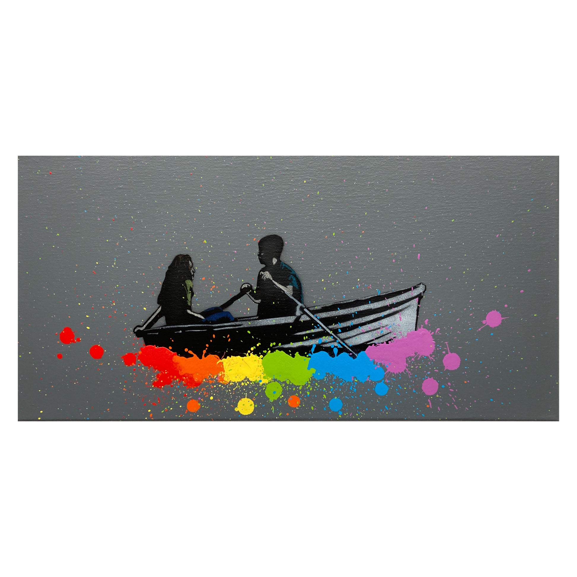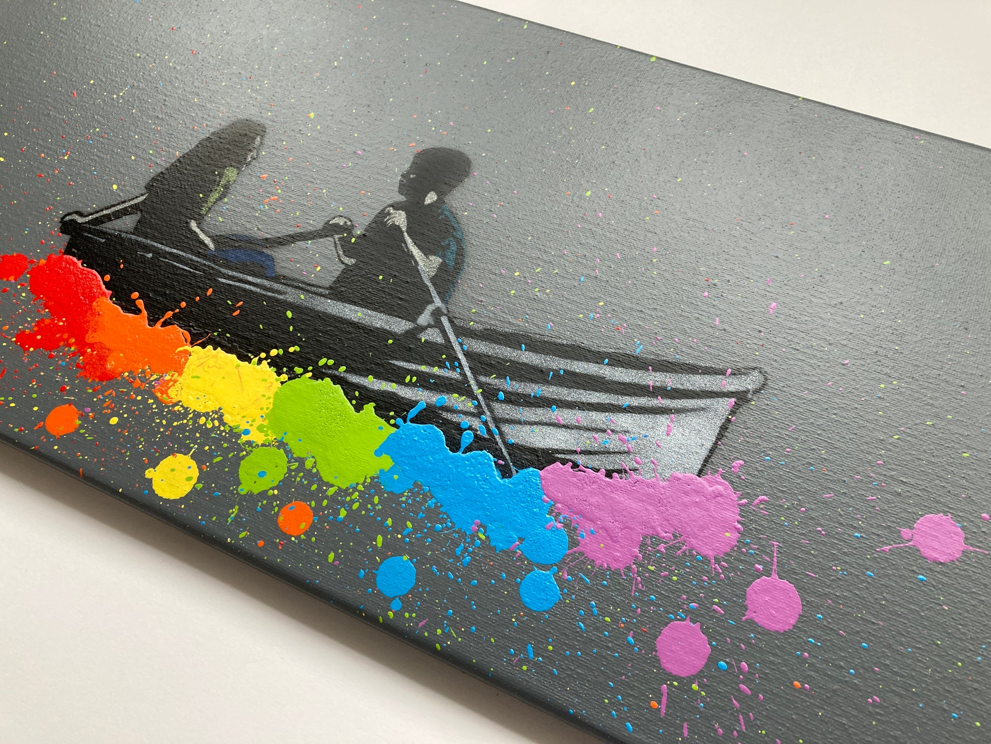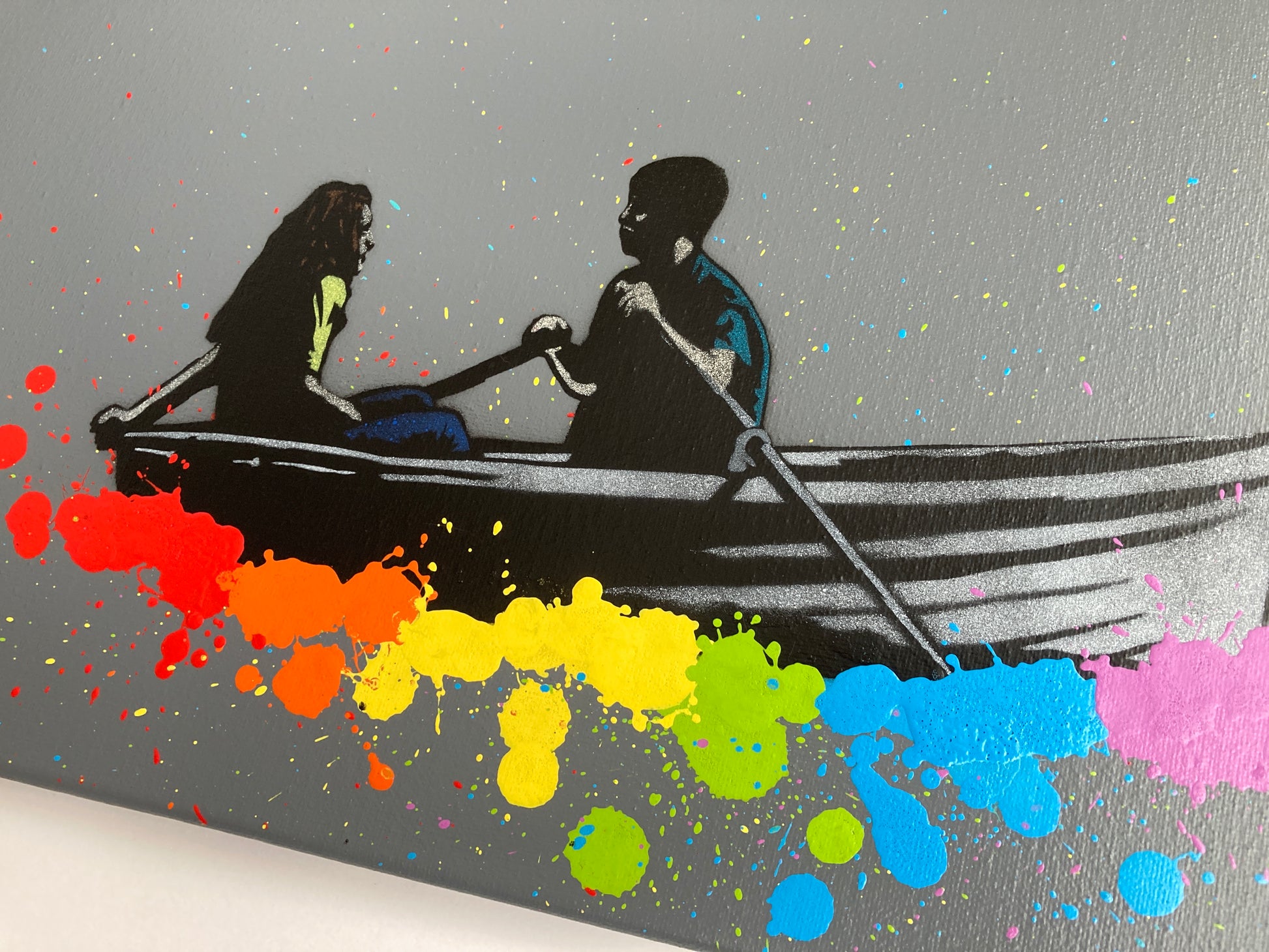 Beskrivelse – 15 farger sjablong og spraymaling på lerret. Håndmalt hver med unike regnbuevannsprut. Håndsignert, datert og nummerert på baksiden.