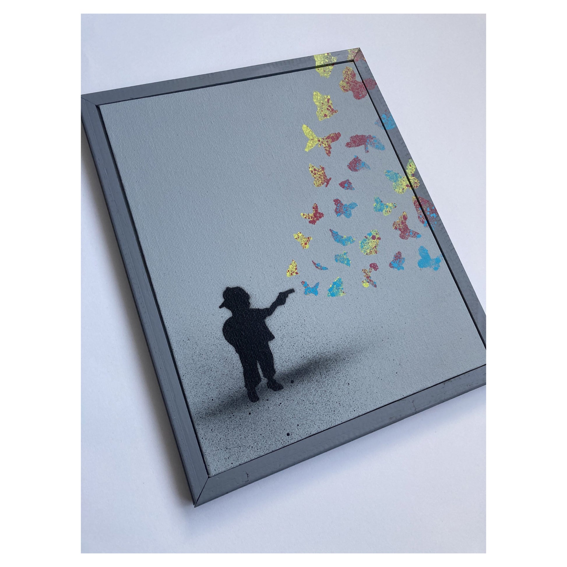 Beskrivelse – 6 farger sjablong og spraymaling på lerretsplate i montert treramme. Håndmalt med unik sjablong for sommerfuglsprut. Håndsignert, datert og nummerert på baksiden.