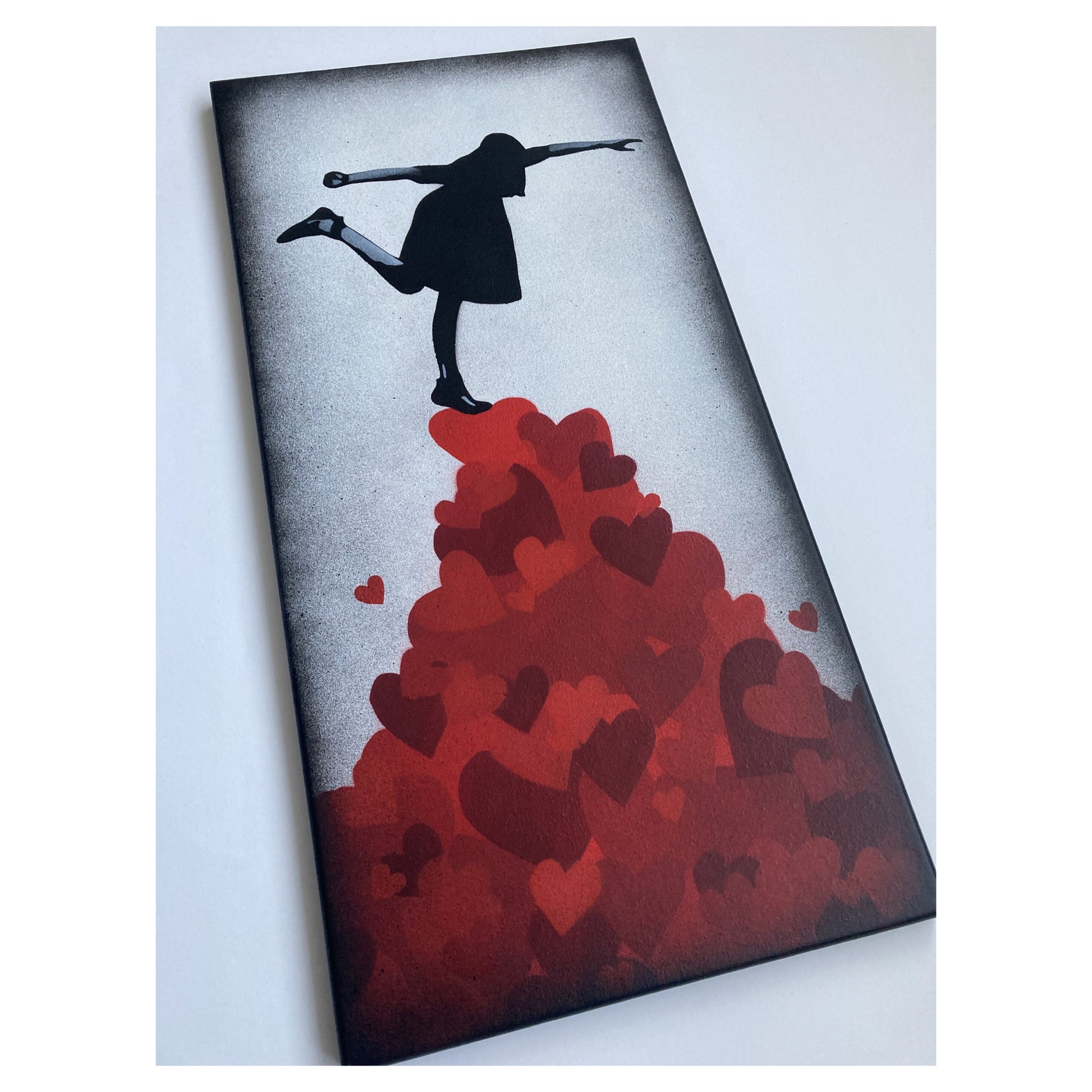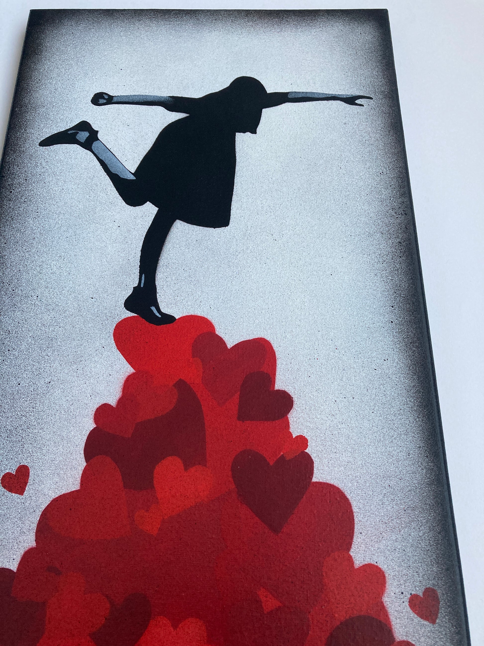 Beskrivelse – 7 farger sjablong og spraymaling på lerret. Håndmalt med unikt hjertefjell. Signert og datert (umerket original) på baksiden.