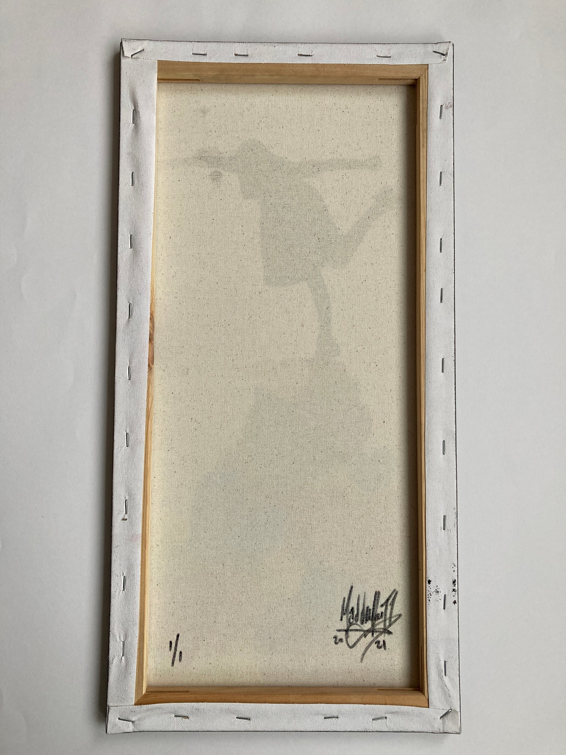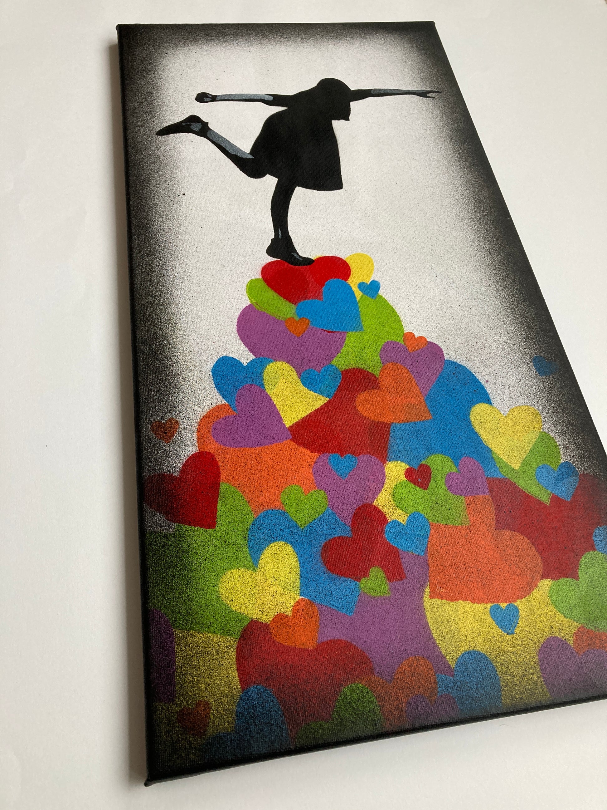 Beskrivelse – 8 farger sjablong og spraymaling på lerret. Håndmalt med unikt hjertefjell. Signert, datert og nummerert på baksiden.