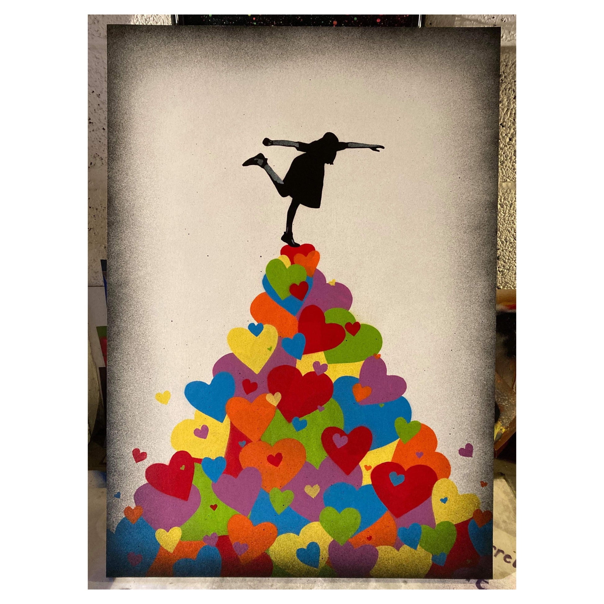 Beskrivelse – 7 farger sjablong og spraymaling på trepanel. Håndmalt med unikt hjertefjell. Signert og datert (umerket original) på baksiden.