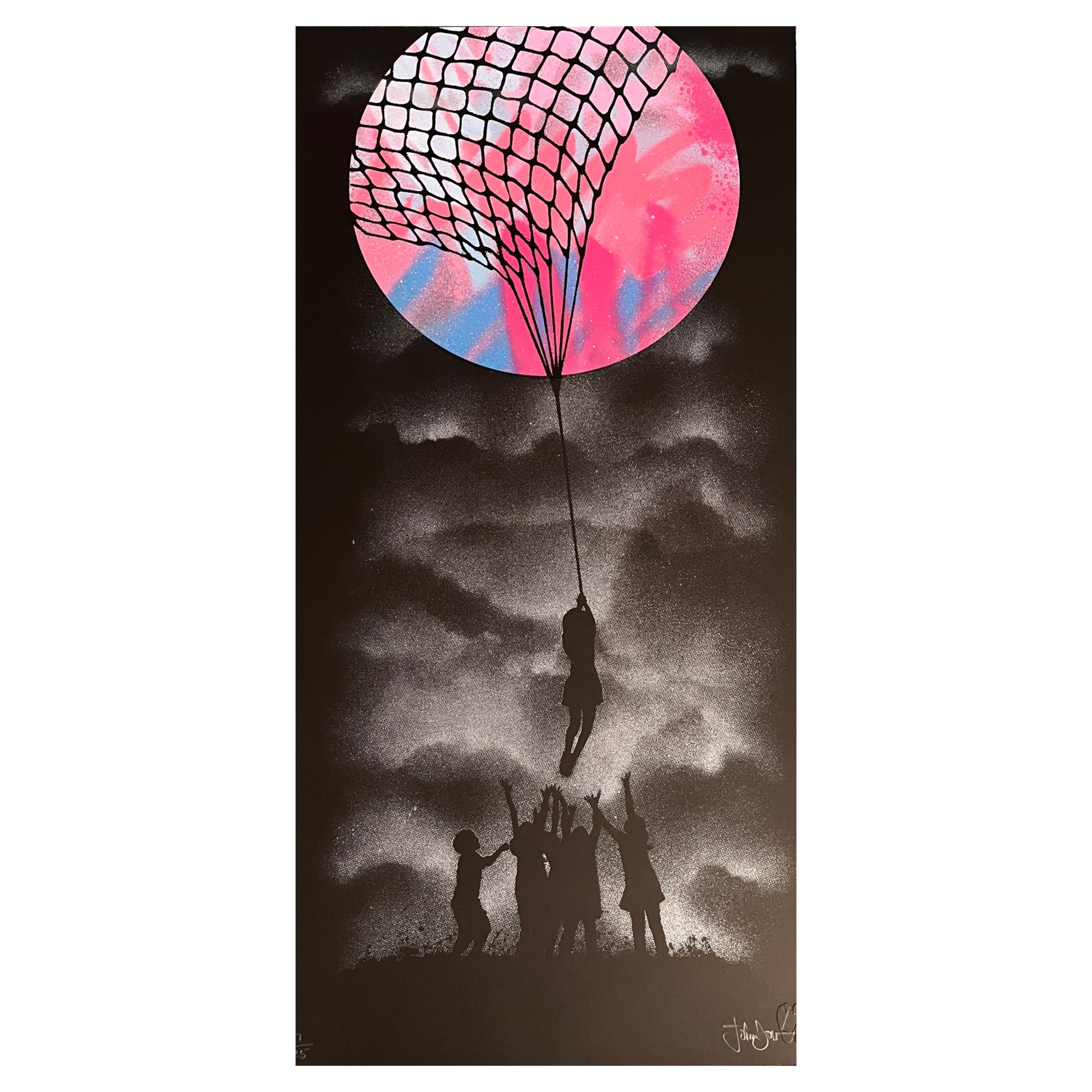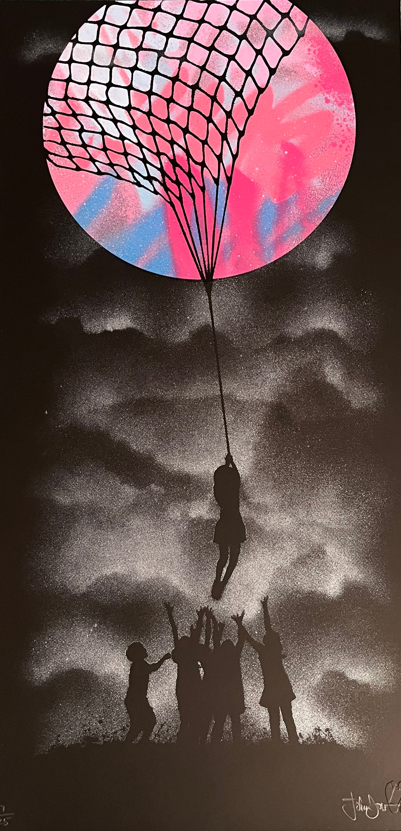 - 3 farger håndtrukket silketrykk (den svarte er trykt slik at de håndferdige spraymalingselementene kan vises gjennom når månen/skyene består av 2 halvtone metalliske sølvblekk)