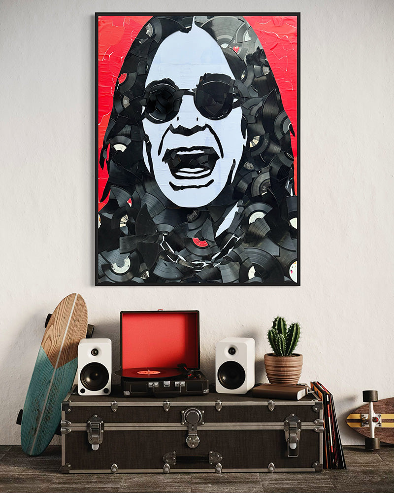 Laget av vinylplater og deres pakking på 36 x 36 lerret i en svart flyteramme.