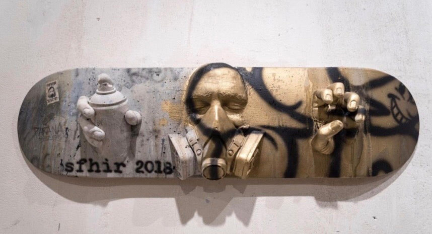 Gips og harpiks på skateboard malt med spray, akryl og blyant