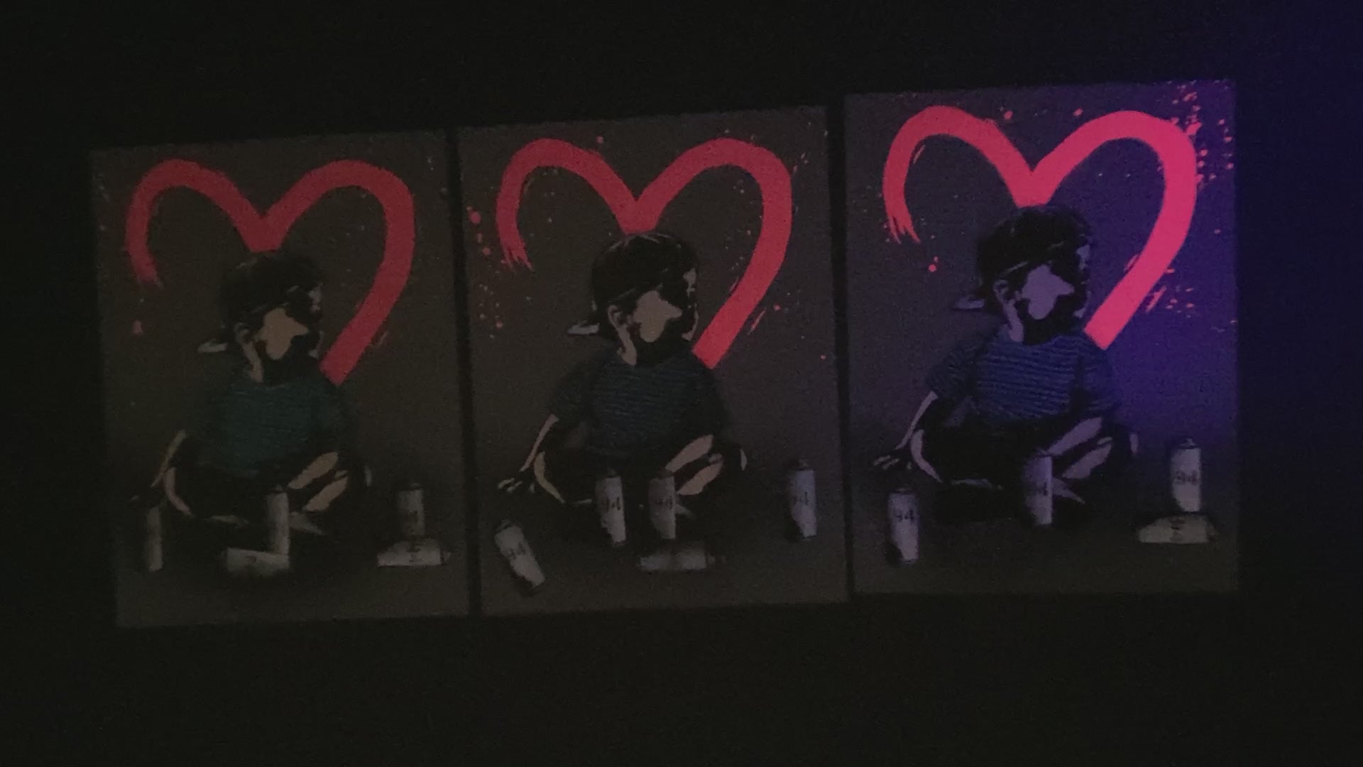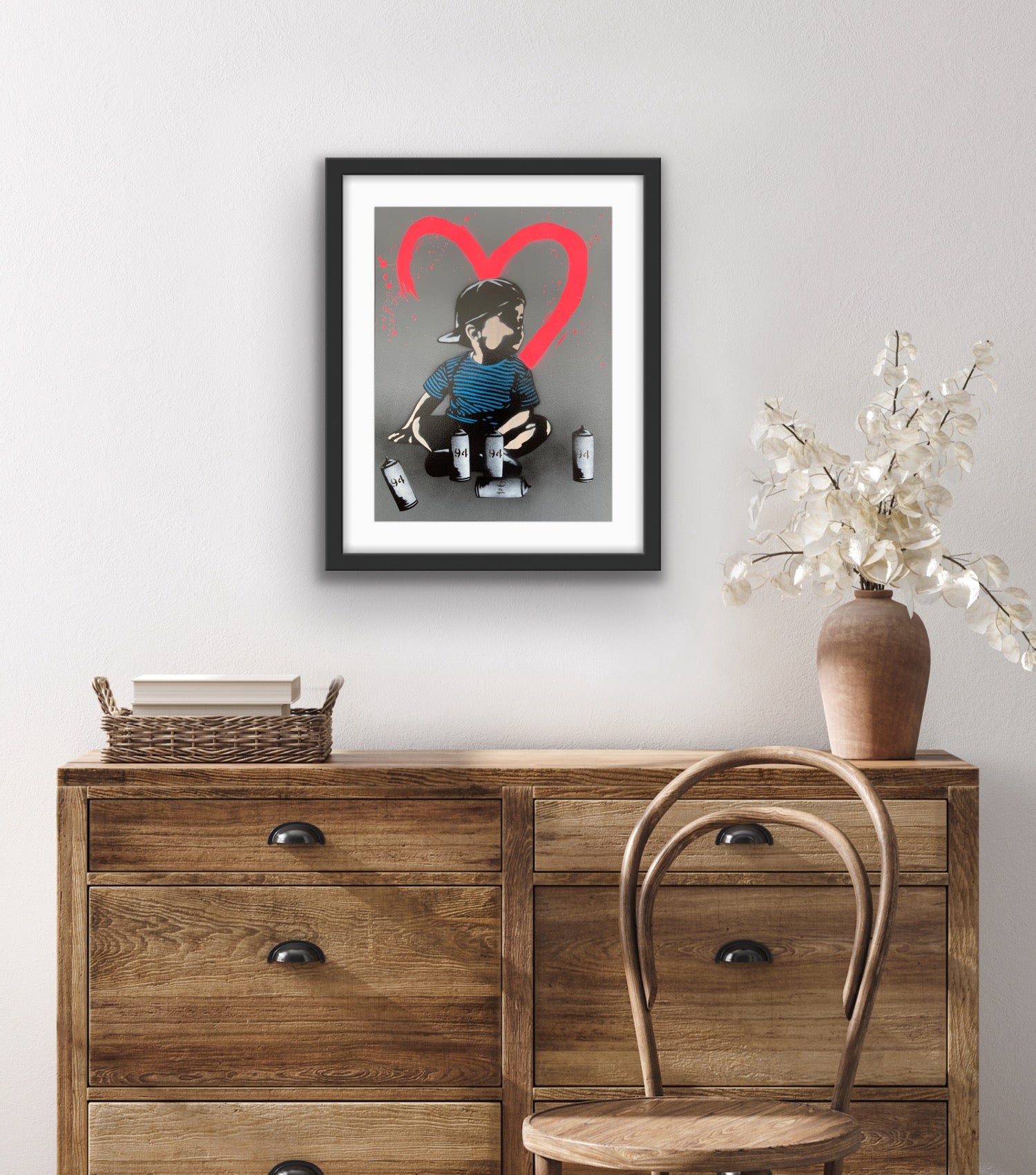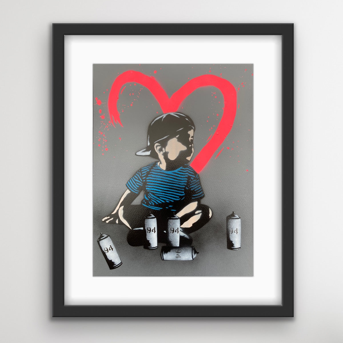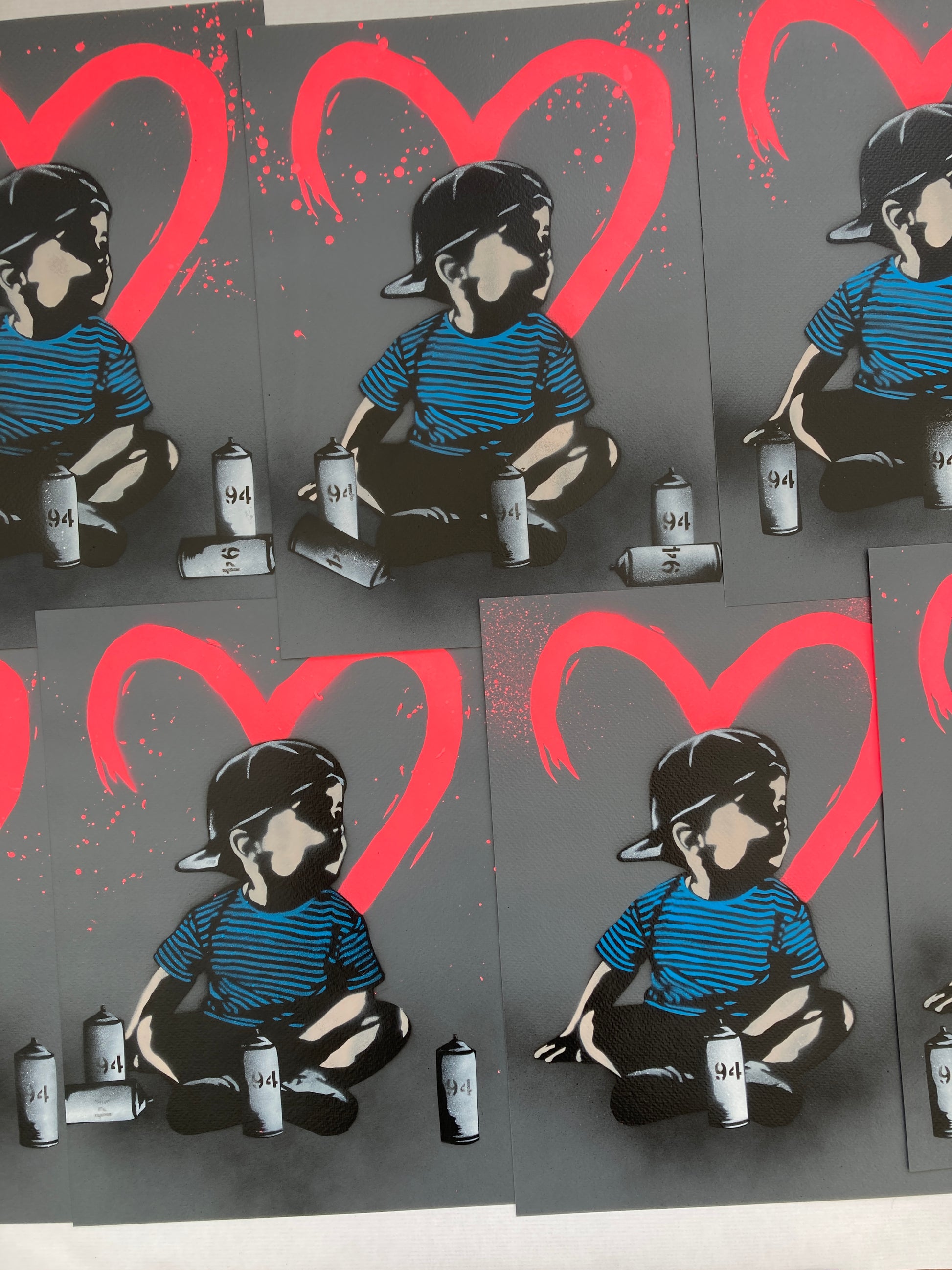 Beskrivelse – 11 farger sjablong og spraymaling på papir. Hver hånd malt med en unik splatter-virvel - Signert, datert og nummerert på baksiden. Kommer med COA.