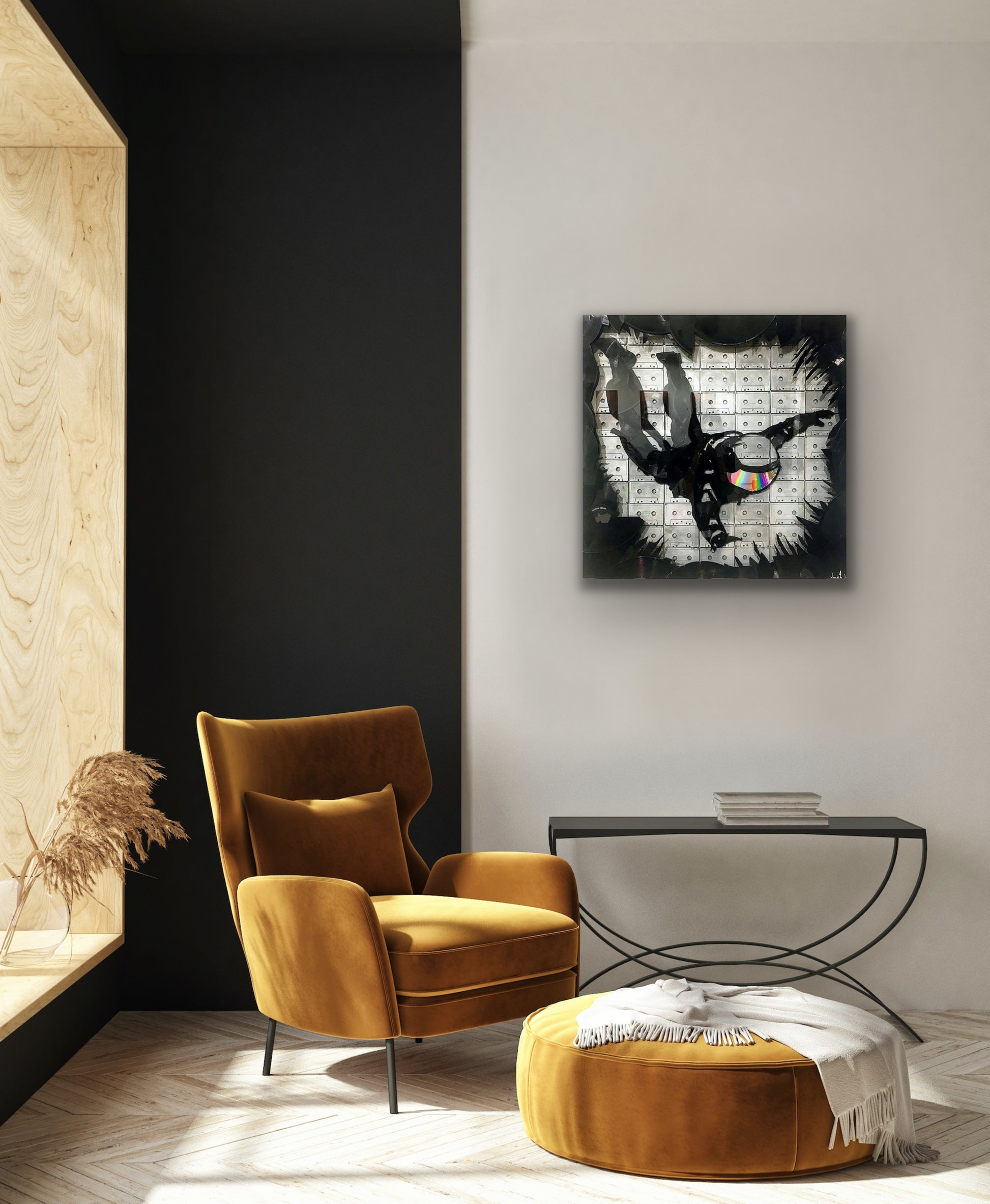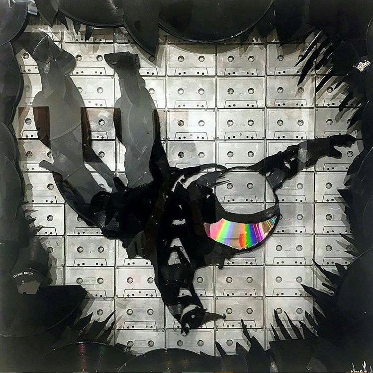 Laget med kassetter, vinylplater, laserdisk og plexiglass i 30 x 30 skyggeboks.