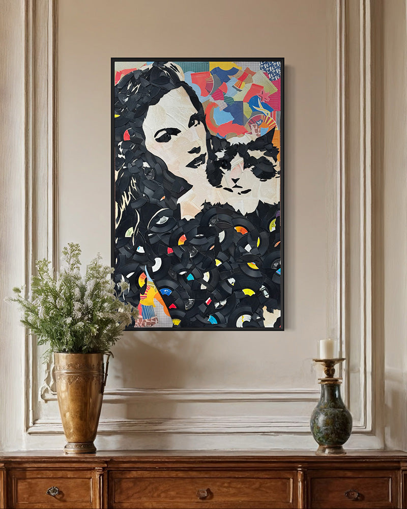 Laget av vinylplater og deres pakking på 36 x 36 lerret i en svart flyteramme.