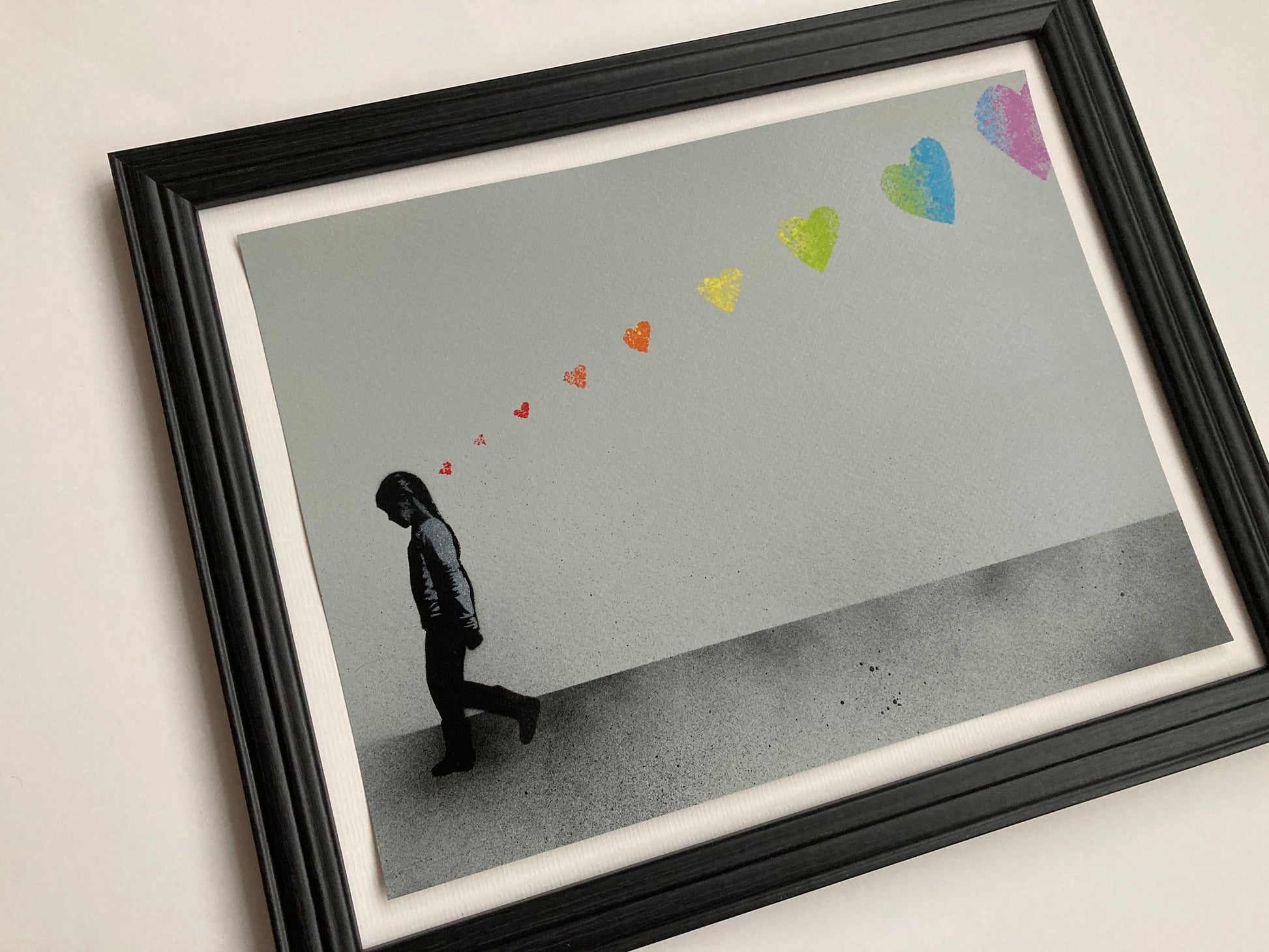 Beskrivelse – 9 farger sjablong og spraymaling på papir. Håndmalt hver med unike regnbuespruthjerter. Håndsignert, datert og nummerert på baksiden.