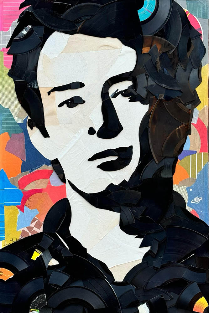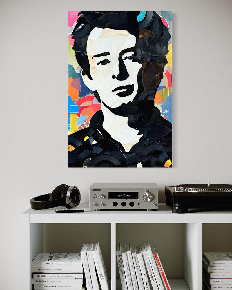 Laget av vinylplater og deres pakking på 36 x 36 lerret i en svart flyteramme.