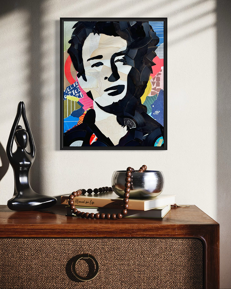 Laget av vinylplater og deres pakking på 36 x 36 lerret i en svart flyteramme.