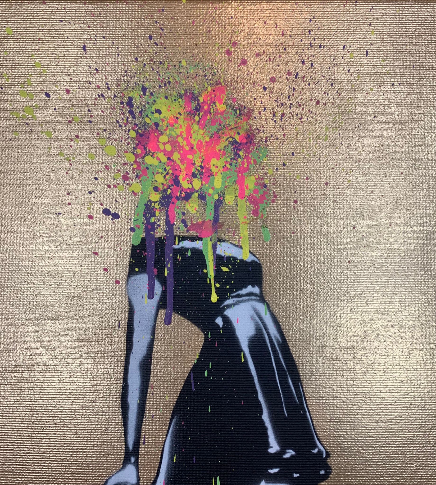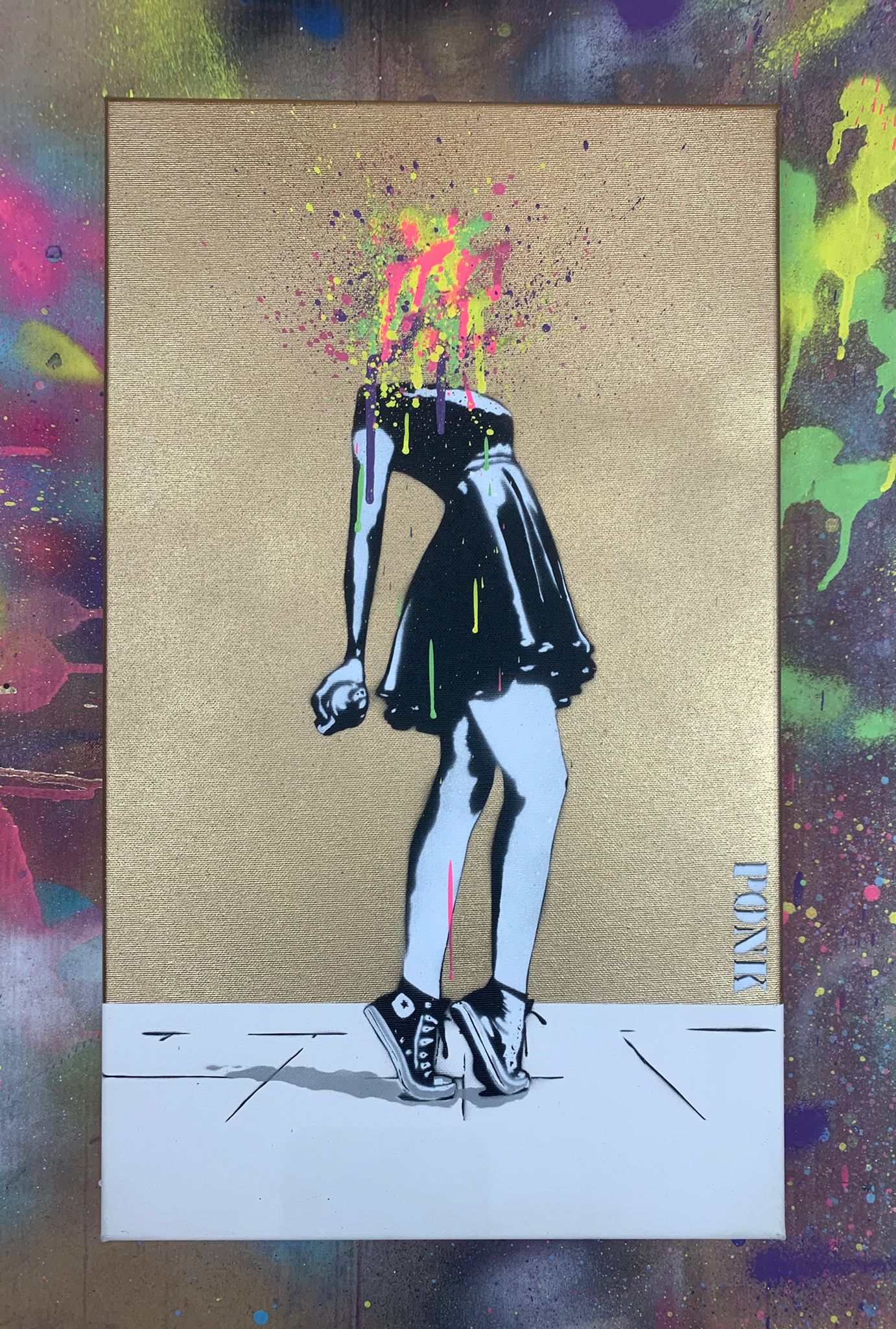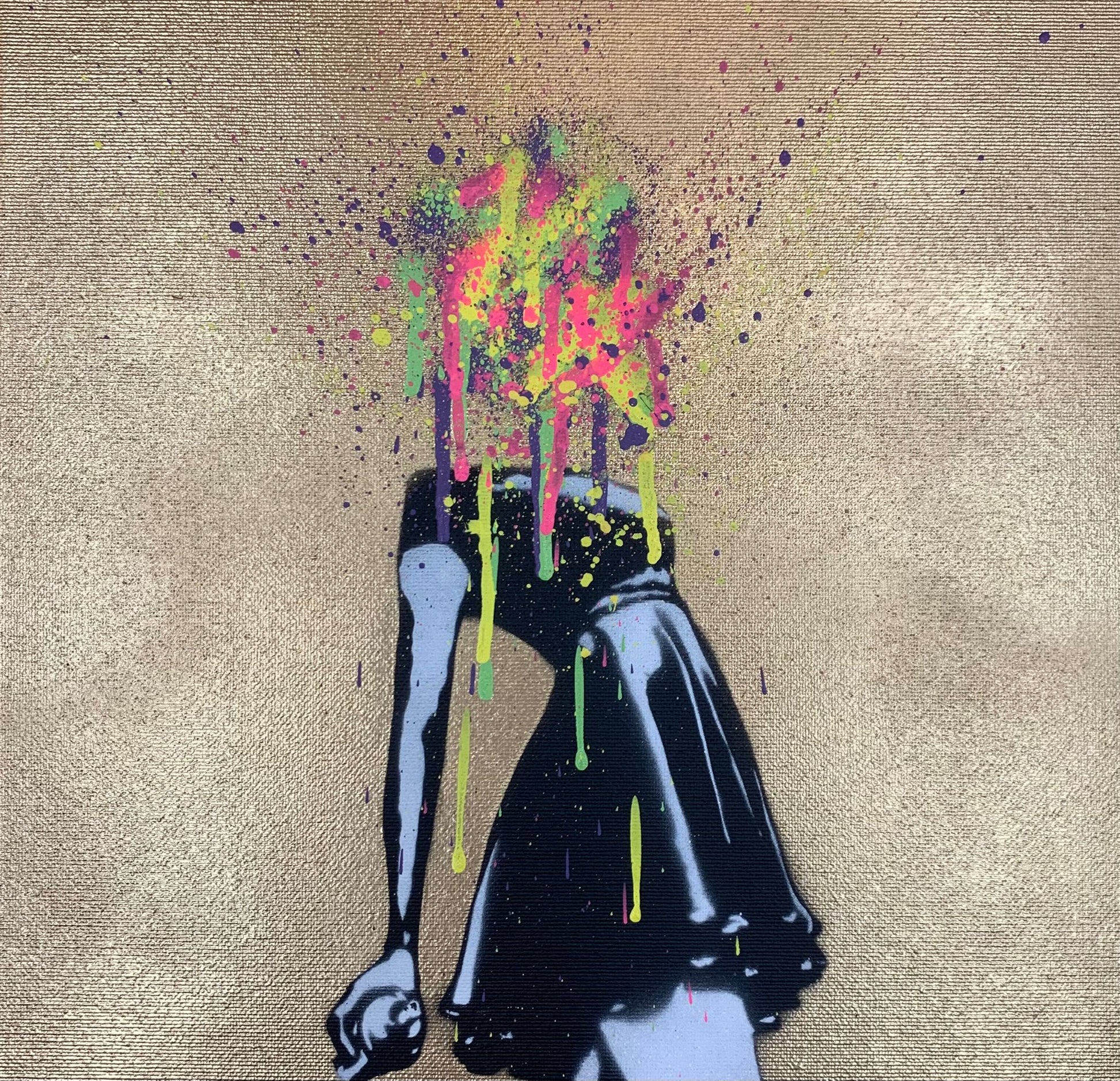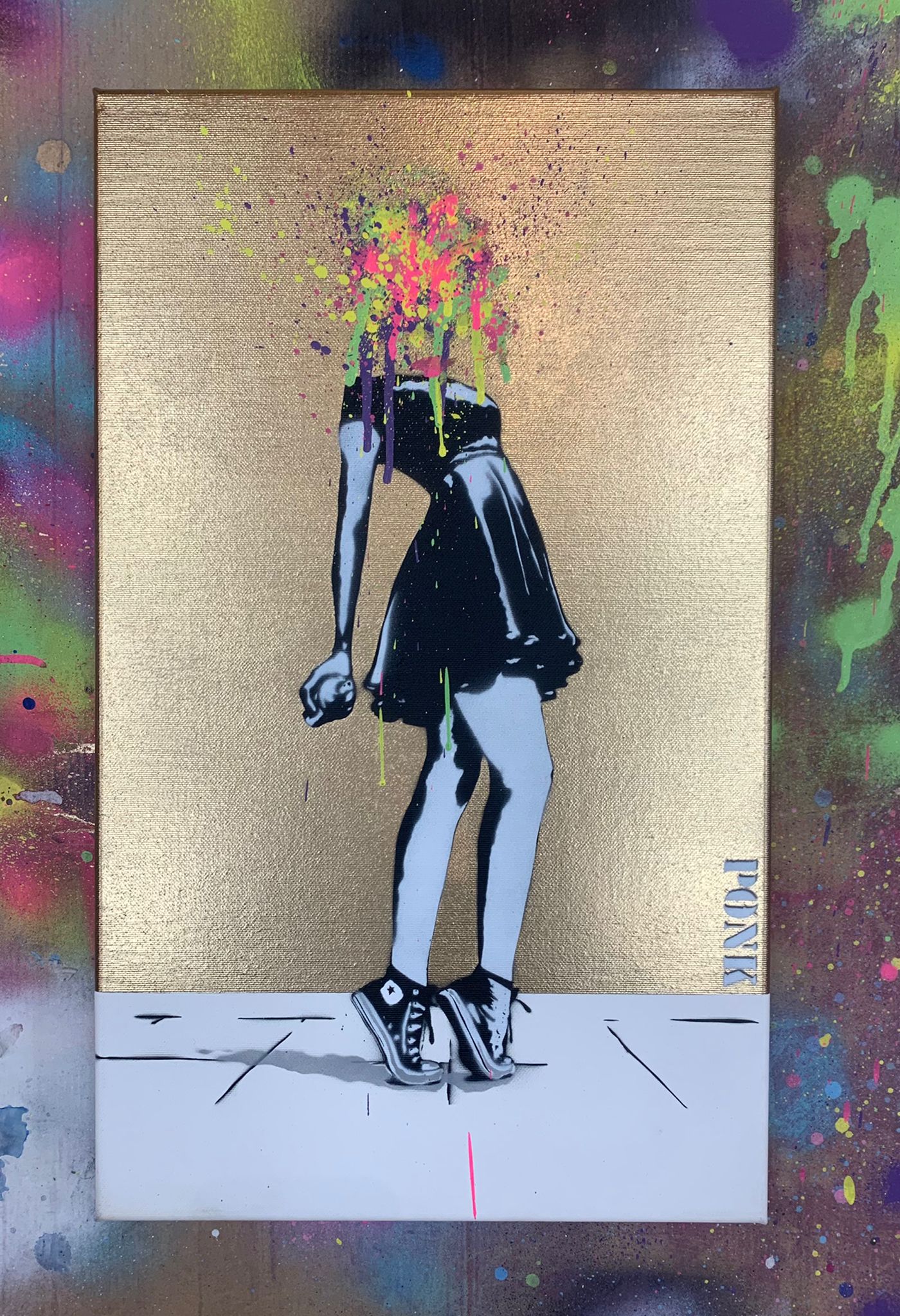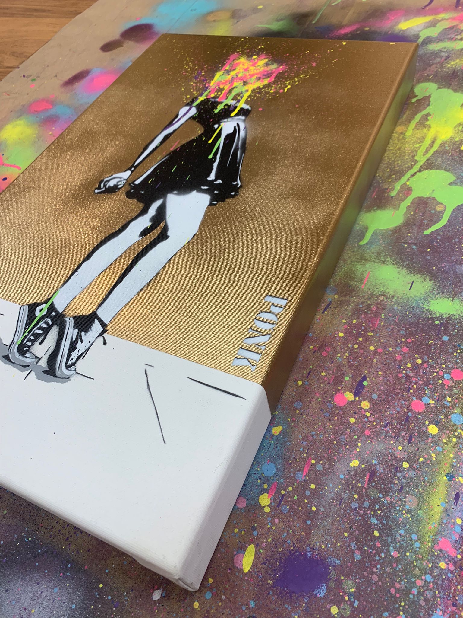 Sjablong og akryl + gull krom spraymaling på lerret