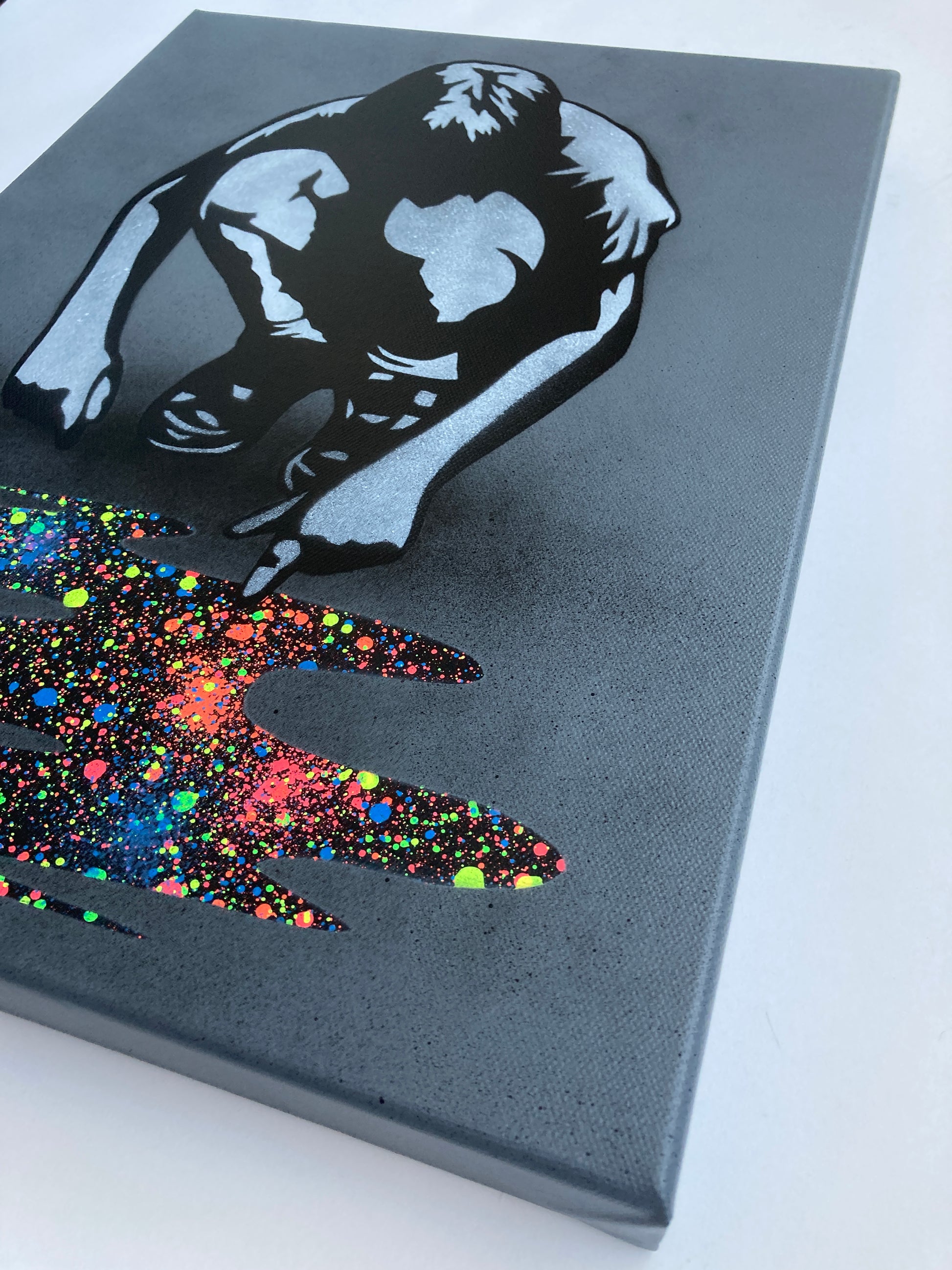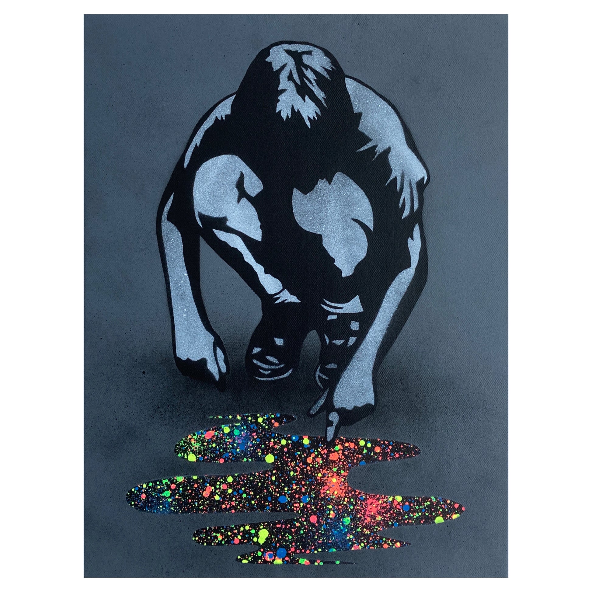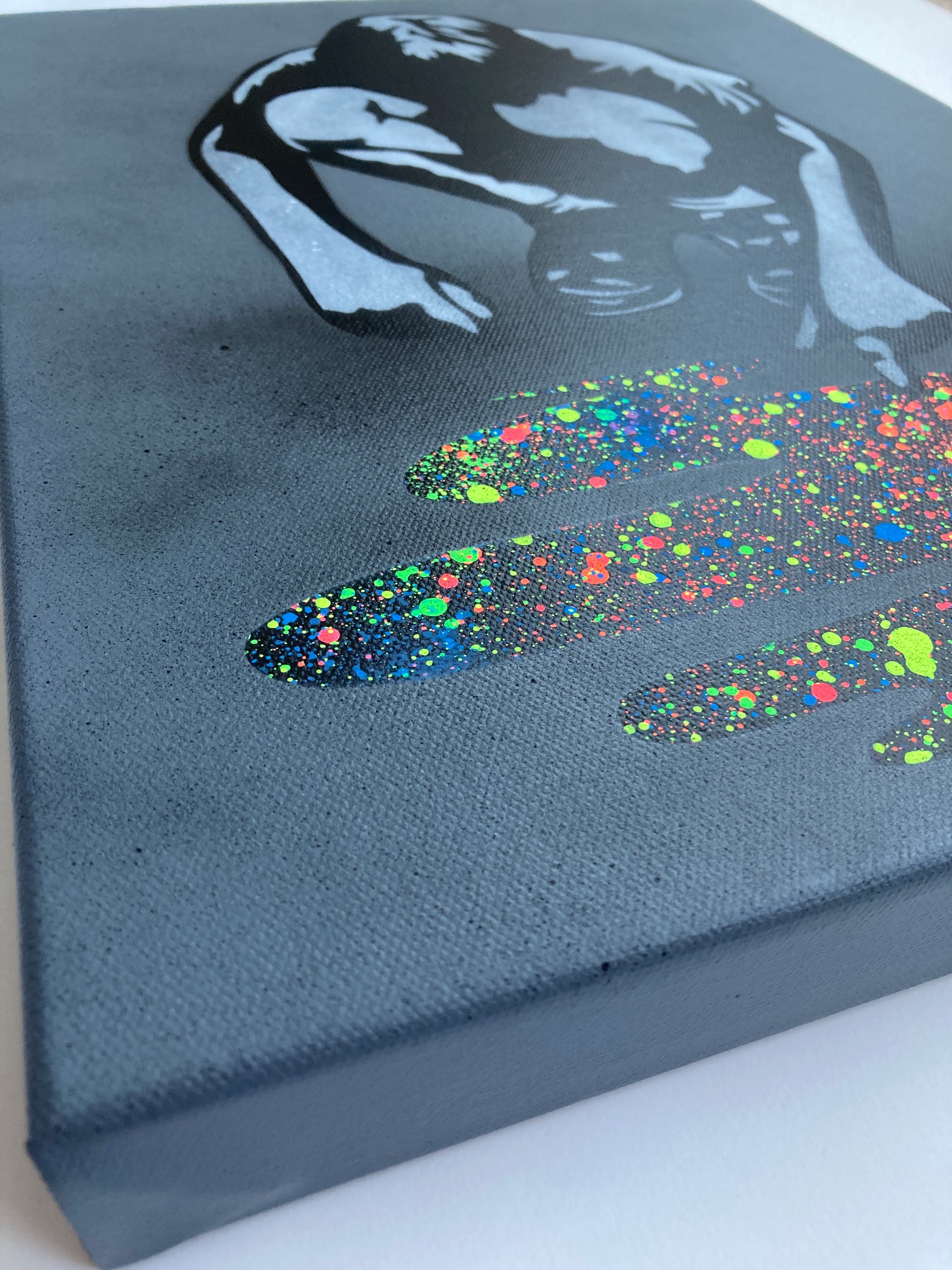 Beskrivelse – 8-fargers sjablong og spraymaling på lerret med dyp kant. Håndmalt hver med en unik "pytt" - Signert, datert og nummerert på baksiden.