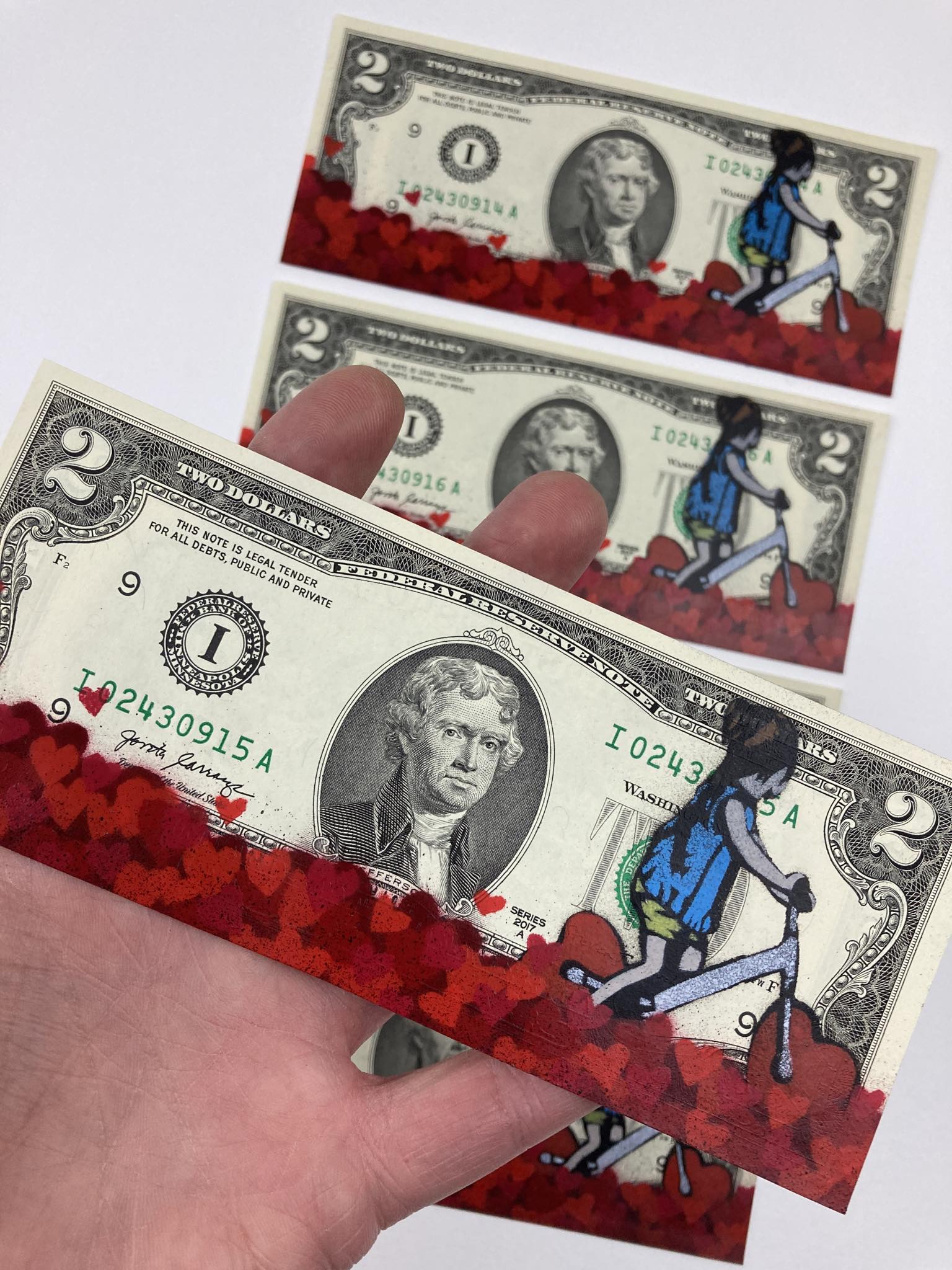 Description – 11 color stencil and spray paint on uncirculated $2 bill –