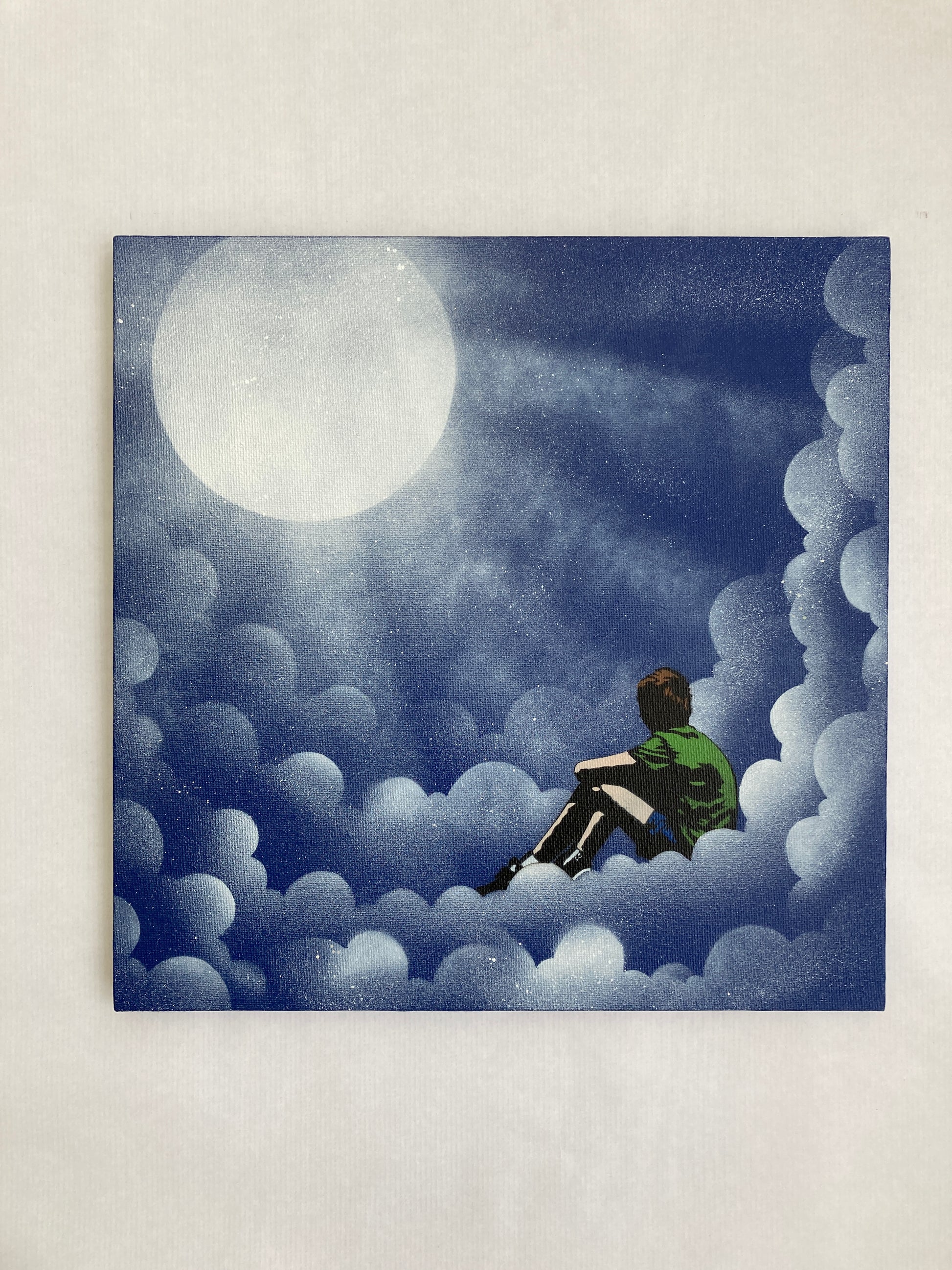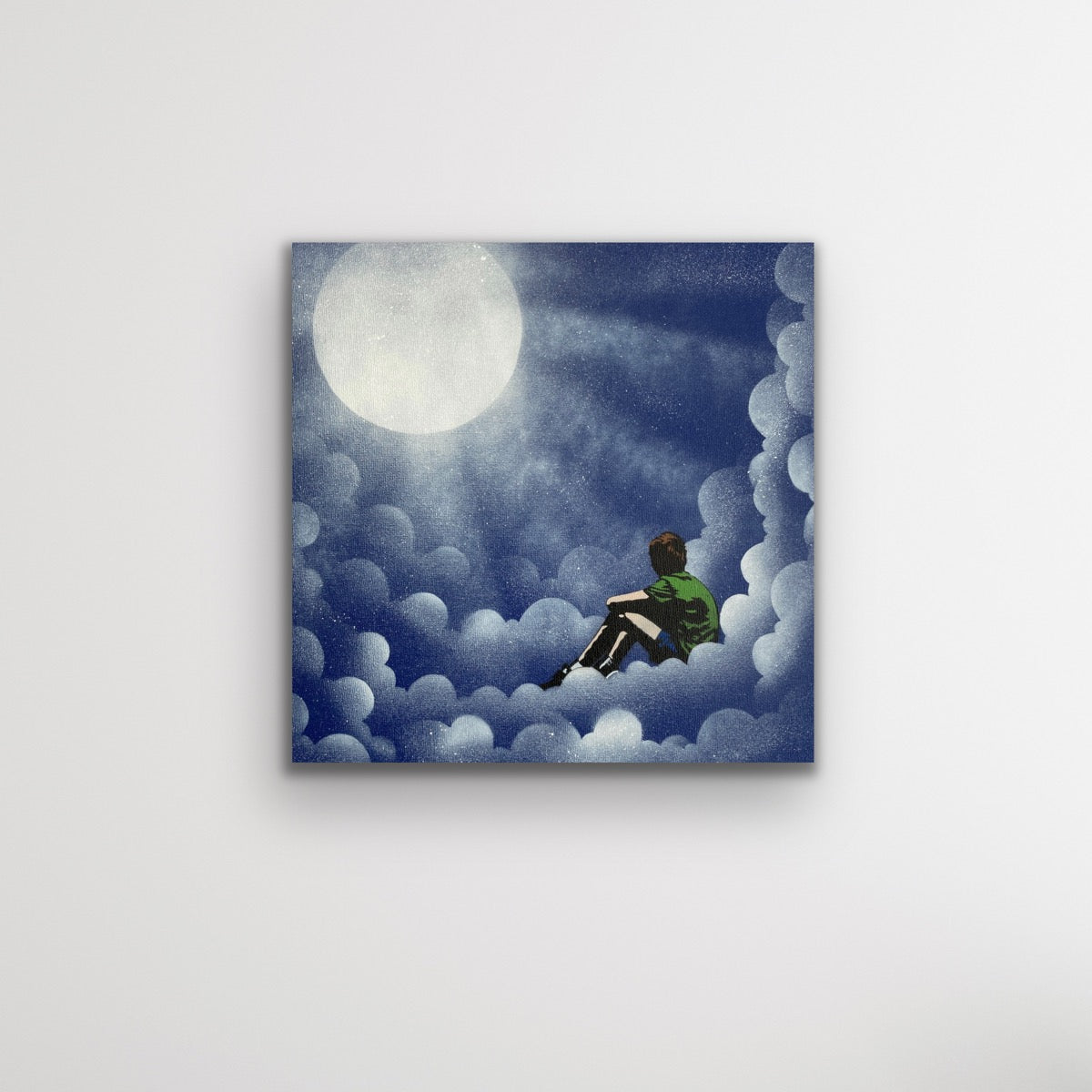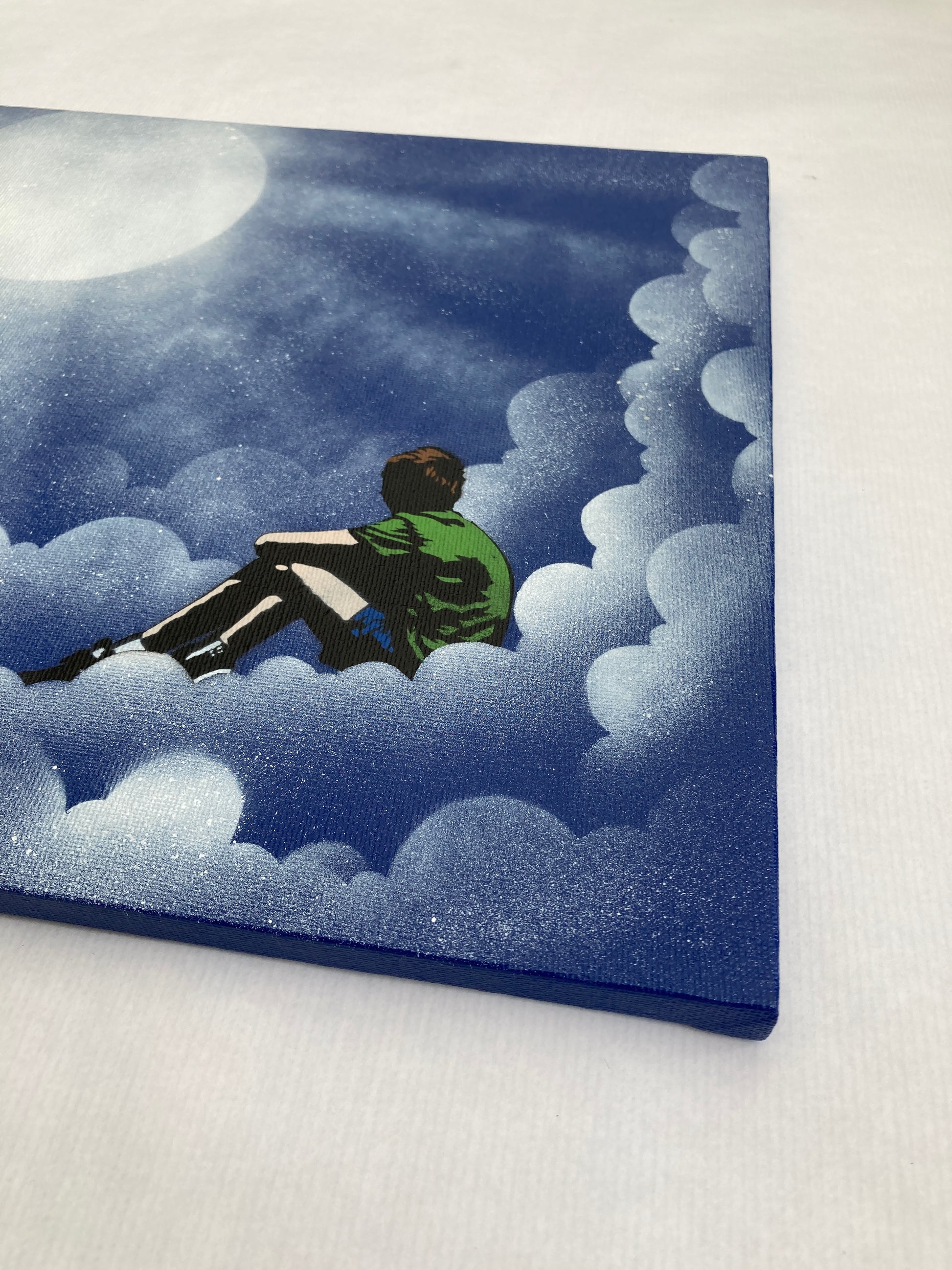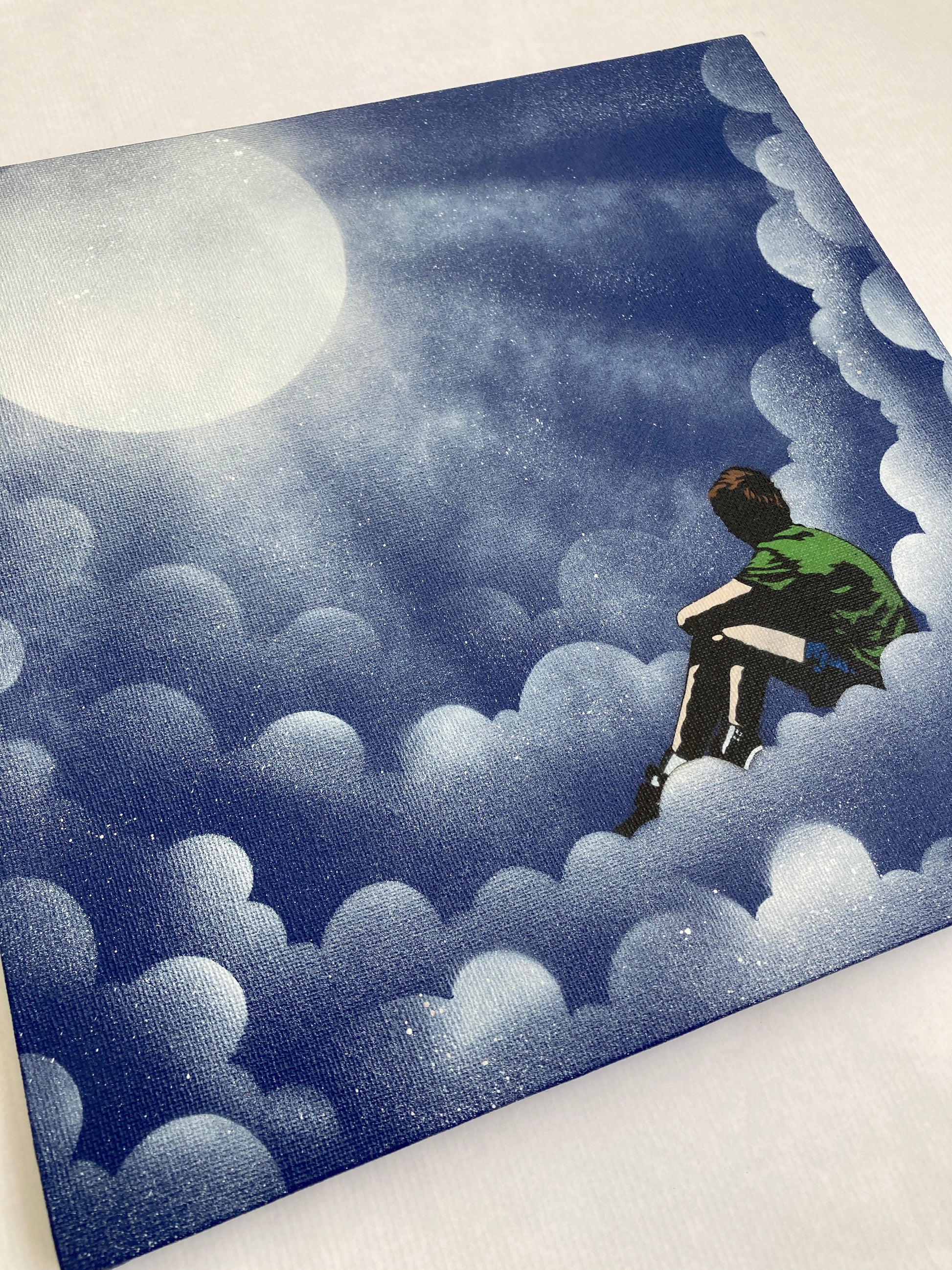 8-farget spraymaling og flerlags sjablong på lerret. Håndmalt med unike hvite UV-skyer. Håndsignert, datert og nummerert på baksiden. Kommer med COA.