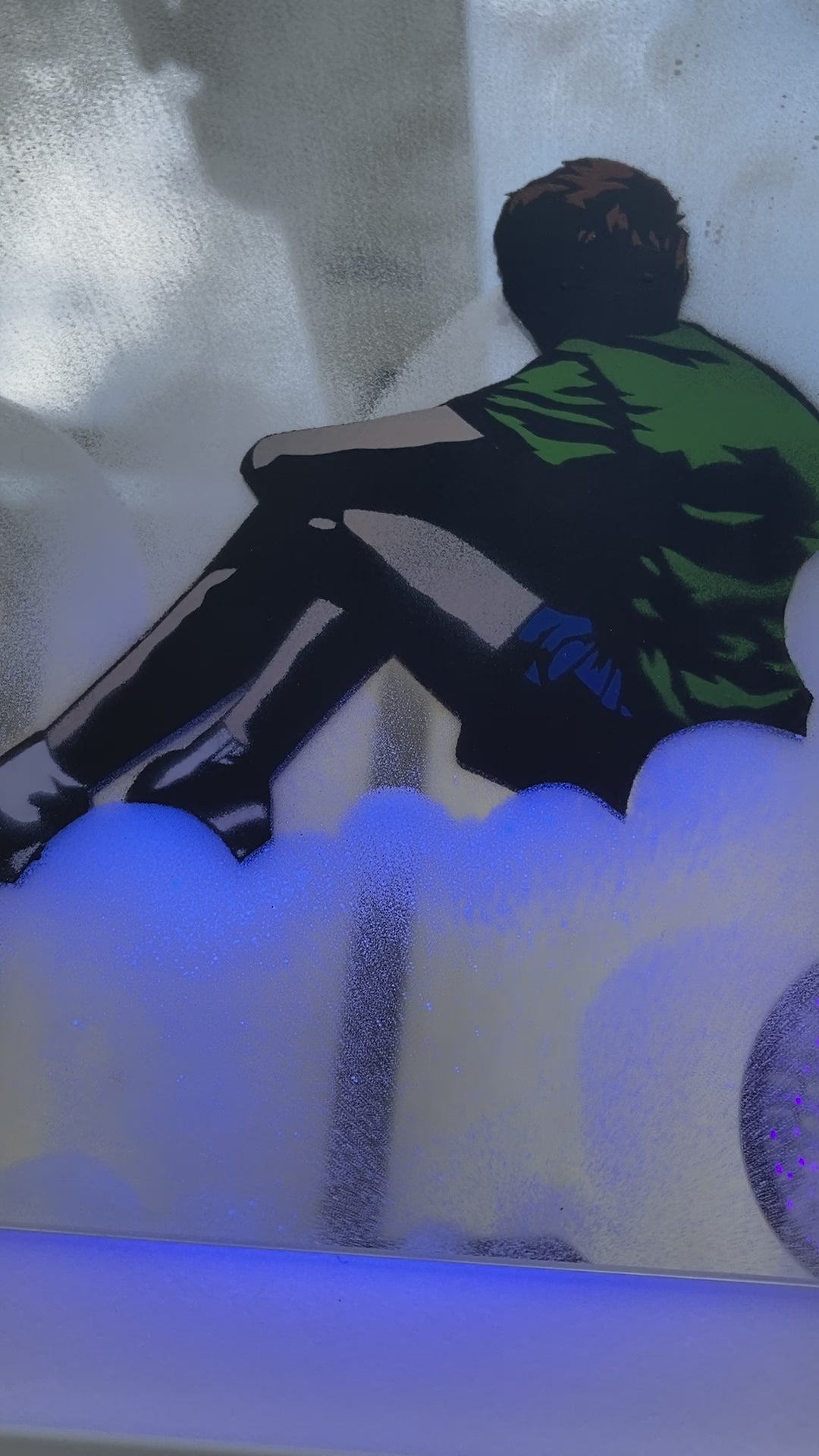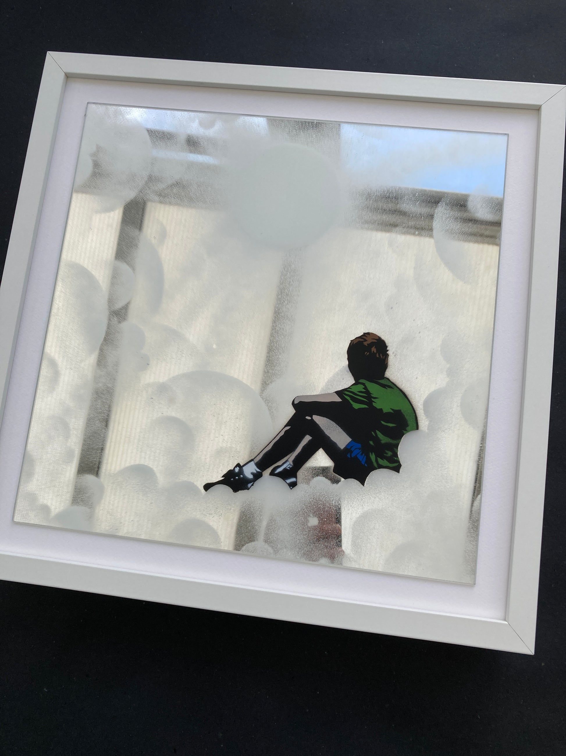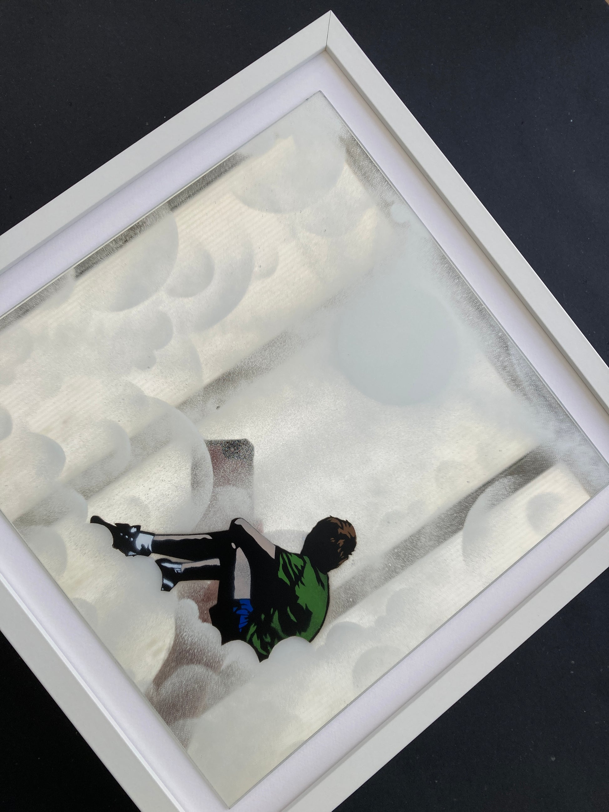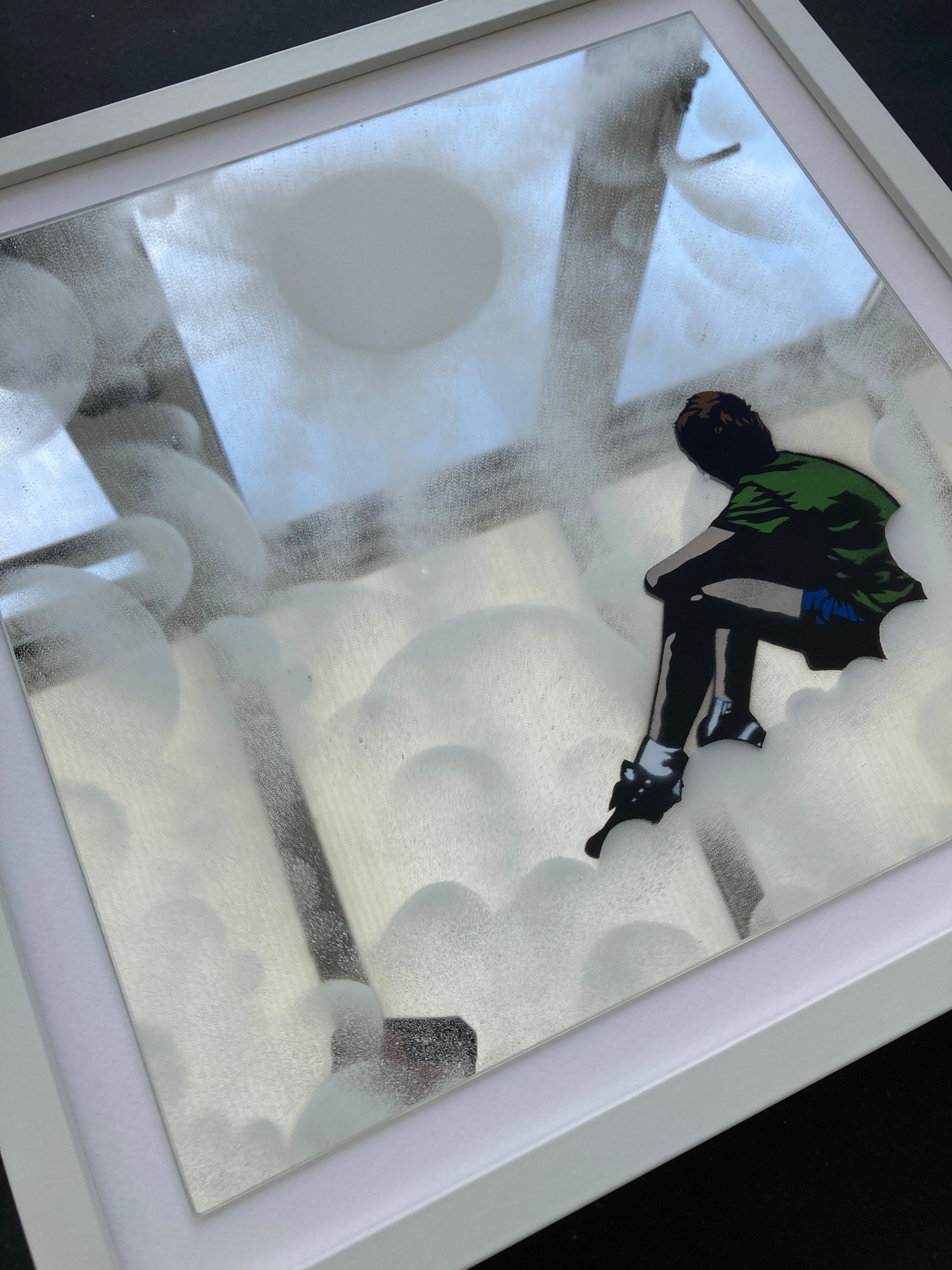 7 farger spraymaling og flerlags sjablong på glassspeil. Håndmalt med unike hvite UV-skyer. Håndsignert, datert og nummerert på baksiden. Kommer med COA.