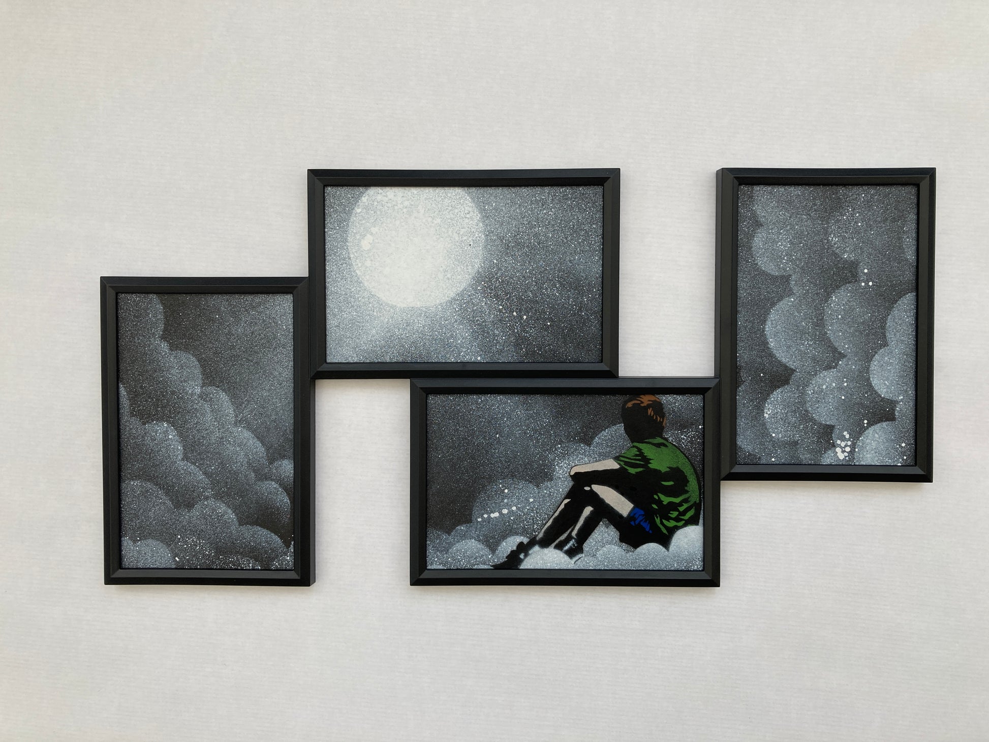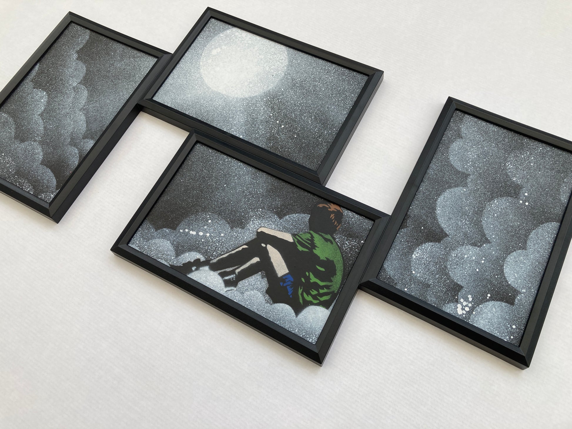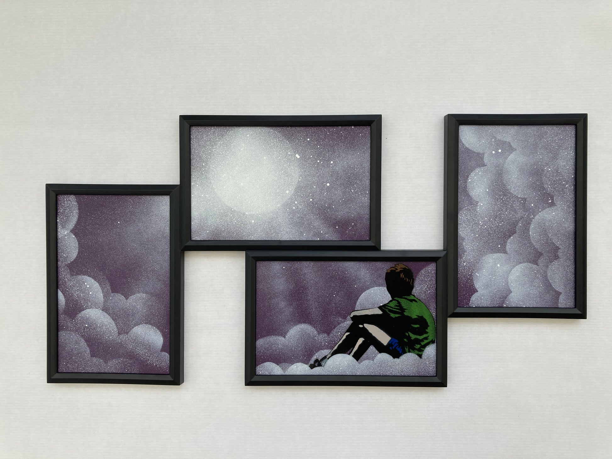 7/8 farge spraymaling og flerlags sjablong på 4 stykker papir montert i flereksponert plastramme. Håndmalt med unike hvite UV-skyer.