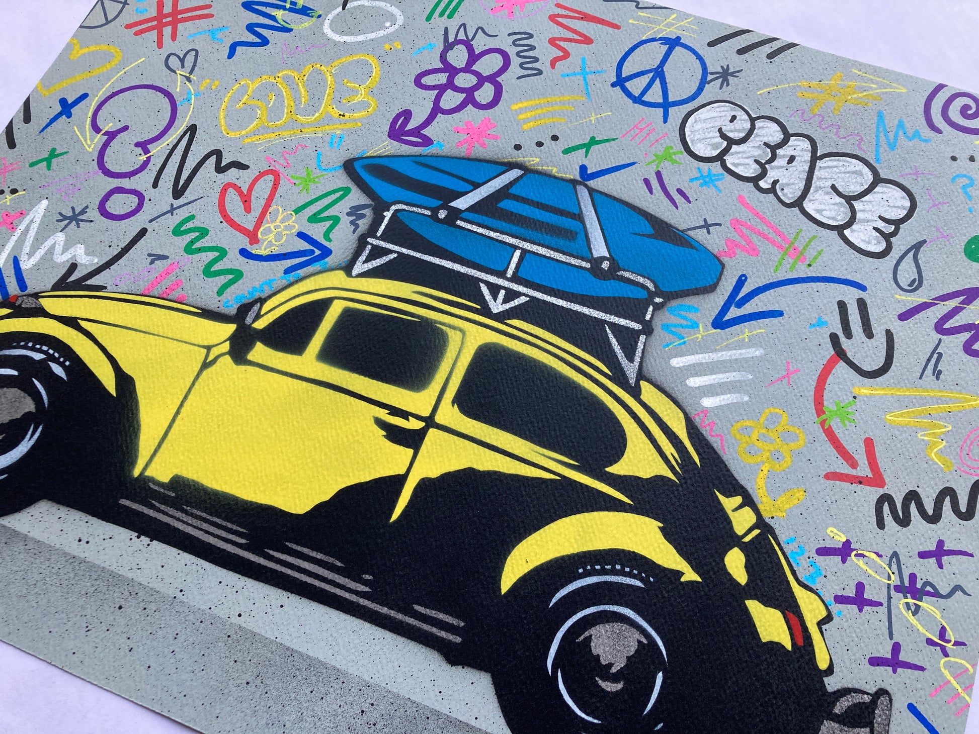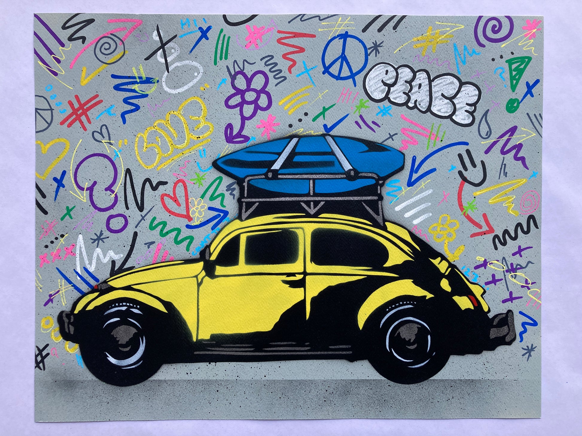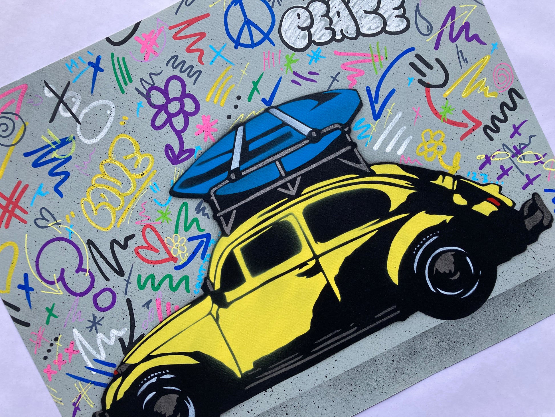Beskrivelse – 11 farger sjablong og spraymaling på papir. Hver hånd malt med en unik splatter-virvel - Signert, datert og nummerert på baksiden. Kommer med COA.