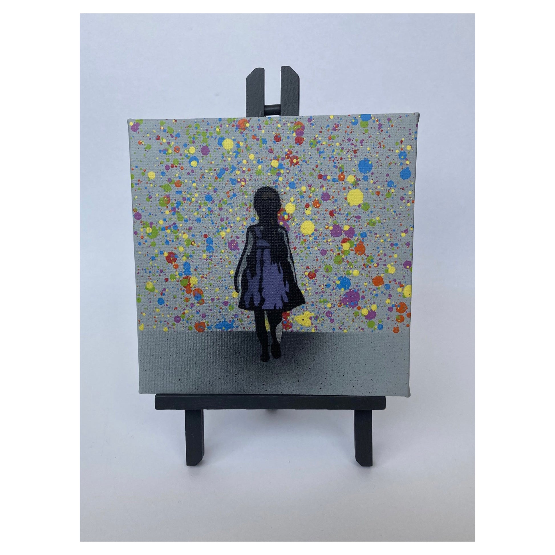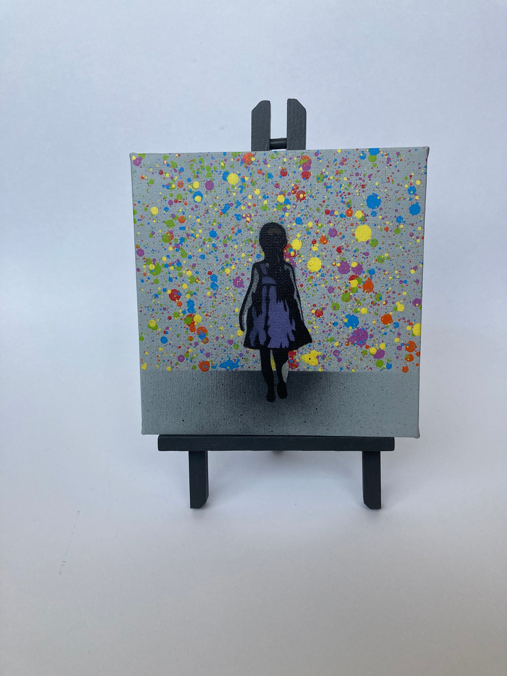 Vegggrå bakgrunn, lavendelkjole med regnbuesprut.