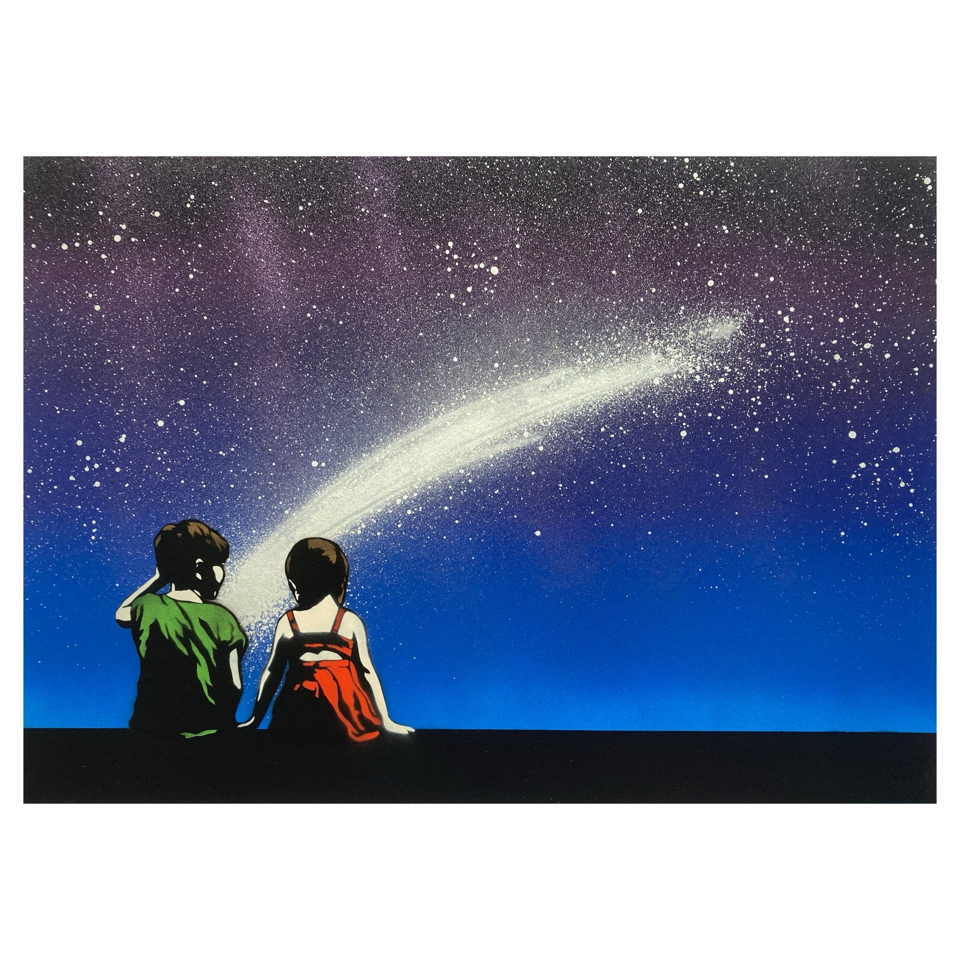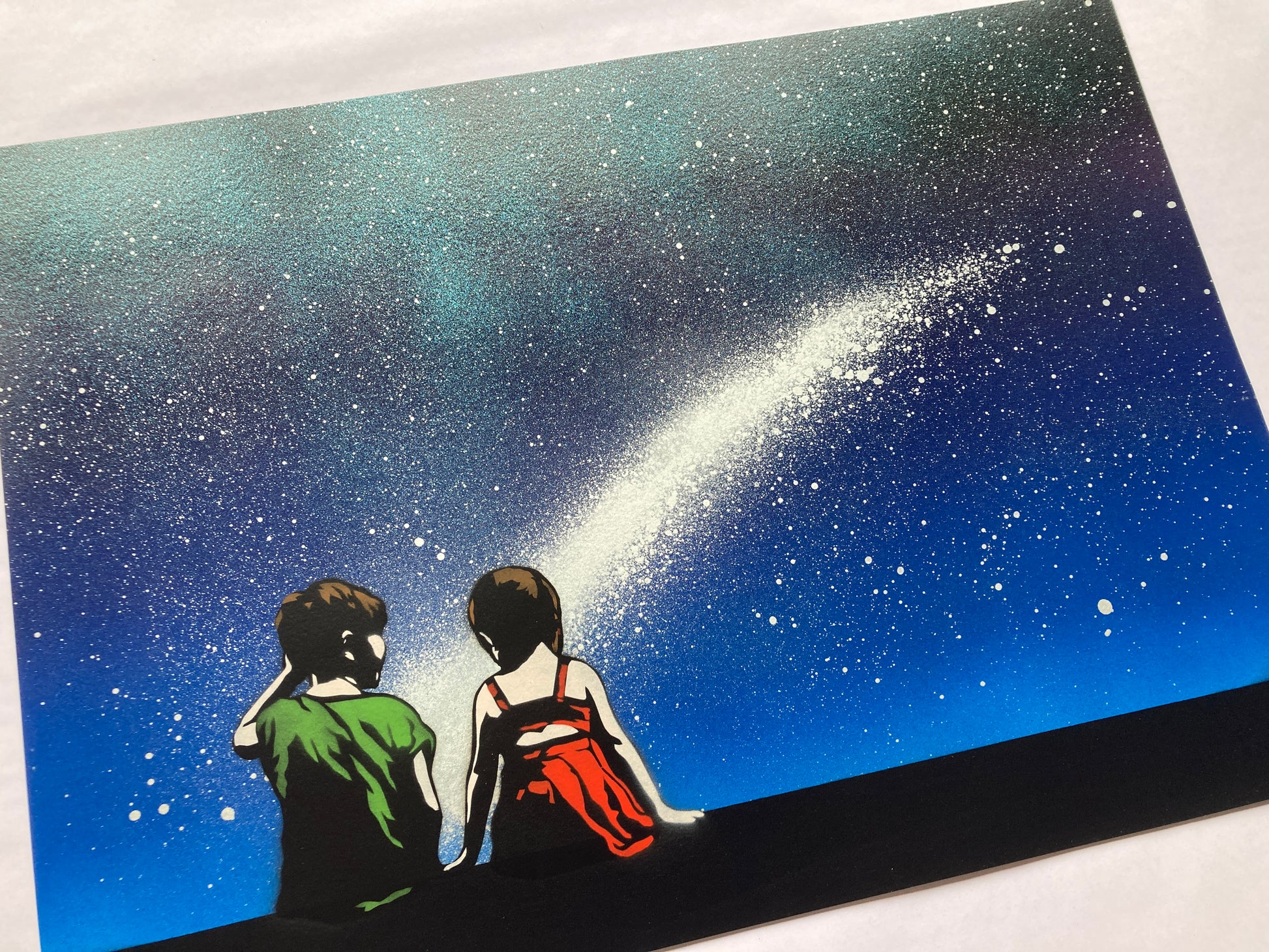 Beskrivelse – 11 farger sjablong og spraymaling på papir. Hver hånd malt med en unik splatter-virvel - Signert, datert og nummerert på baksiden. Kommer med COA.